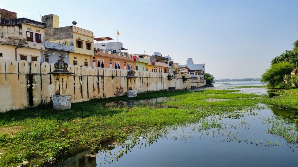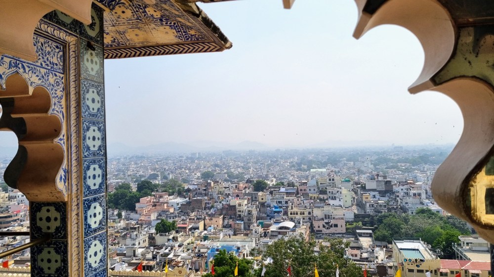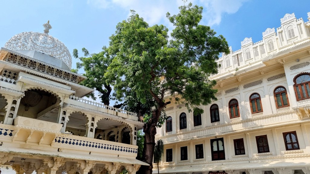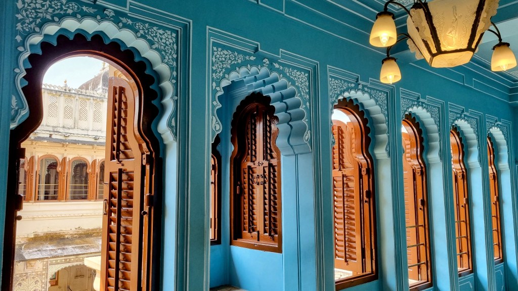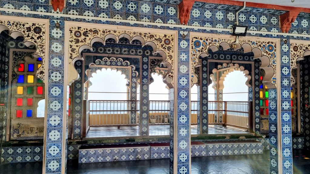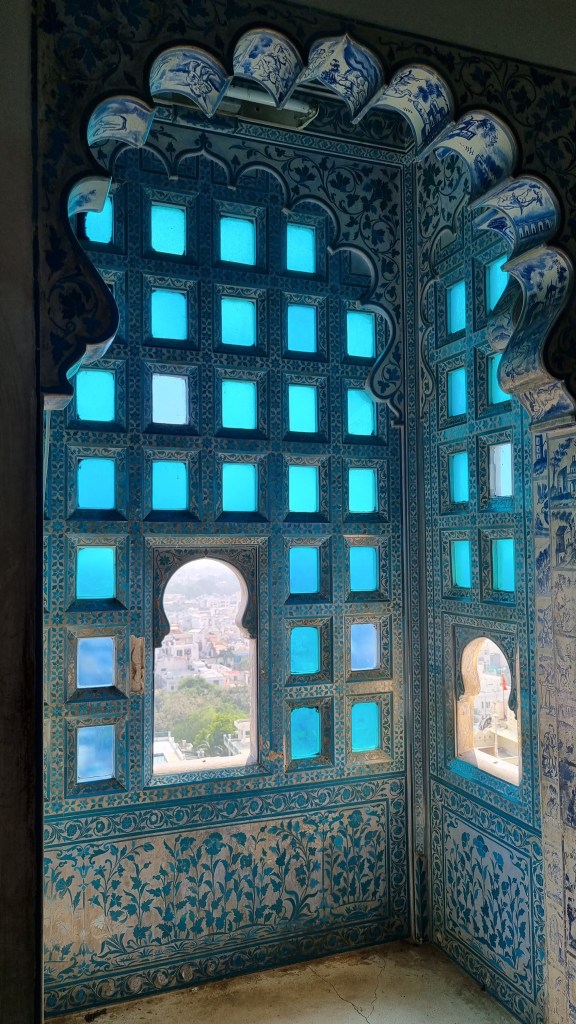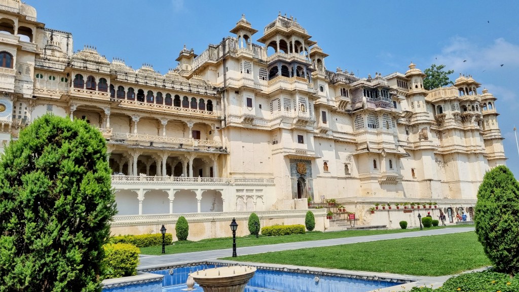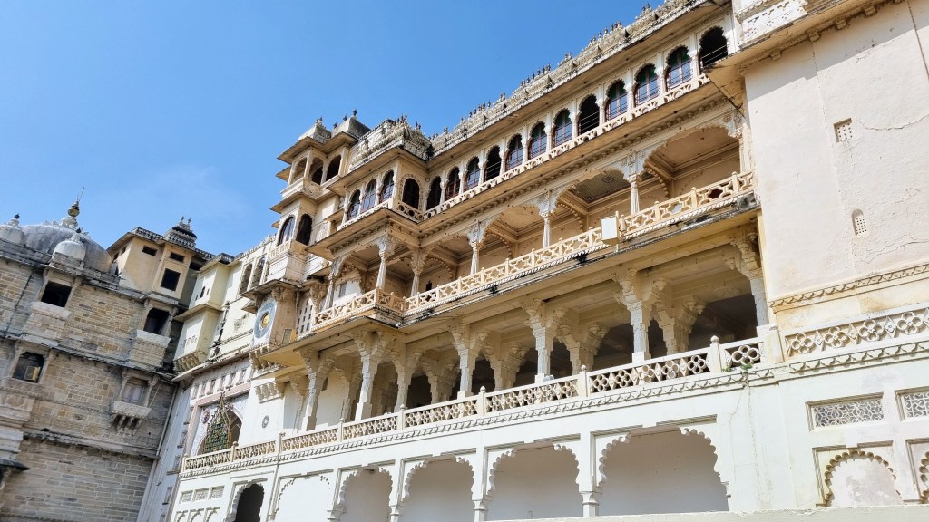 Le palais de la ville, comme souvent, a été édifié et enrichi au fil des siècles et si son aspect architectural extérieur est cohérent, il dévoile à l’intérieur, un véritable labyrinthe reliant différents petits palais. On passe d’un étage à l’autre par un jeu d’escaliers très étroits et un labyrinthe d’interminables couloirs tout aussi exigus débouchant sur des pièces à vivre ou des cours extérieures, qui font perdre tout sens de l’orientation au promeneur. La dynastie princière du Mewar trône au bord de l’eau dans un somptueux palais de marbre et de granit, aux tons crème et aux façades en dentelles. Des balcons, des pigeonniers pour demoiselles en soies et flanelles, des arcades accrochées aux murs, offrent de vastes panoramas et permettent de contempler d’un côté le lac, de l’autre la ville. On aperçoit, depuis certains de ces perchoirs, l’autre célèbre palais blanc du lac, l’ancien lieu de villégiature des souverains d’Udaipur, occupant entièrement une île, éclairant de ses reflets la surface de l’eau.