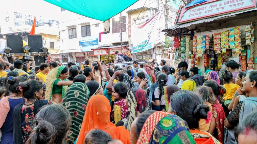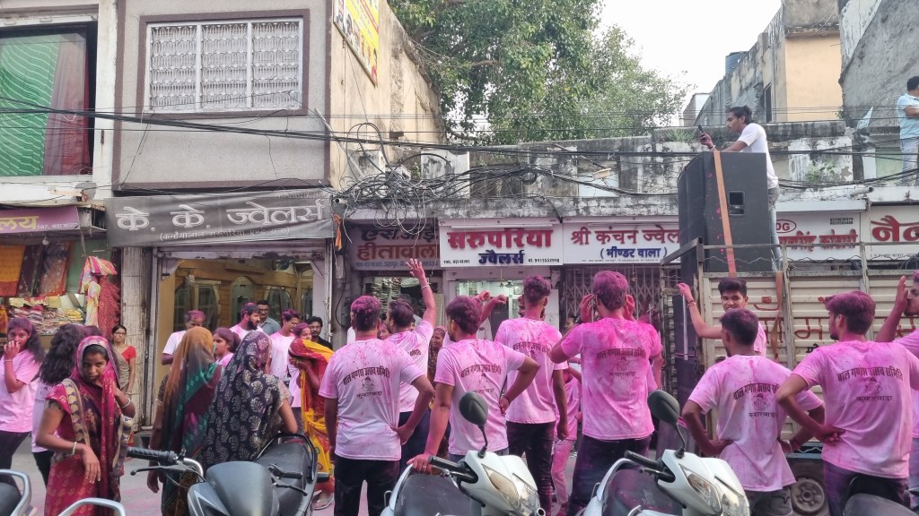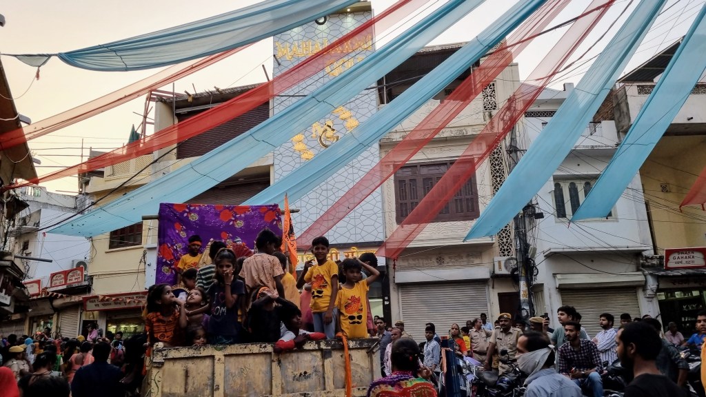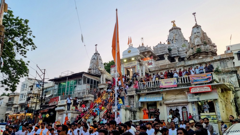 Ce soir, dernier jour d’une fête qui en dure dix, des défilés sont organisés dans les rues de Udaipur. Des tracteurs attelés de remorques décorées sillonnent la ville avec à leurs bords, des hauts parleurs du diable, comme ceux que les occidentaux cantonnent généralement dans les prés durant les festivals d’été. Derrière, une foule bigarrée bombardée à la poudre colorée, forme cortège et danse au rythme des boites à cracher du son. Nous nous trouverons par hasard et fort heureusement dans cette mêlée, contraint de suivre le flot dense de cette foule qui, les bras levés, ne faisait plus qu’un, derrière les tracteurs. Le sol tremblait et les vibrations nous remontait par les jambes tandis que le son tonitruant se chargeait de réduire en charpie les oreilles et la tête.