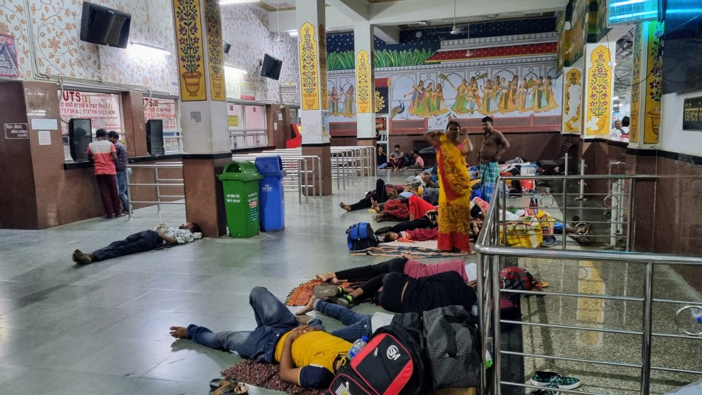 Le lendemain, dans la gare et aux abords aussi, on croise les gens en attente d’un train, assis sur les bancs, allongés au sol, sur les trottoirs, sur les comptoirs, achevant leurs nuits sous les néons blafards des bâtiments. C’est étrangement calme. En Inde tout absence de bruit est remarquable et rare. La gare est paisible quand il fait encore nuit à 4h00 le matin.