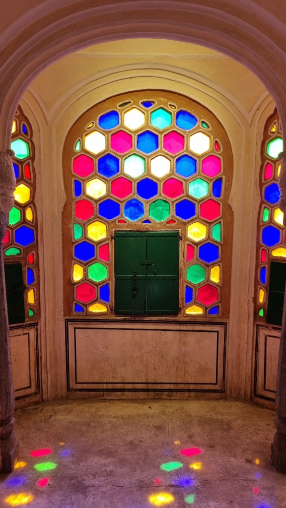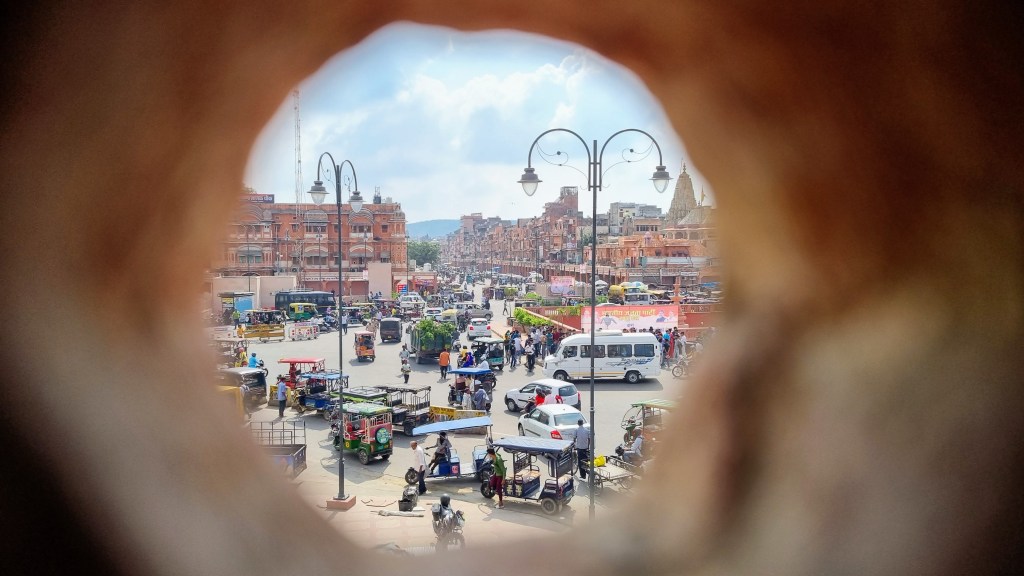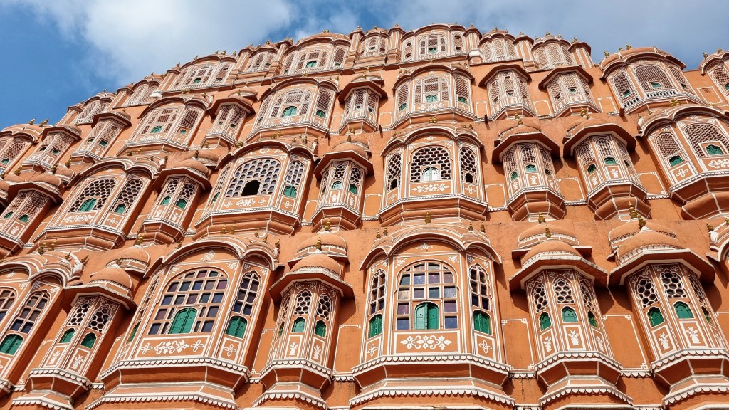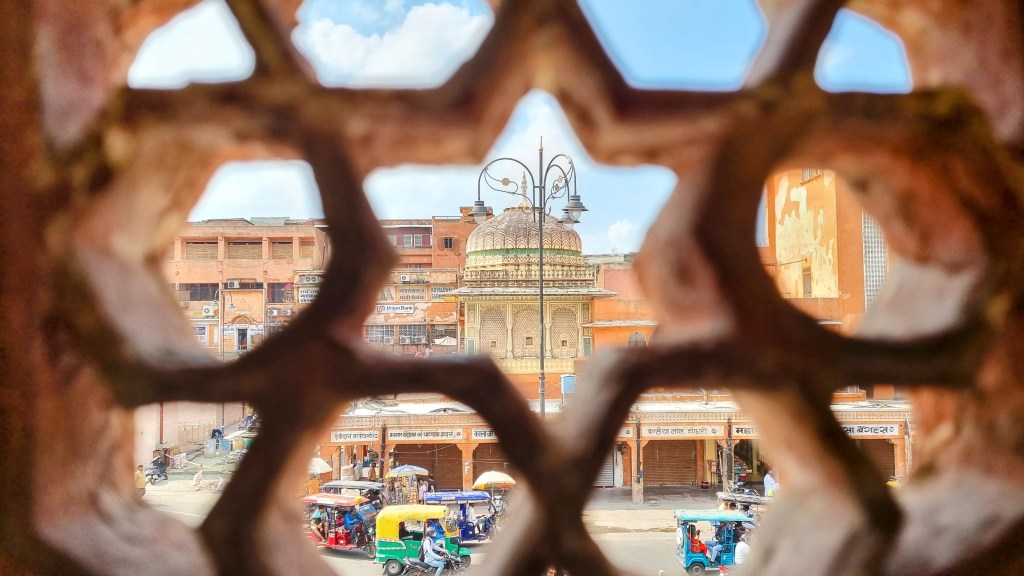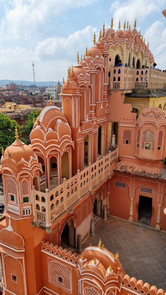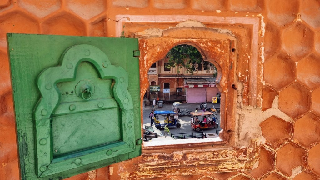 Le palais des vents est un drôle de bâtiment, célèbre pour sa façade rose originale. Construit à la fin du dix-huitième siècle dans le prolongement de celui du maharadjah de Jaipur, il possède pour principale caractéristique, une façade élevée sur cinq étages en nid d’abeille. Il était destiné aux femmes du harem qui n’avaient pas le droit de sortir dans la rue, selon les règles hindouistes du purdah qui empêche les hommes de voir les femmes. Le mur donnant sur l’extérieur est doté, dit-on, de près de mille petites fenêtres et claustras leurs permettant ainsi d’observer l’agitation de la vie citadine sans être remarquées. Ces ouvertures avaient pour autre effet bénéfique de diffuser dans le palais un air frais lorsque les températures y devenaient difficilement supportables. En se mettant à la place de ces femmes et en observant la rue, ainsi masqués, nous profitons effectivement des courants d’air frais projetés à travers les claustras. On les imagine y rester des heures à se rafraîchir tandis qu’elles rêvaient peut-être de se promener comme les hommes, libres dans la rue.