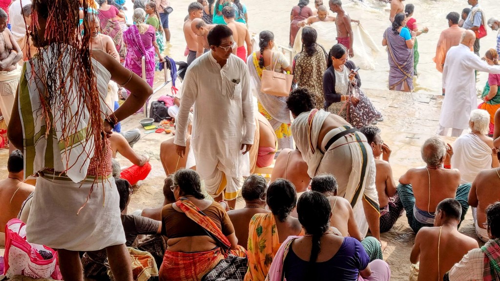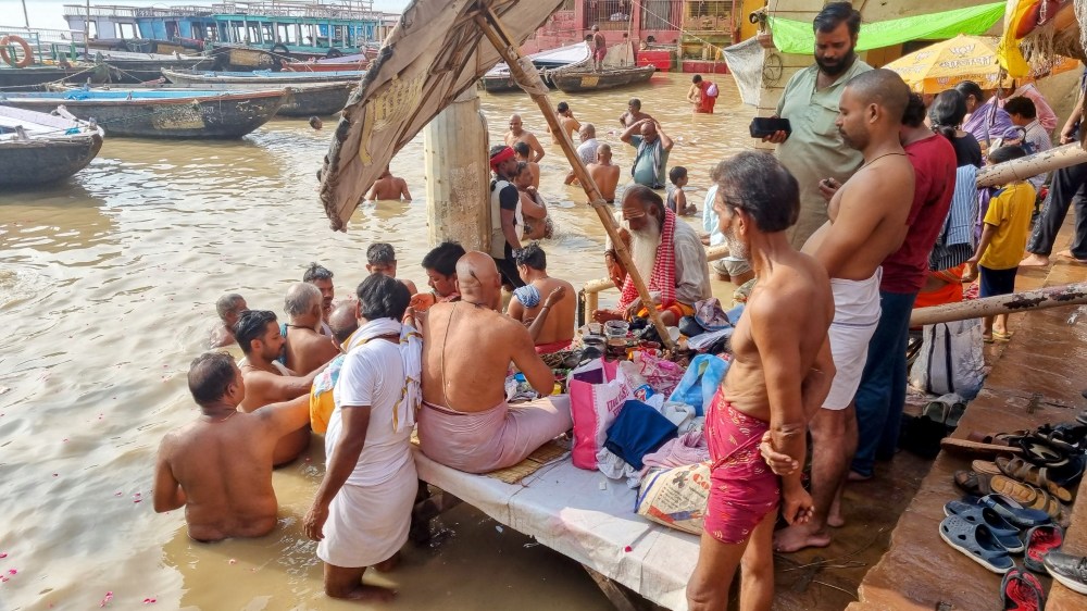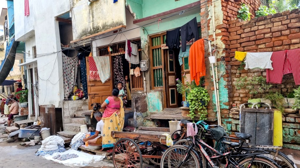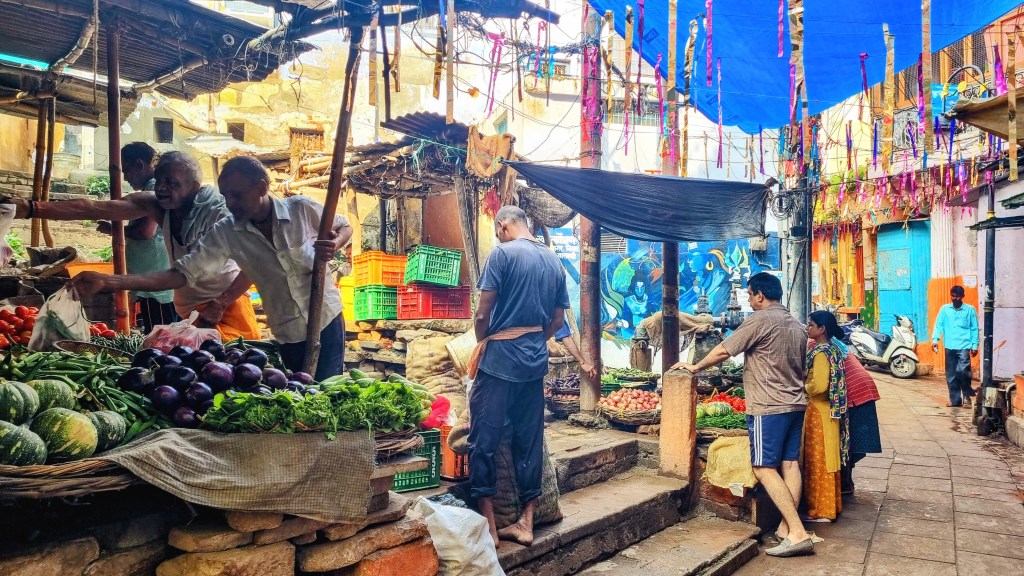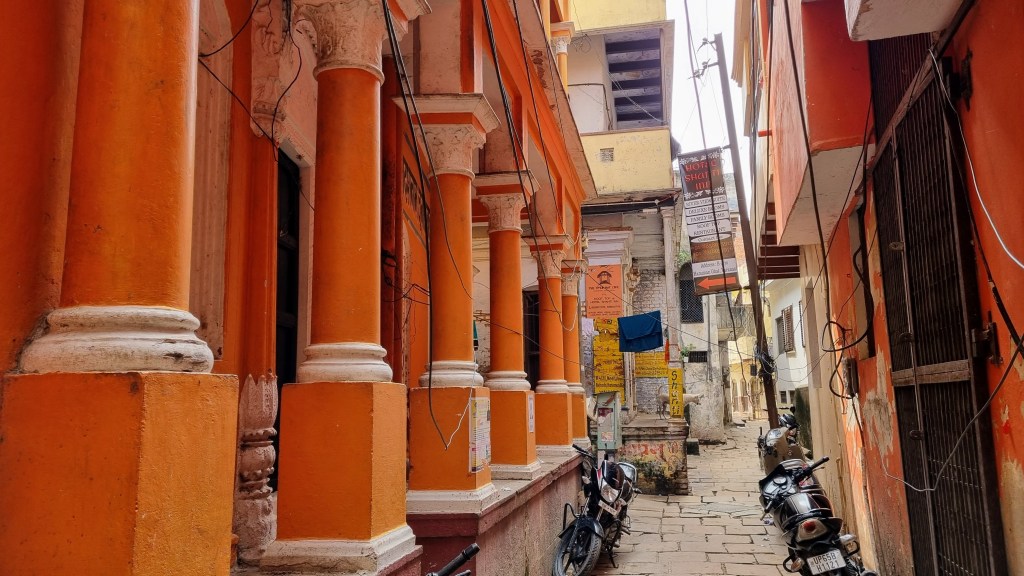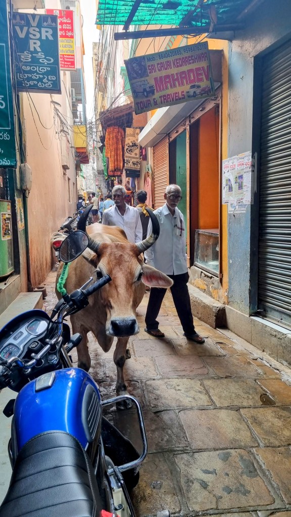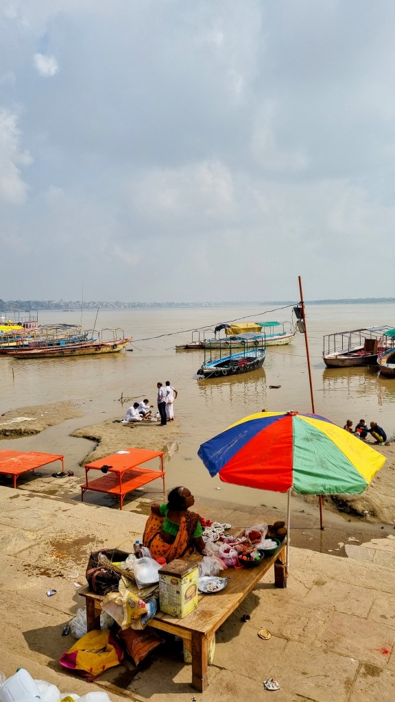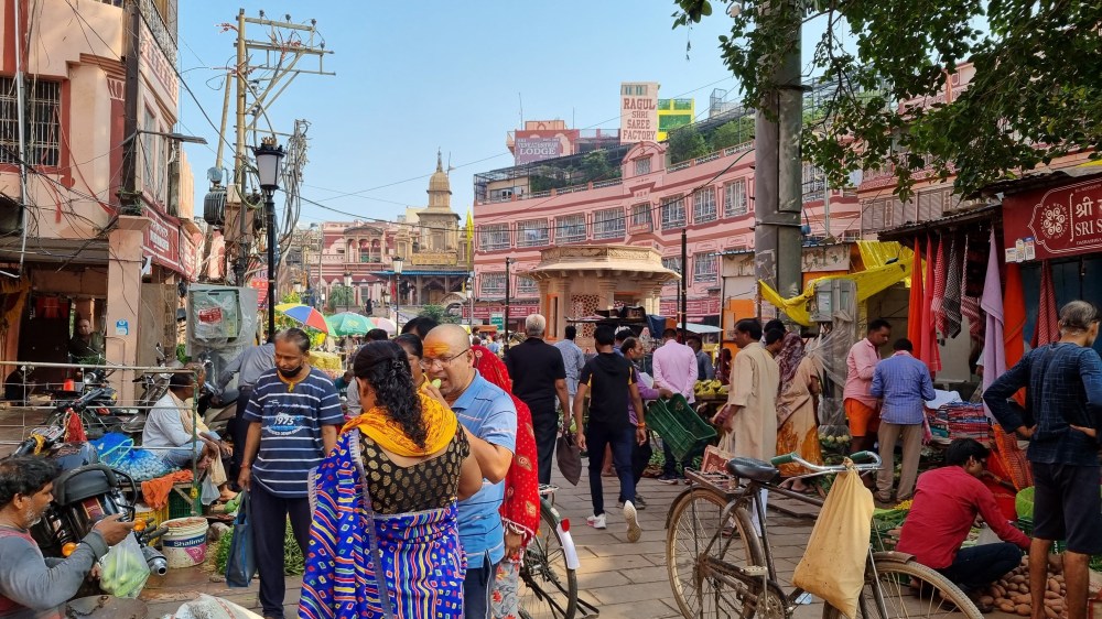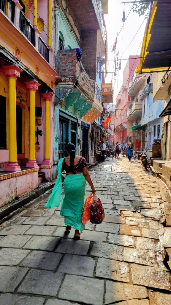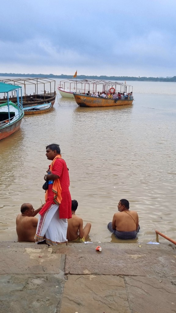Plus traditionnellement à Varanasi, on prie, on chante et l’on se baigne. Dans les rues étroites encore inanimées de la vieille cité, alors que les rideaux de fer des commerces sont encore baissés, tôt le matin, on croise déjà des habitants, un sac plastique à la main, se diriger pieds nus ou en sandales, vers un des quatre-vingt ghâts ouvrant la ville sur le fleuve.