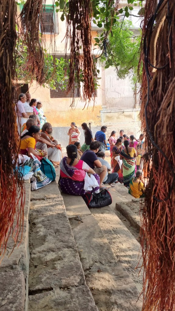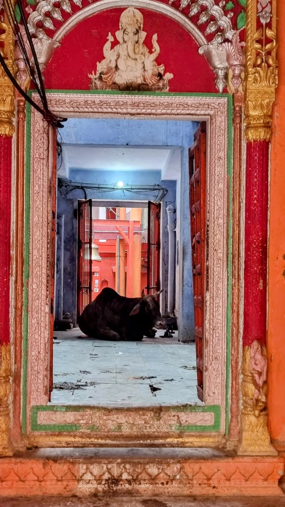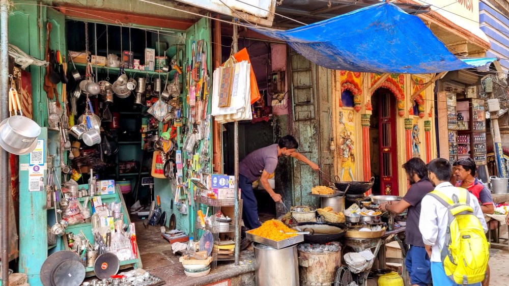Des commerces tout le long de la voie principale proposent objets religieux ou nourritures terrestres. On jongle entre les bassines bouillantes d’huiles de fritures et les cornes des vaches lascives circulant dans la mêlée. On évite les chiens affalés sur les pavés et les sadhus nomades au pieds nus, vagabonds célestes en quête d’une rencontre divine, tendant la main devant des pèlerins plongés dans les délices d’une foi qui, enfin, donne un début de sens à leurs présences sur cette drôle de terre.