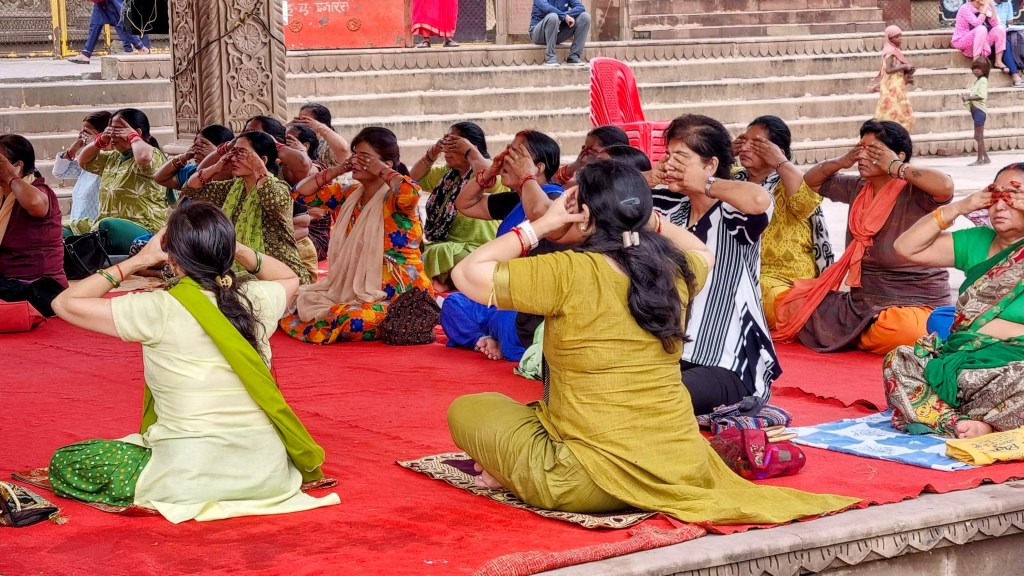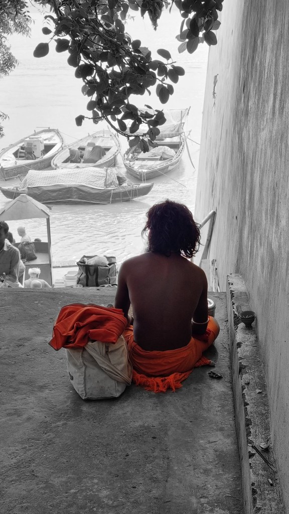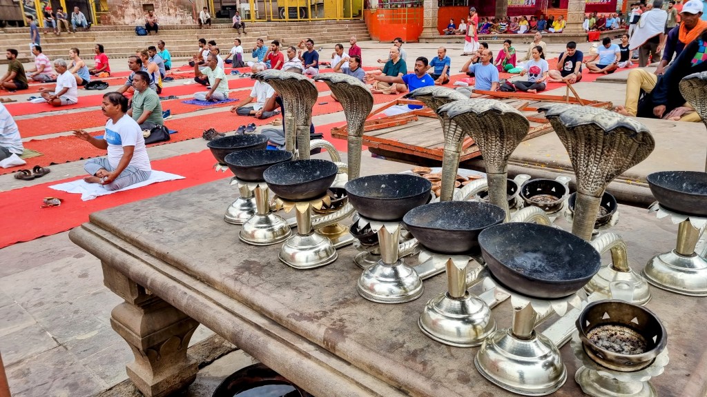 Le matin même, lors de ce rare moment de la journée où un semblant de fraîcheur planait encore sur la ville, habitants, touristes indiens ou pèlerins, s’installaient sur l’esplanade d’un ghât. Sous l’égide d’un maître de yoga, ces adeptes de la respiration libérée et du mouvement contrôlé prenaient position au sol afin d’éveiller les corps et les esprits devant un soleil naissant. Les clapotis du Gange, un cercle de feu à peine rouge dans le ciel, le souffle fluet d’une presque brise de mer sur les joues, justifiaient pleinement la présence de tout ce monde sur la rive du fleuve. Ouvrir les yeux. Se mettre en mouvement en plein air restera toujours la plus belle manière de prendre connaissance d’un monde qui nait.