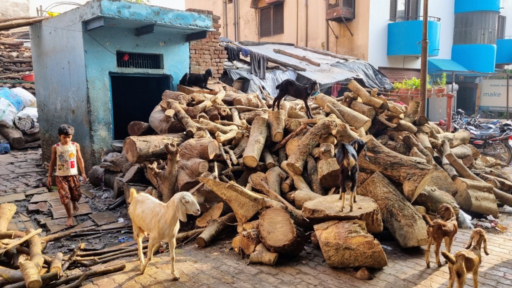 Car Varanasi ne sait pas s’arrêter de vivre, même à l’approche de la mort. Quelques rangées de marches plus loin, au nord, sur les marches de Manikarnika, on découvre les crémations en plein air. On reconnaît les ghats funéraires aux tas de bois entreposés dans les ruelles, dans les renfoncements des immeubles, avant d’atteindre le fleuve. Vendu à la pesée, il est admis qu’un bûcher nécessite deux cents kilos de bois.