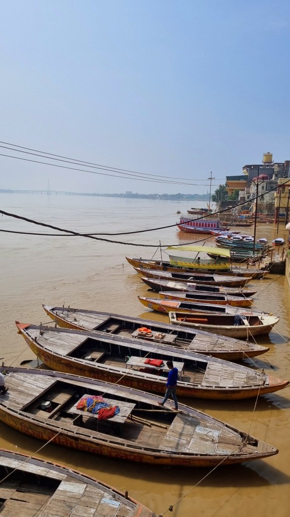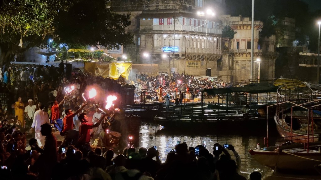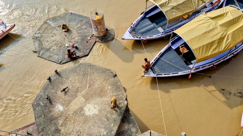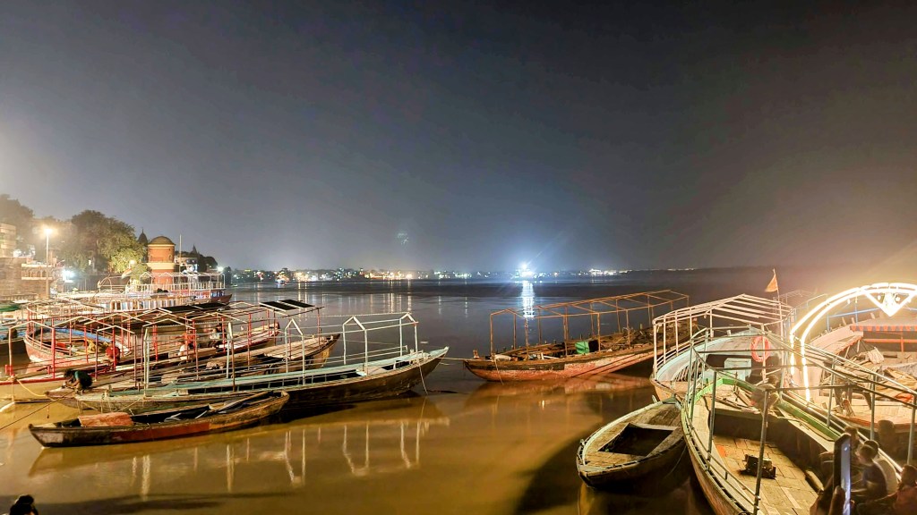 Quelques minuscules barquettes d’offrandes éclairées de camphre ou de ghee enflammés, déposées par les croyants avant la cérémonie, cherchent une issue entre les embarcations de bois du fleuve. Les barques clapotent et donnent du relief à une eau sombre filant en cette saison à vive allure. La journée, on observait le courant rapide qui emportait branches arrachées, déchets plastiques abandonnés et carcasse bientôt défaite d’une vache qui dût certainement composer avec un drôle de destin.