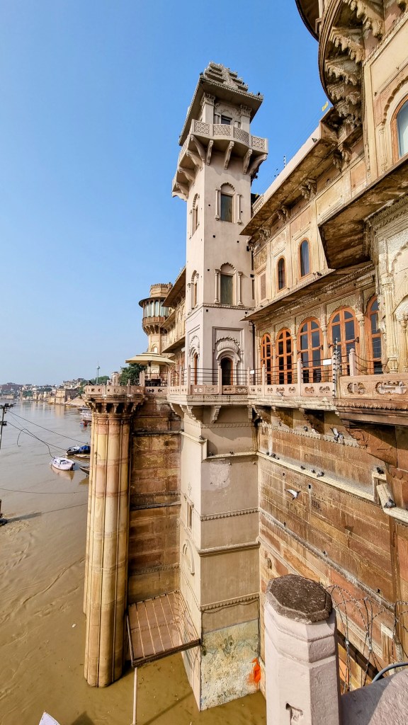 On écoute le chant d’un groupe de pèlerins rythmé par des mains usées, installé plus haut sur les gradins, rendant hommage à Shiva, à la lumière naissante ou bien à la déesse Ganga. On jette un œil sur les femmes en saris colorés également à moitié immergées dans l’eau, occupées comme les hommes aux ablutions matinales ou s’évertuant à rincer des vêtements gorgés de teintes jaunes, oranges, ensoleillées. Sur les esplanades, les balustrades ou les parapets des maisons, des singes espiègles savourent aussi le moment privilégié du réveil de Varanasi. On les suit se balançant aux fils déjà trop entremêlés de poteaux électriques trempant les pieds dans l’eau. On aime particulièrement les observer s’immobiliser subitement, toute affaire et jeux cessants, pour contempler, comme subjugués, le fleuve qui s’éveille. Comme les femmes et les hommes, sortant la tête de l’eau, les cheveux encore blanchis de savon, interrompant leurs activités pour seulement savourer l’instant. C’est fascinant de gestes simples, de longues pauses et de contemplations, de mouvements lents qui ne comptent pas sur le temps pour dicter les conduites.