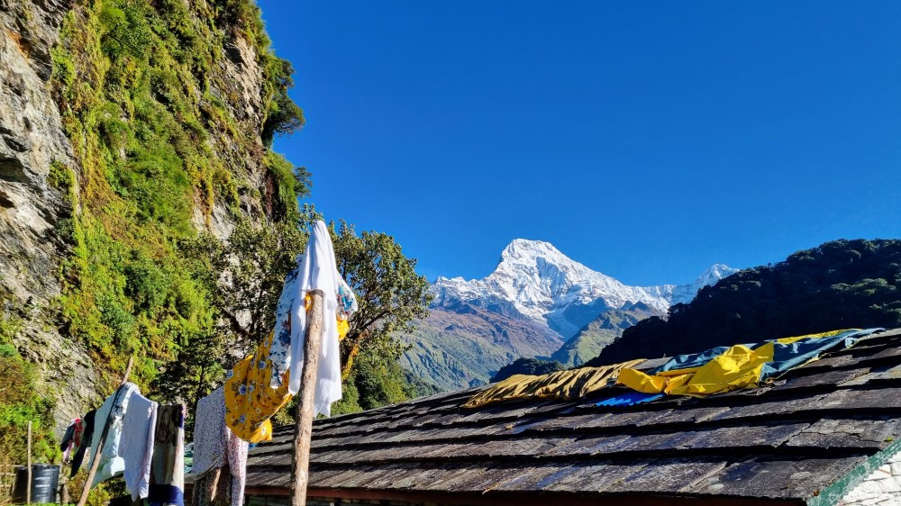 Nous nous retrouverons aux pieds de l’Annapurna I dont le sommet se confond aisément avec les nuages le noyant parfois. Il semble soudain si haut et massif, taillé à la mesure des dieux plutôt que celle des hommes. Le Machhapuchhre, montagne sacrée, interdite d’escalade, dresse aussi non loin de là, son pic enneigé en forme de fourche caractéristique. Les regards sont systématiquement aimantés par ces architectures de pierres. Elles imposent le silence et suscitent une admiration immédiate. On reprendra notre marche avec une pelletée de neiges éternelles dans les méandres de nos têtes.