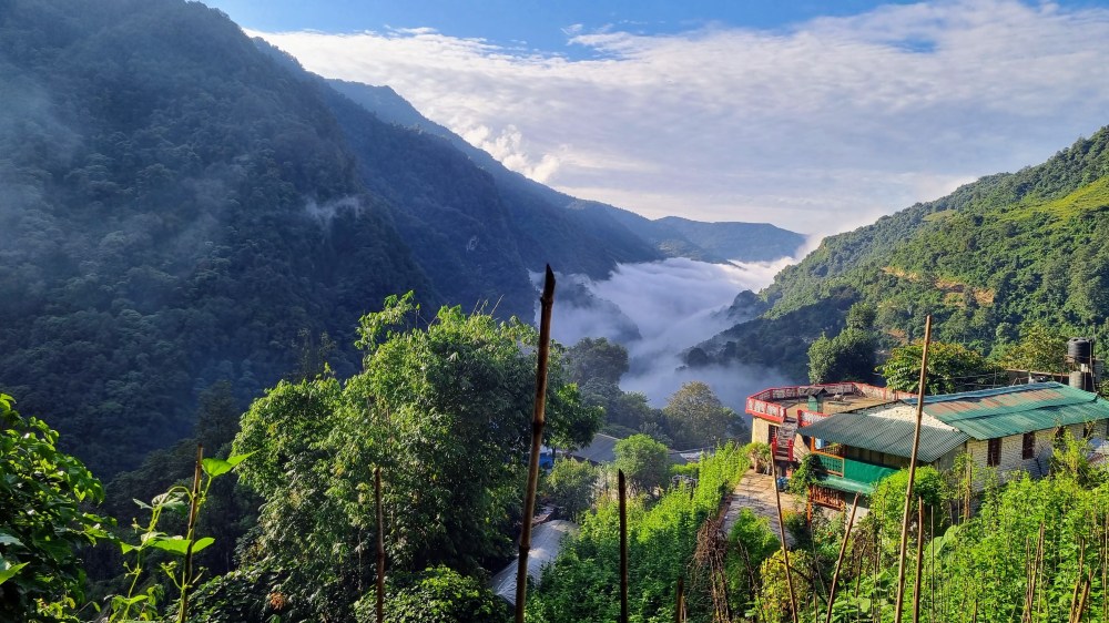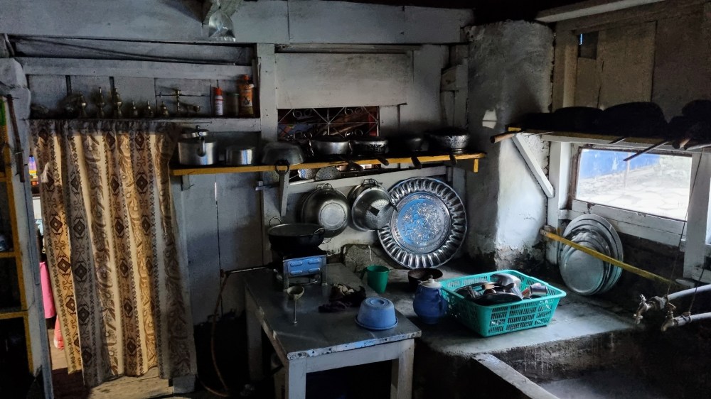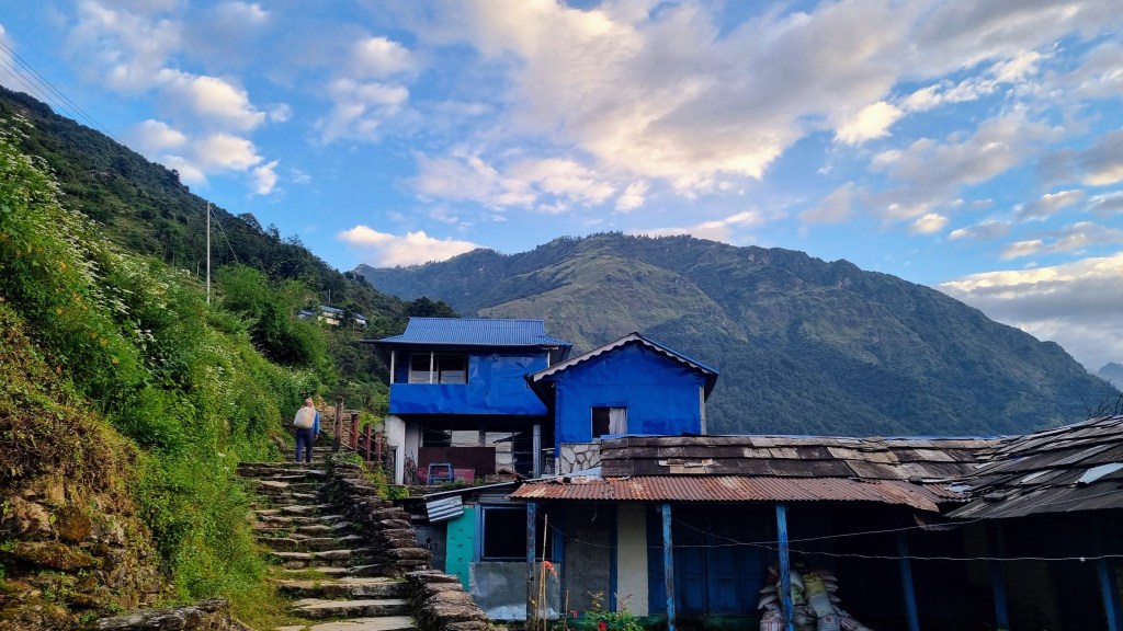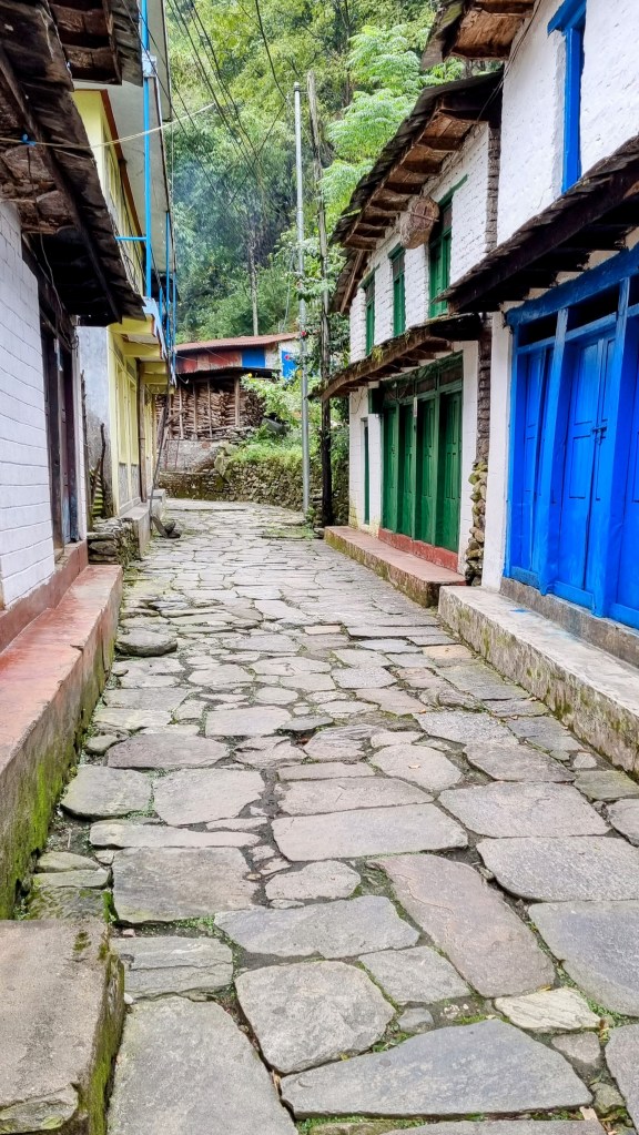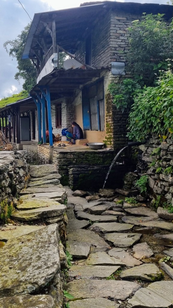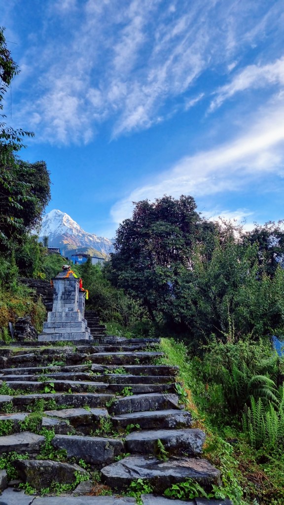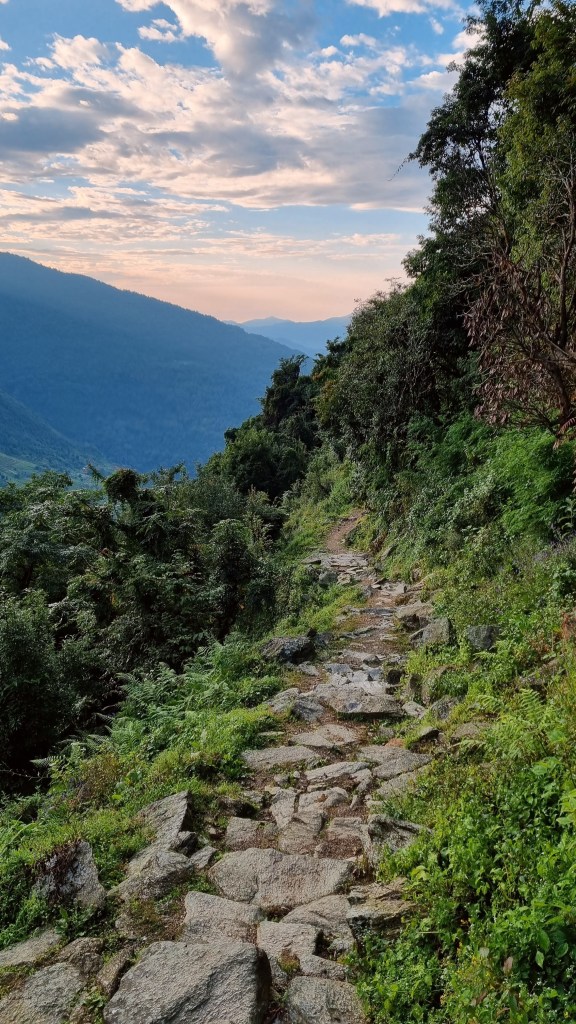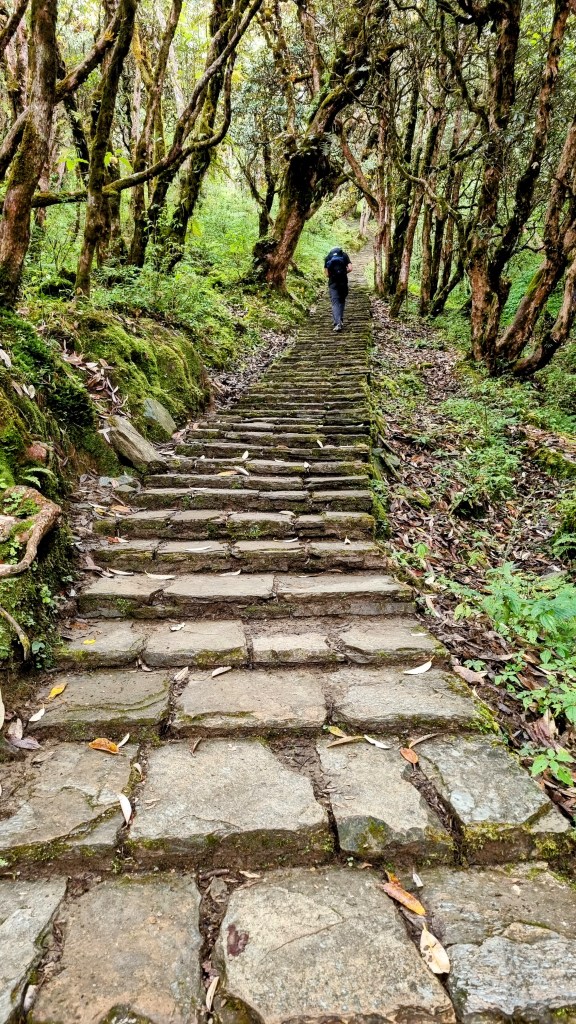 Les sentiers de ces contrées dévoilent un univers de marches de granit. Les villages des versants himalayens, isolés du reste du monde, y ont effectivement développé un impressionnant réseau de chemins afin de communiquer plus facilement entre eux. Des escaliers, de lourdes plaques de pierres grises taillées posées au sol, laissent ainsi ces tracés accessibles lors des intempéries et des mauvaises saisons. Les marches, extrêmement efficaces, sont néanmoins inégales et provoqueront quelques douleurs dans les cuisses à force de passer notre journée à monter les escaliers d’un immeuble sans fin.