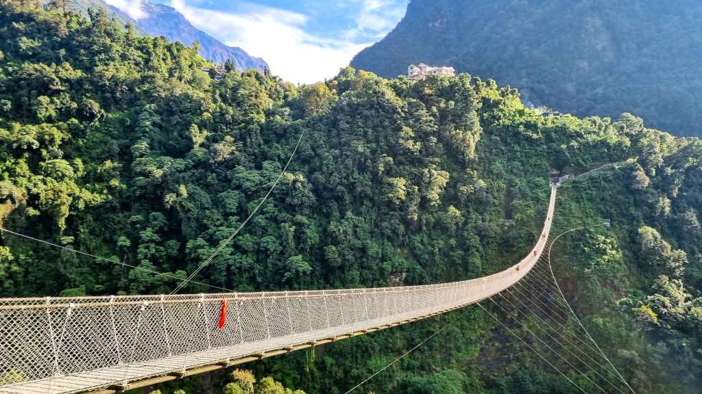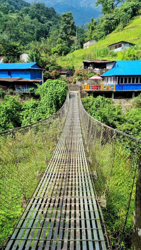 Nous passons d’une vallée à l’autre en traversant les hameaux, descendant jusqu’à un torrent fougueux pour le franchir sur un pont de singe suspendu qui tremble de toute sa charpente métallique lorsque nous l’empruntons. Puis nous remontons de la même hauteur qu’en face, par un sentier de boue encore humide de la dernière pluie, par un escalier de pierres obligeant à délivrer des enjambées de géants. Les maisons aux toits bleus sont nos repères minuscules dans un paysage gigantesque de forêts en pentes abruptes et de rizières électriques étagées.