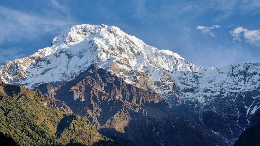 Les trois jours prévus se seront finalement transformés en cinq. On aura aimé nos descentes qui tapent les genoux, on aura adoré et puis maudit et puis adoré de nouveau nos quelques cinq mille mètres de dénivelés positifs parce qu’à chaque pas, on gagnait en souplesse, en respiration, on s’allégeait de sueur et de la pesanteur des vallées. Parce que chaque fois que l’on se tordait le cou pour contempler les sommets des Annapurnas, on se grisait d’une liberté inouïe.