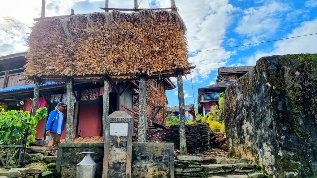 Plus on monte, plus la vallée se découvre dans ses teintes floues impressionnistes, dans ses courbes douces qui se dessinent entre les montagnes l’encerclant. Une rivière au milieu flanque un trait brun clair sur cette palette à dominante verte. Il faut deux heures de marche au rythme d’une promenade dominicale et cinq cent mètres de dénivelés pour franchir l’arche traditionnelle qui marque l’entrée du village Magar. Ces derniers représentent une ethnie minoritaire au Népal, pratiquant essentiellement l’agriculture et vivent, à Ramkot, paisiblement loin de l’agitation de la vallée.