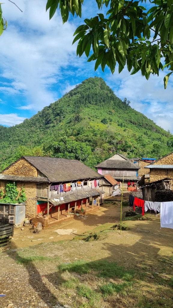 On n’entend plus ici les bruits citadins, le brouillon agité des rues trop denses de la ville. Les cris des enfants jouant sur une balançoire népalaise fabriquée à l’aide de bambous démesurés et installée au-dessus du chemin principal, les ont avantageusement remplacés. Des singes à proximité des maisons, s’accrochent aux branches des arbres voisins, nous observent un instant derrière la végétation et dans un bruit effrayant, s’élance au travers du feuillage dense vers un autre arbre, une autre conquête aérienne. Quelques poules et poussins nous suivent un instant en file indienne, des enfants s’ébrouent en déboulant d’un escalier et nous font face en riant, ralentissent soudainement en nous voyant, joignent les mains devant le visage en prononçant un Namasté joyeux et respectueux, puis reprennent leurs courses de plus belle en s’éparpillant dans les ruelles escarpées du village. Le silence retombera rapidement sur Ramkot, rendant au lieu, perdu dans les collines du Népal, ces airs de paradis perdus.