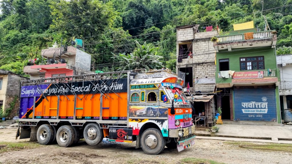 Nous venons de passer quelques jours dans ce petit village à mille mètres d’altitude qui surplombe la route principale reliant Pokhara à Katmandou. On avait lu que cette dernière était parfois présentée pompeusement sous la désignation « d’autoroute ». Il s’avère que cette voie qui relie les deux plus grandes villes du pays ressemble plus à une départementale en travaux par temps hivernal qu’à une quatre fois quatre voies asphaltée et dénuée de la moindre aspérité. La route longeait un cours d’eau en fond de vallée. Des files ininterrompues de véhicules automobiles, de deux roues boueux et de bus bondés tentaient tant bien que mal de se frayer un chemin sur une chaussée qui connaissait plus la terre et les trous abyssaux qu’un ruban de bitume sans histoire. Les pluies des derniers jours n’avaient évidemment pas arrangé la situation. Les cours d’eau enflaient dangereusement à vue d’œil et débordaient allègrement sur la route. Nous nous retrouvions ainsi bloqués plusieurs fois en compagnie de dizaines d’autres véhicules suite à des éboulis de terre et de gravas réduisant chaque fois sensiblement la largeur de la route.