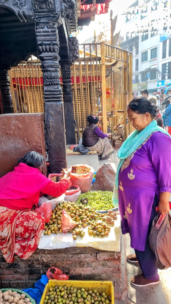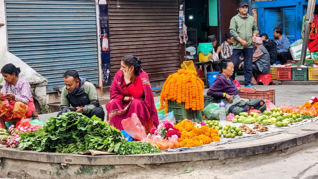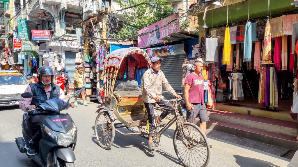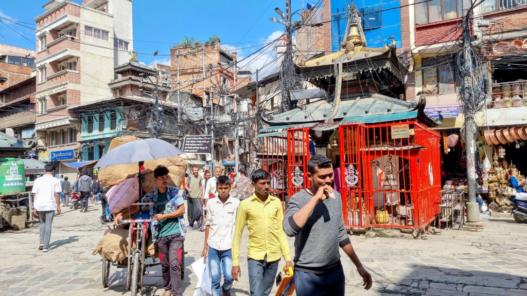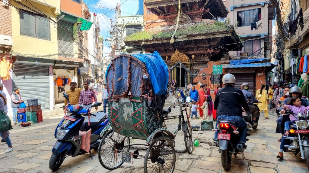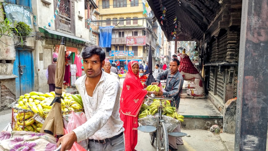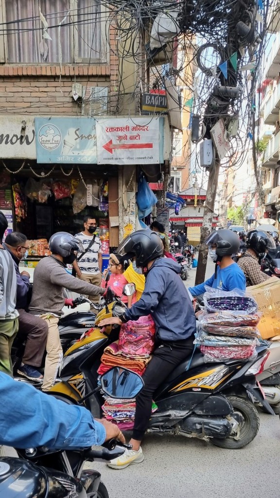 Une rue encore plus loin aligne les machines à coudre sur les pas de portes, occupées à contrefaire les derniers modèles des marques à la mode de vêtements. Ils seront quelques heures plus tard mis à la vente dans le quartier touristique de Thamel. Les scooters adroits filent entre les piétons nonchalants sans heurter un bras ni écraser un pied, malgré l’étroitesse des passes. La fluidité est de mise et on se glisse aisément, avec un plaisir certain dans cette vie citadine intense et brouillonne.