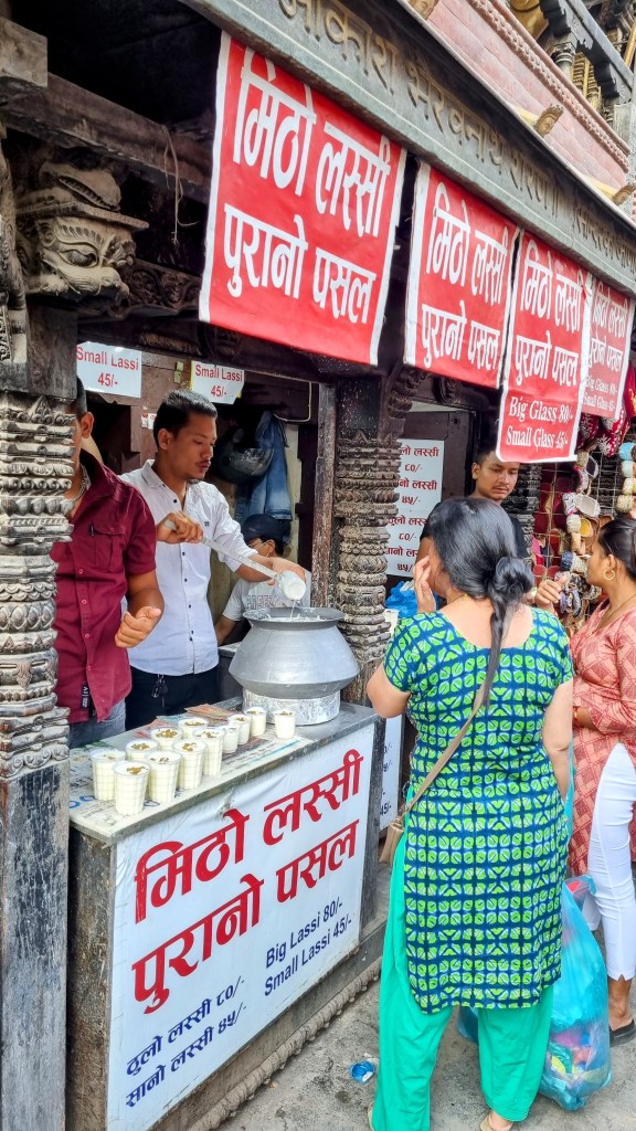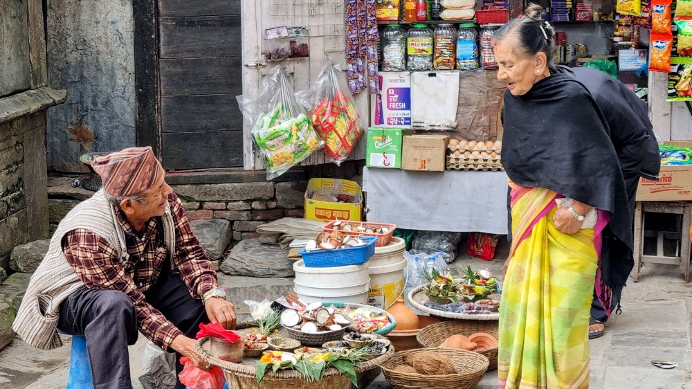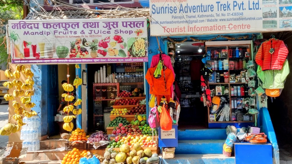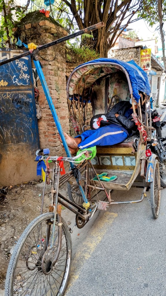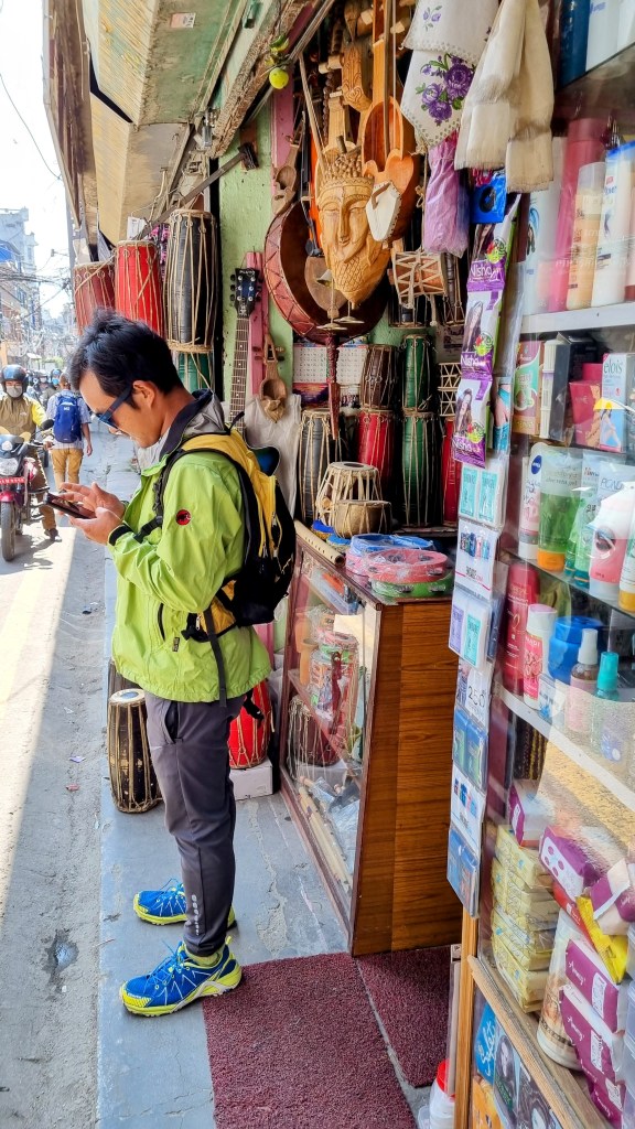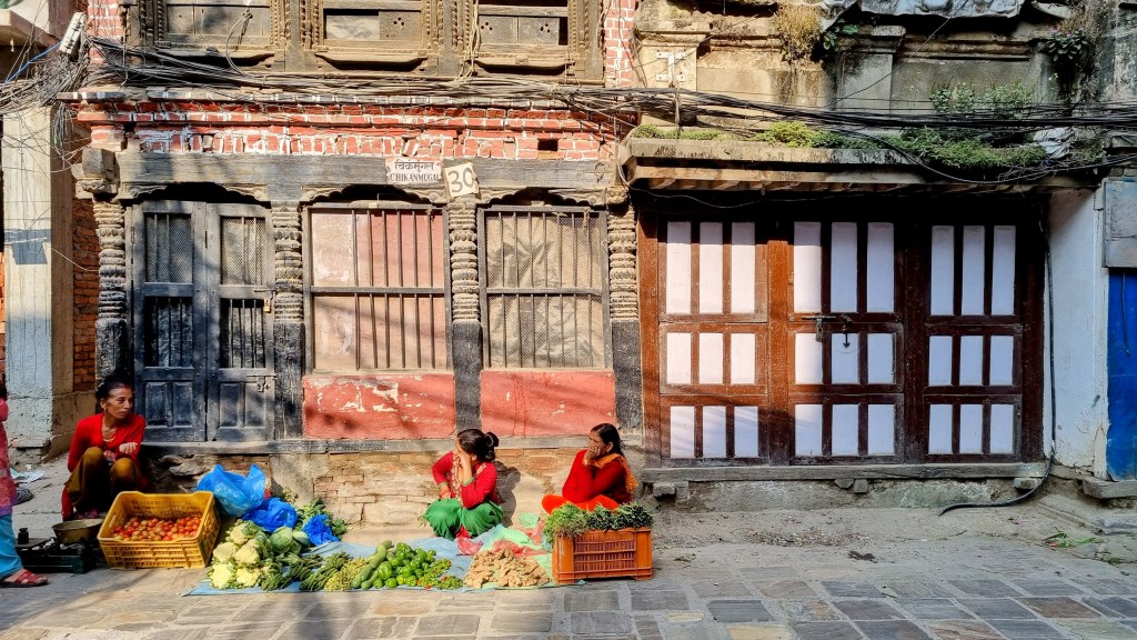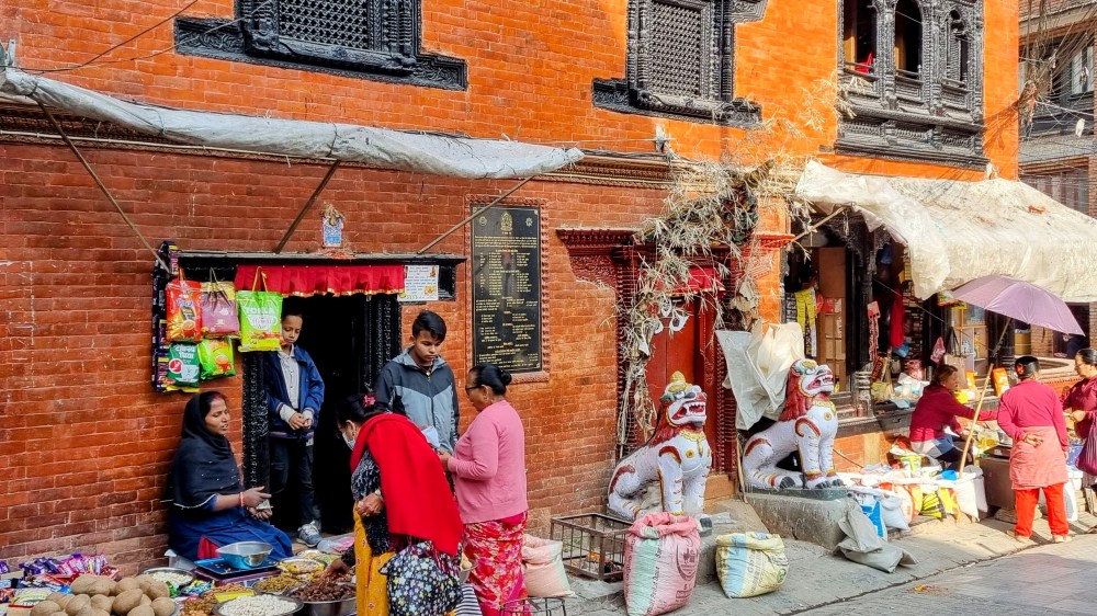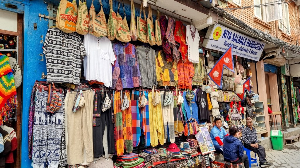 Une rue encore plus loin aligne les machines à coudre sur les pas de portes, occupées à contrefaire les derniers modèles des marques à la mode de vêtements. Ils seront quelques heures plus tard mis à la vente dans le quartier touristique de Thamel. Les scooters adroits filent entre les piétons nonchalants sans heurter un bras ni écraser un pied, malgré l’étroitesse des passes. La fluidité est de mise et on se glisse aisément, avec un plaisir certain dans cette vie citadine intense et brouillonne.