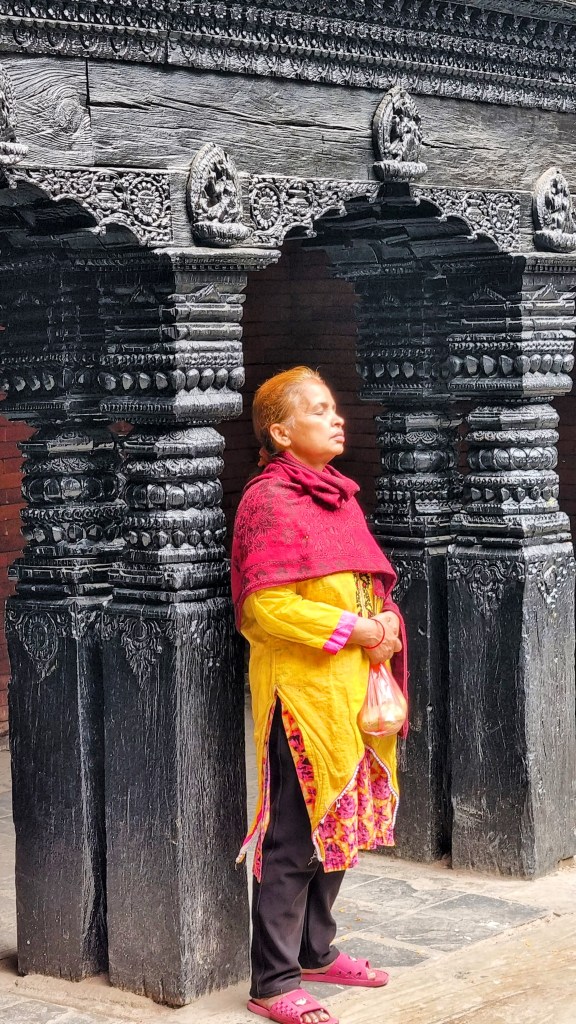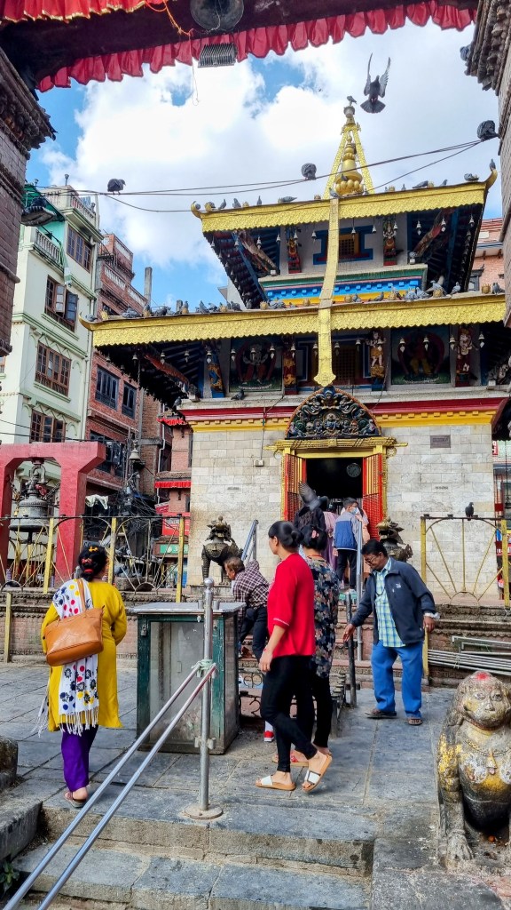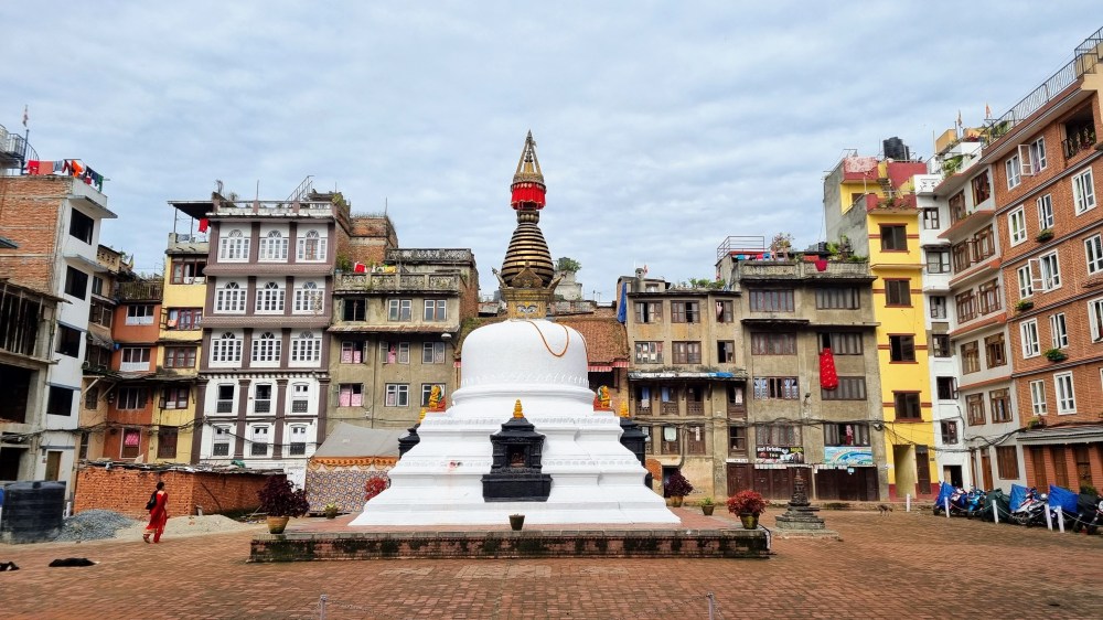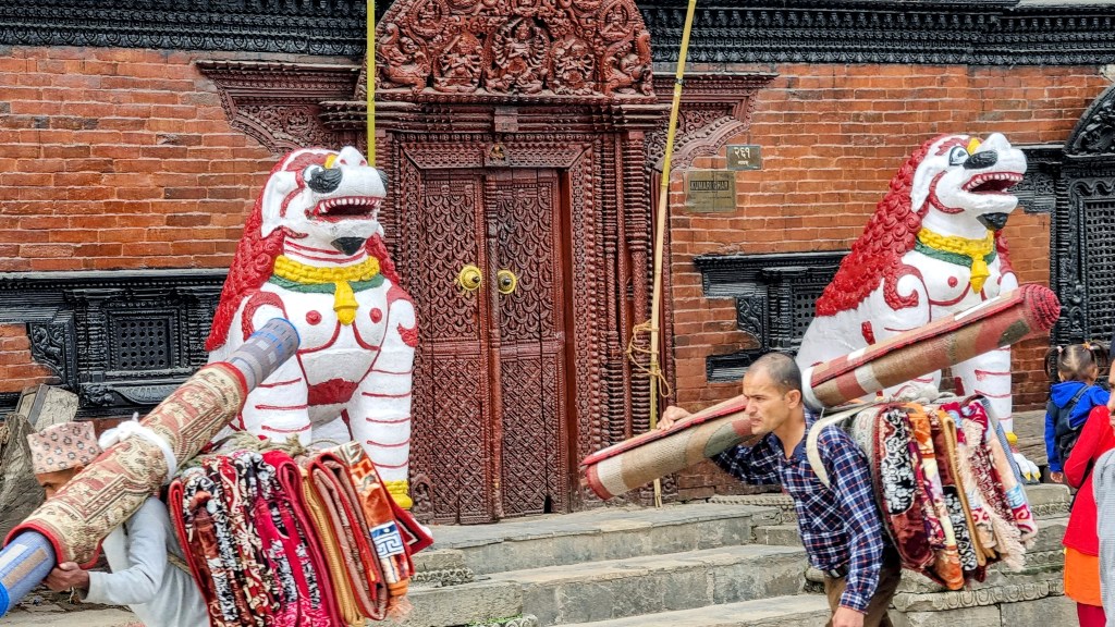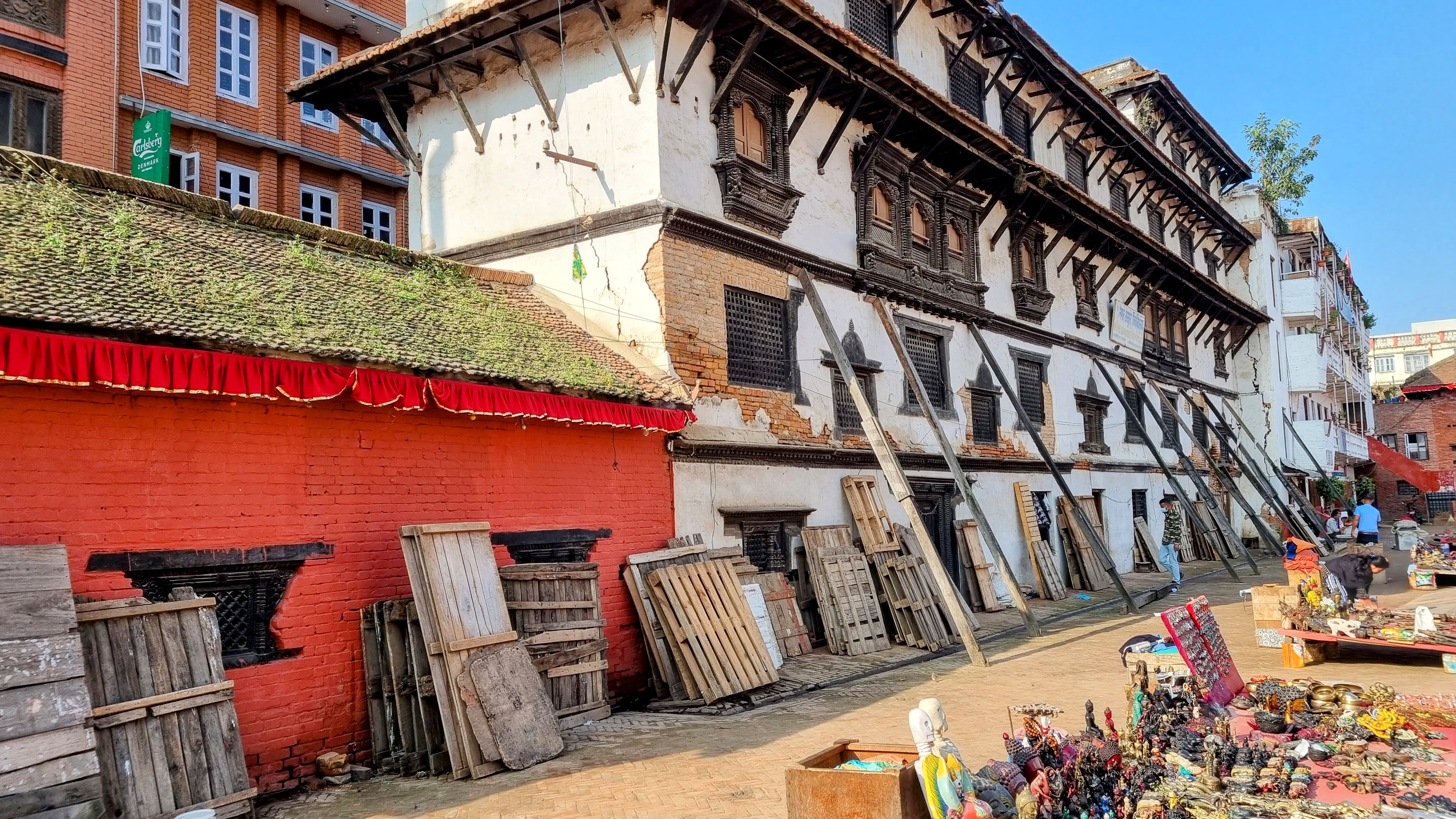 Durbar Square, est le centre historique de la ville. Lieu de passage inévitable, il rassemble l’essentiel des bâtiments historiques de la cité, bâtis par la dynastie Shah au dix-septième siècle. Au cœur de la capitale, on se retrouve sur la grande place rectangulaire au milieu des vendeurs ambulants de bijoux et d’objets archéologiques. Les façades des temples et immeubles, quand ils ne se sont pas effondrés lors du séisme de 2015, sont soutenus ad vitam æternam, par des étais en bois ou en métal fichés dans le sol et semblent pencher dangereusement vers l’avant.