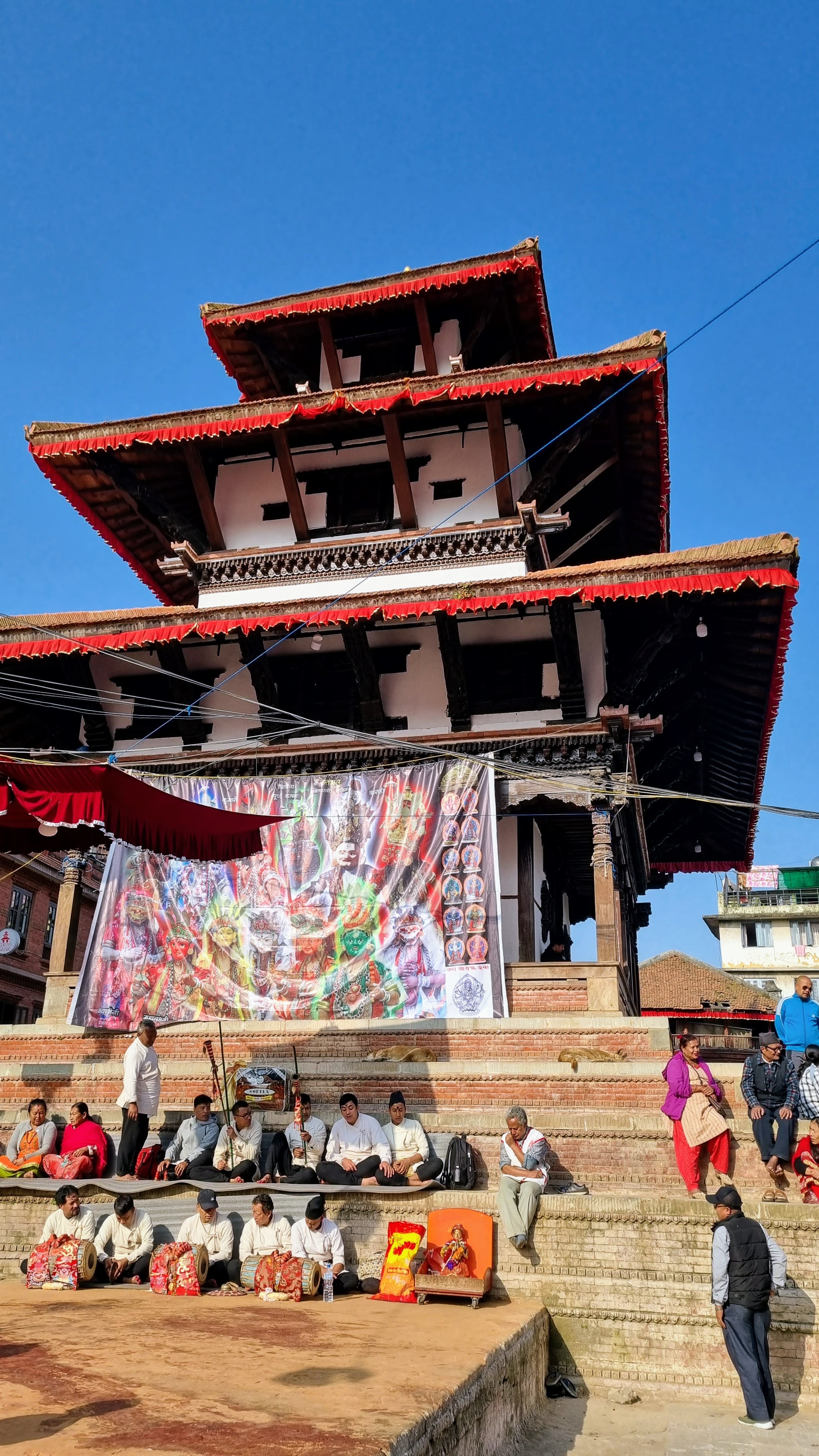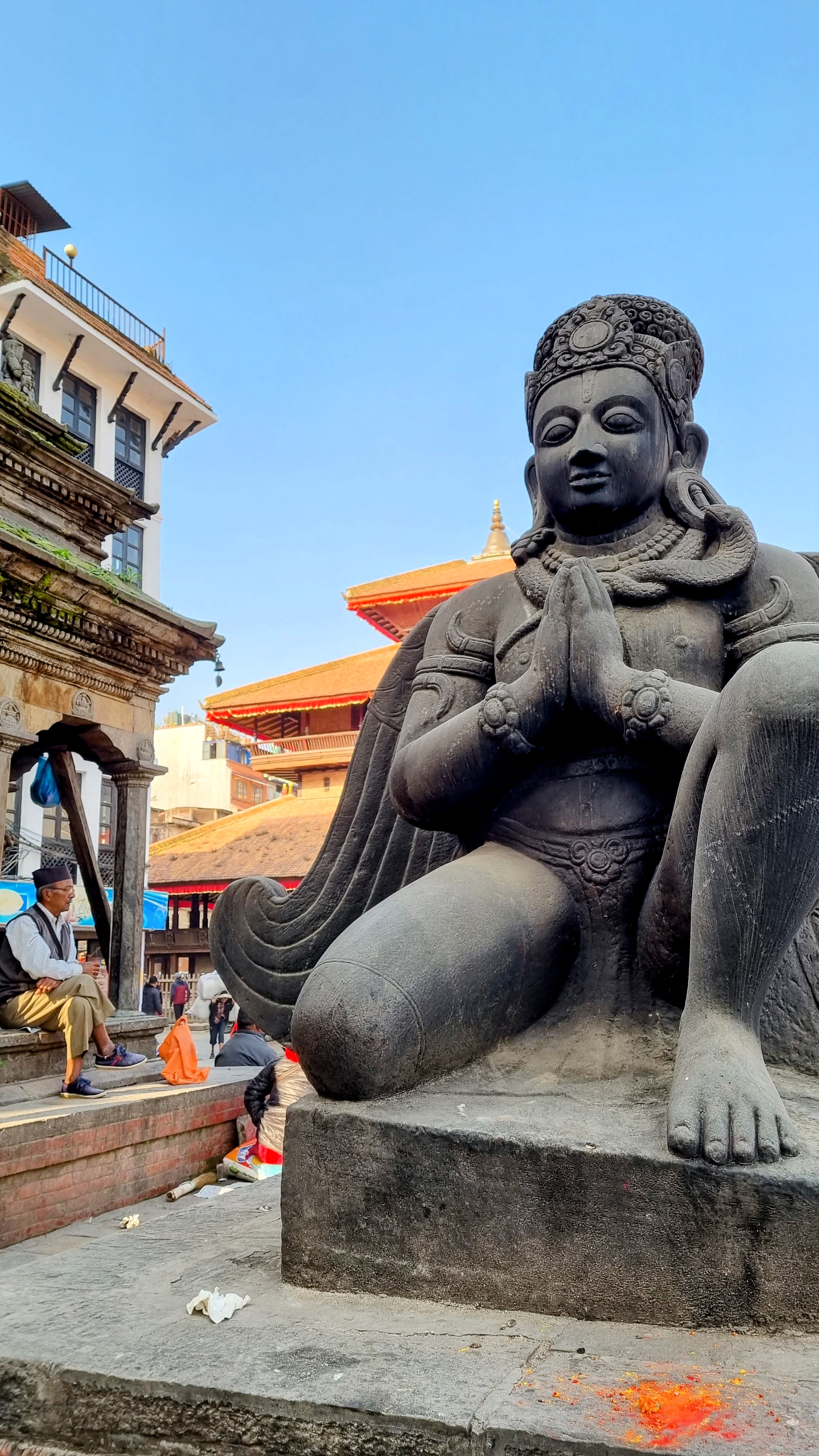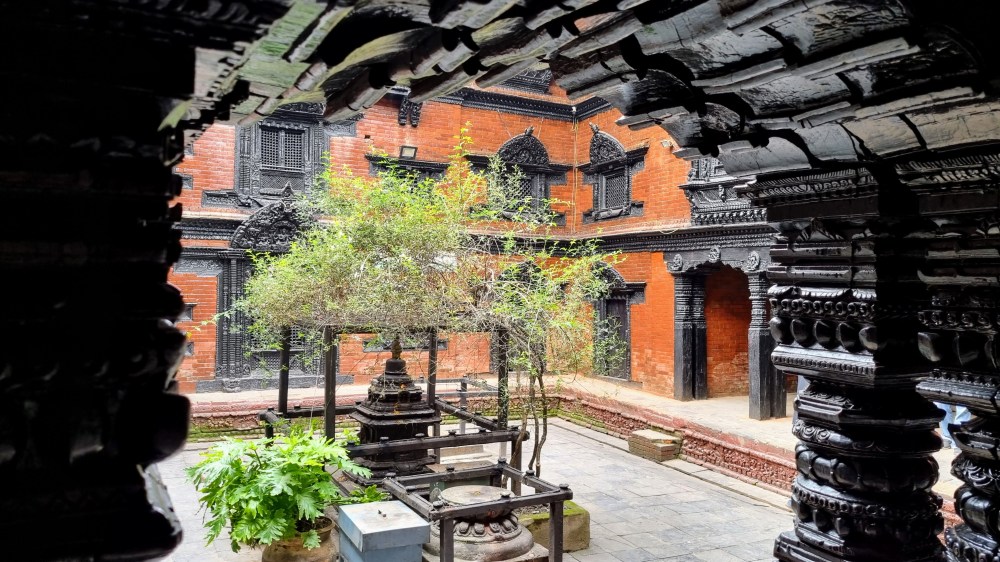 Durbar Square, est le centre historique de la ville. Lieu de passage inévitable, il rassemble l’essentiel des bâtiments historiques de la cité, bâtis par la dynastie Shah au dix-septième siècle. Au cœur de la capitale, on se retrouve sur la grande place rectangulaire au milieu des vendeurs ambulants de bijoux et d’objets archéologiques. Les façades des temples et immeubles, quand ils ne se sont pas effondrés lors du séisme de 2015, sont soutenus ad vitam æternam, par des étais en bois ou en métal fichés dans le sol et semblent pencher dangereusement vers l’avant.