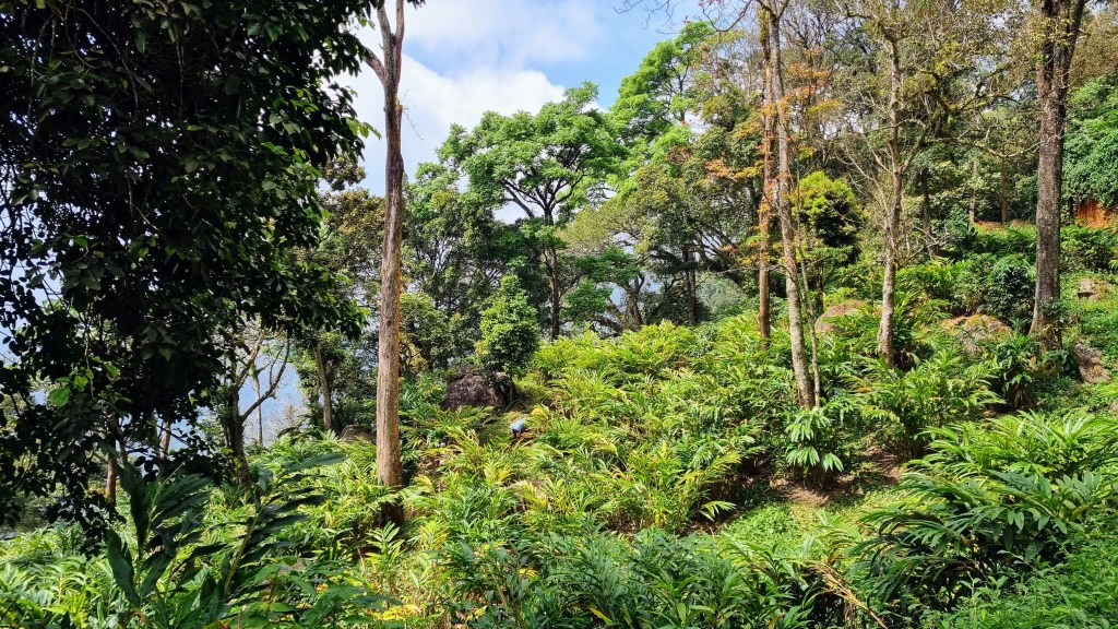 La difficulté réside dans le fait de pouvoir grimper à travers les théiers car tout est siglé « privé » et « interdit d’entrer » dans ce monde agricole qui n’aime pas partager. On trouve malgré tout en cherchant, têtus, un passage dérobé dans une partie escarpée non cultivée qui monte au sommet d’une des montagnes pointant au-dessus de nous. Sur une pente de broussailles plus hautes que nos têtes, il faut se hisser sur de gros rochers ronds et humides pour savoir si l’on progresse dans le bon sens, aveuglés par cette végétation exubérante. On regrette juste de ne pas s’être vêtu de manches longues afin d’éviter les coupures de fougères et de lianes effilées qui nous lacèrent les bras. A mi-chemin, ne voyant pas le bout de ce sillon ou plutôt nous imaginant aller très prochainement buter contre une falaise noire plaquée au-dessus de nous, on s’interroge sur la viabilité de l’ascension. Il faut deux secondes de plus pour conclure que ce n’est pas à la moitié de la route, même indécise, qu’il faut se demander si on doit faire demi-tour. On continue, en dérapant chacun son tour, sur une terre glaise damée et luisante, les bras levés au ciel pour ne pas finir cisaillé par les herbes acérées.