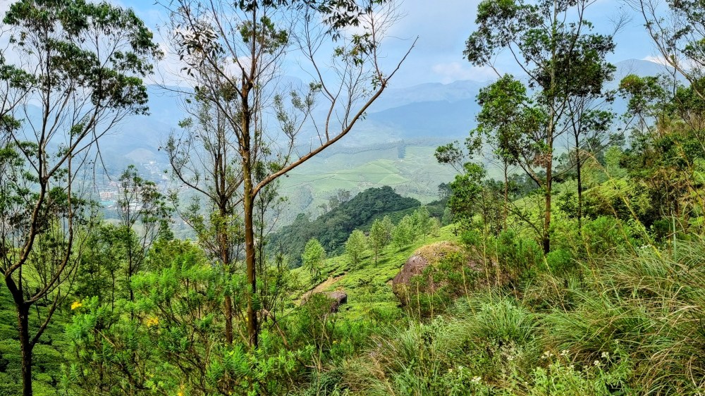 Passé le col, la vue sur Munnar et les autres versants de plantations se dilue dans un brouillard de mousseline. Nous pique-niquons d’un paquet de nouilles déshydratées et de quelques bananes minuscules, tout en détaillant scrupuleusement nos jambes. On se débarrasse des herbes collantes et d’une sangsue repue encore agrippée à un mollet. Des volutes de brumes aériennes filent depuis le col et amplifient une sensation de fraîcheur, oubliée depuis notre retour en Inde. Des eucalyptus isolés aux troncs verdâtres et pelés, plantent un décor vertical sur la crête que nous suivons, avant de rejoindre en contrebas les plantations.