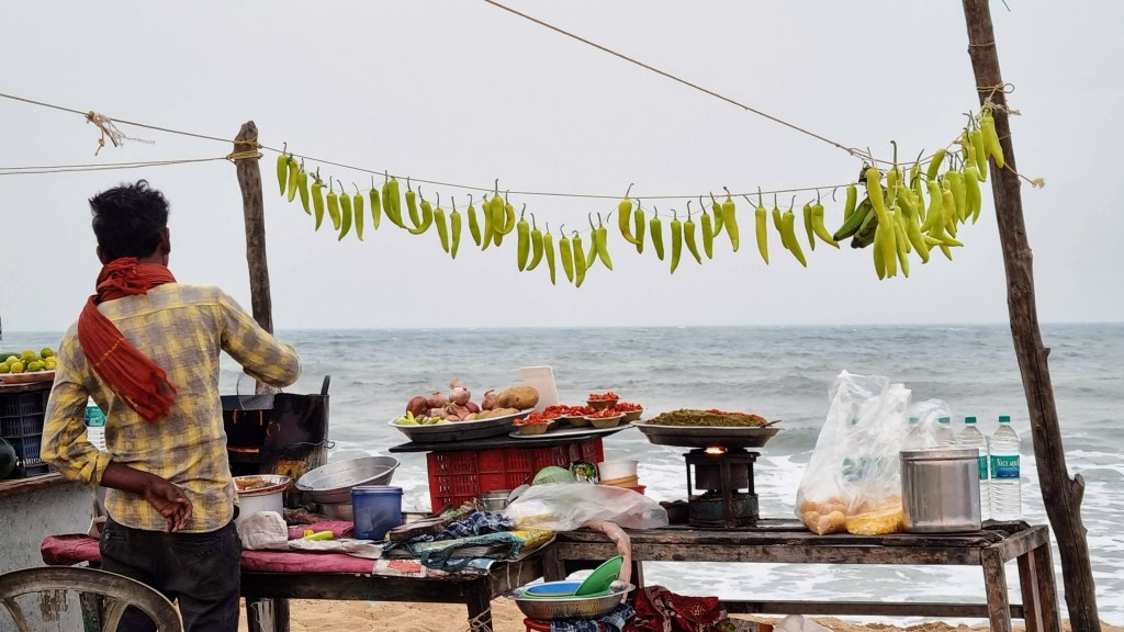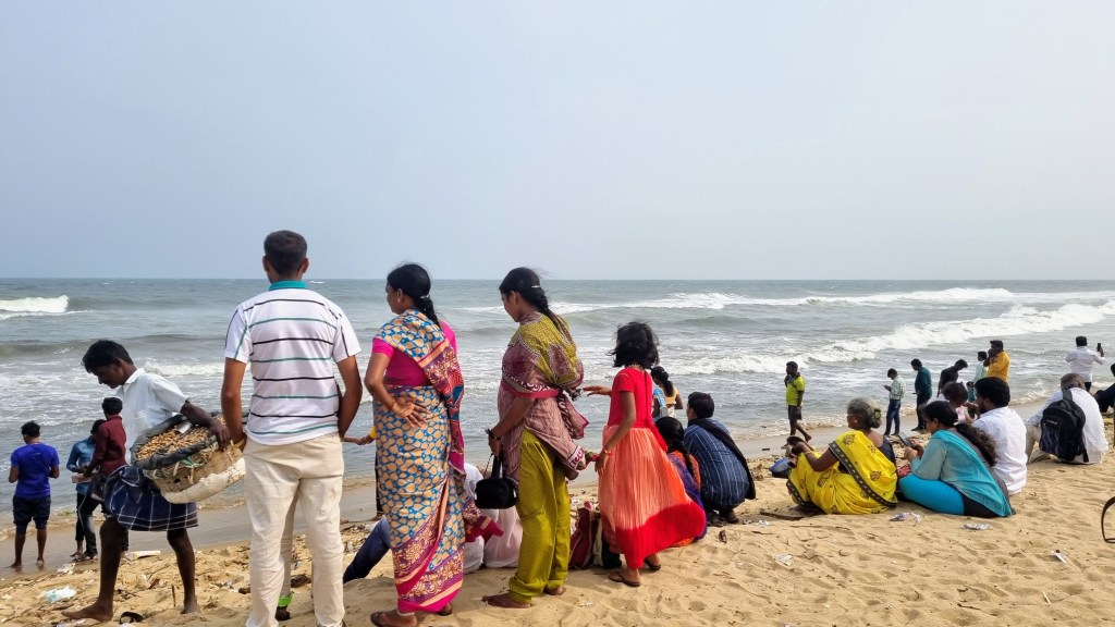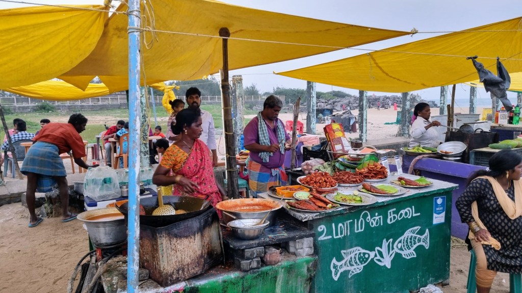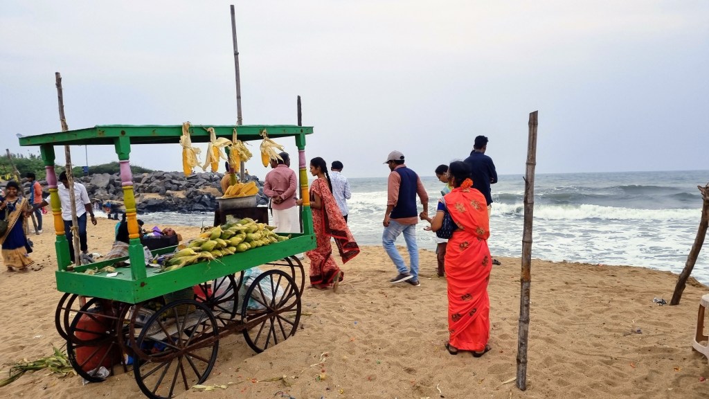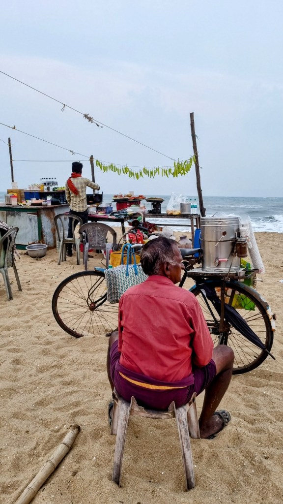 Des familles, assises sur un rebord de sable à la verticale de l’océan, observent tout en bavardant, les rouleaux d’écumes s’écraser à leurs pieds, tandis qu’une femme à proximité grille des épis de maïs dorés sur un brasero brûlant. On cuit à un château de sable de là, du poisson roulé dans une chapelure épicée et rougeâtre. Dans des cabanons de tôles et de toiles éphémères, des tatoueurs aux pieds nus, aux mains expertes, proposent d’encrer pour la vie sur des bras bruns, un nom d’amoureux, quelques lettres d’une jolie calligraphie tamoule, une arabesque élégante ou un dieu à tête d’éléphant dans l’espoir de s’adjoindre quelques heureux présages. Qu’importe, tant que ce dessin marque pour l’éternité à l’encre noire, cette journée merveilleuse passée à la plage.