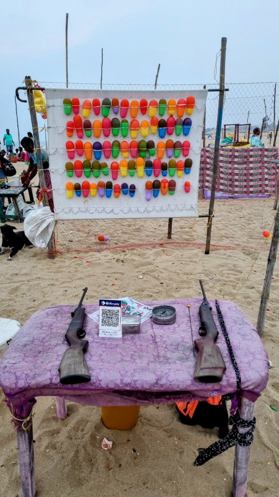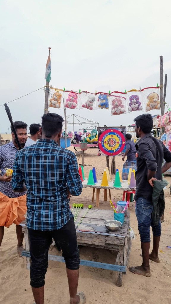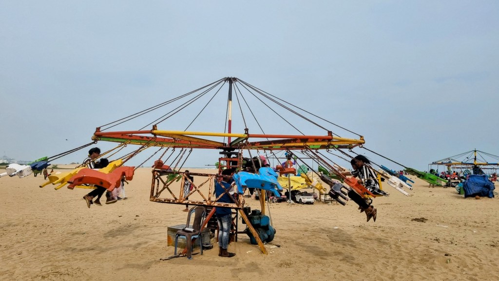 Nous arpentons en fin de journée, la plage étendue de Chennai. Nous la pensions déserte en semaine, elle ressemble en réalité aux grands boulevards parisiens à la veille de Noël. Une fête foraine s’y est installée, les pieds enfouis dans le sable tiède. Des enfants crient de joie en s’envolant dans les airs, agrippés à un manège de petits chevaux tournant au diesel pétaradant. Des équidés, d’os et de chair, emportent au galop, le rire aux lèvres et les cheveux au vent, des jeunes gens au milieu d’une foule qui ne cesse de grossir. Ce soir, on ne verra plus le sable de la plage, recouvert d’une marée de saris colorés.
