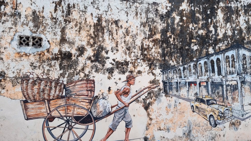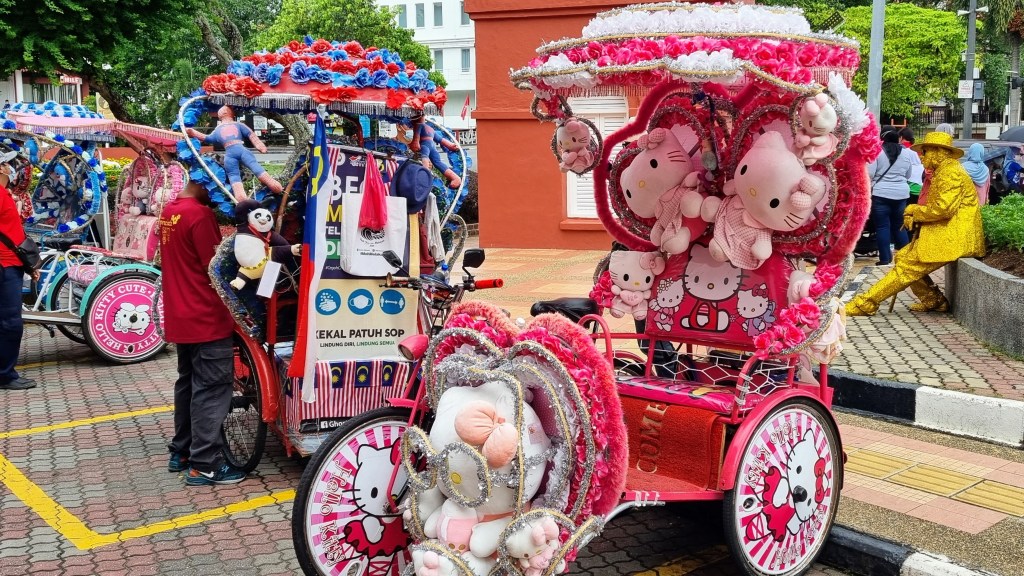 Nous ne sommes pas non plus surpris de croiser un moulin hollandais sur la place principale accompagné de vaches en papier mâché coloré. Plus loin un tigre de Malaisie domine un autre rond point, marquant un mélange des genres qui laisse le passant dubitatif et hésitant quant à l’endroit où il se trouve. Malacca ne s’encombre pas de réflexion trop compliquée. Elle accueille une foule populaire qui ne veut pas choisir entre la culture et la fête. Alors elle alterne avec une humeur égale lors de sa promenade dominicale, les prises de vues des vieilles pierres narrant une histoire en costume d’époque, classées au patrimoine mondial de l’Unesco, et les délirants rickshaws aux effigies de personnages de mangas promenant enfants et adultes au son d’une musique pop sucrée tonitruante. Le soir, les véhicules s’illuminent et défilent en procession dans les rues. Des grands-mères radieuses et ravies de cette journée en sucre et en couleur, blotties dans ces carrosses enfantins, dodelinent de la tête sur des sons électroniques et nous gratifient de larges gestes de la main en croisant notre chemin. « Oubliez les convenances et regardez comme je suis vivante », nous affirment-elles au travers de leurs sourires assurés.