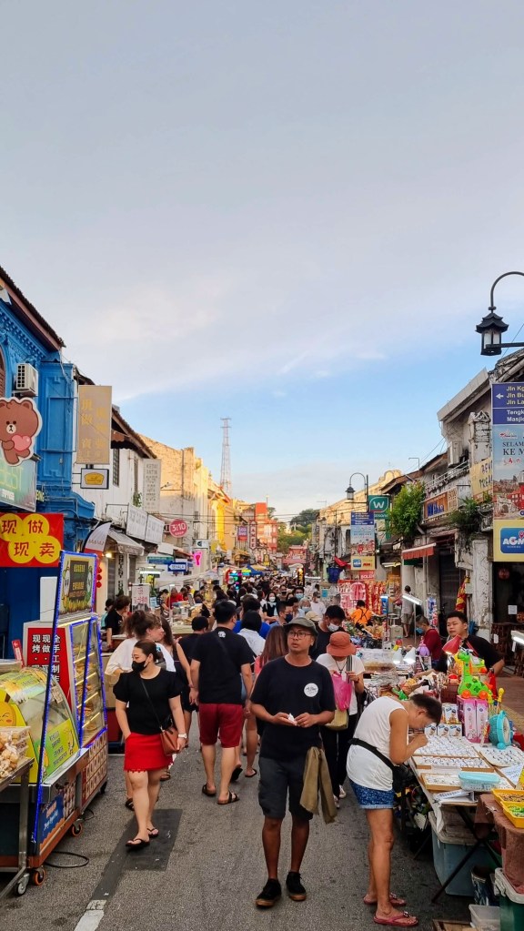 Le soir, dans la rue principale, des stands minuscules prennent place sur les trottoirs, la fumée des grillades de poissons, de brochettes d’œufs de caille s’empare du ciel qui s’éteint en retour, tandis que les lanternes de crépon prennent le relais. La foule se lance dans un marathon culinaire, pressée de tester les curiosités plus ou moins alléchantes proposées. Fruits de mers en sauce, beignets frits, glaces au durian et jus de fruits de goyave ou de rambutan, toutes les saveurs sont à portée de bouche et de porte-monnaie. On se laisse aller dans ce courant, baguenaudant en compagnie d’un monde en goguette, d’une table à l’autre, laissant le nez et les yeux guider nos choix. On goûte nos premiers pas en Malaisie dans les fumées suffocantes des grillades, dans l’euphorie légère et suave d’un village à l’abri de l’agitation du monde.