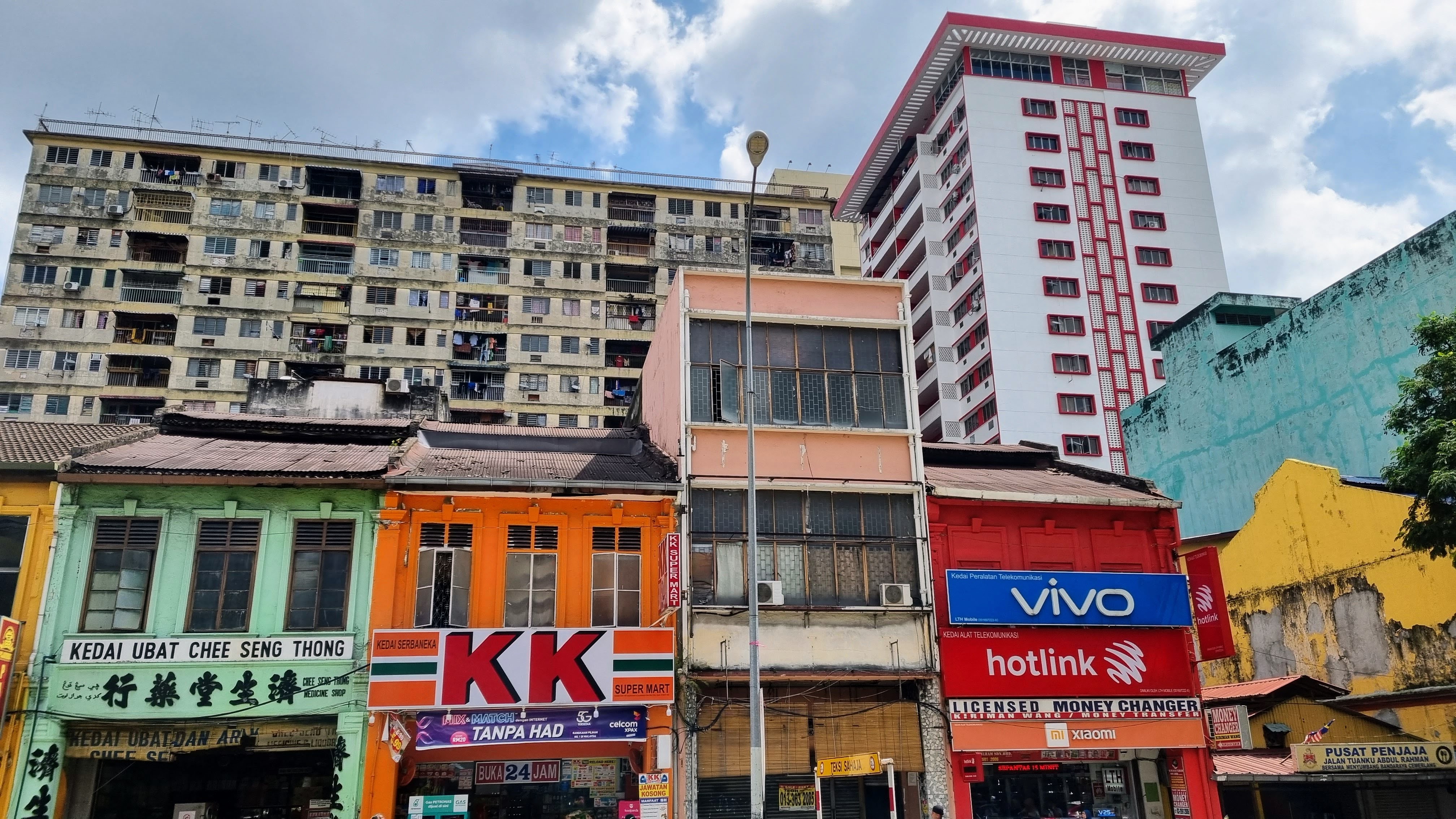 Au sud le quartier chinois vit en vase clos autour de quelques rues animées couvertes où les vêtements alignés sur les portants des boutiquiers s’imprègnent sans ciller de la fumée des brochettes acres du brûlot voisin. Des tables en plastique piqué et décoloré servent de grands bols de soupes de nouilles à toute heure de la journée. On y mange dans la rue ou dans des restaurants qui ressemblent à des entrepôts, au milieu des fûts de bière et des réserves de riz.
