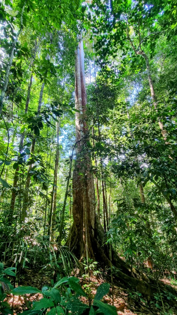 Les arbres sont majestueux, les plus grands tualangs dépassent les soixante mètres de hauteur, dominant de leurs troncs rectilignes toutes les autres espèces. Les fruitiers sauvages plus modestes, arbres à pain, goyaviers, manguiers et autres durians croisent dans les sous-bois des arbustes à fleurs tandis que les lianes épaisses et agiles s’efforcent de relier ces mondes dans un désordre inextricable. D’une esthétique imparable, les palmes de volumineux massifs se balancent au moindre courant d’air et, frivoles, créent un théâtre d’ombres et de lumières jouant avec un soleil qui peine à toucher le sol. On peut, dit-on, distinguer une centaine d’espèces sur un seul hectare et si la note dominante reste le vert, la palette de nuances de cette couleur est vertigineuse et propose au regard un remède contre l’ennui et la monotonie.
