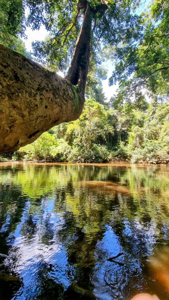 La chaleur écrasante présente sous ces latitudes est largement amplifiée lorsqu’on commence à progresser dans la forêt et c’est une sensation moite et lourde qui accable rapidement les corps. Il faut quelques temps alors avant d’accepter que l’état liquide et une transpiration permanente deviennent désormais une normalité. On suinte à haut débit.