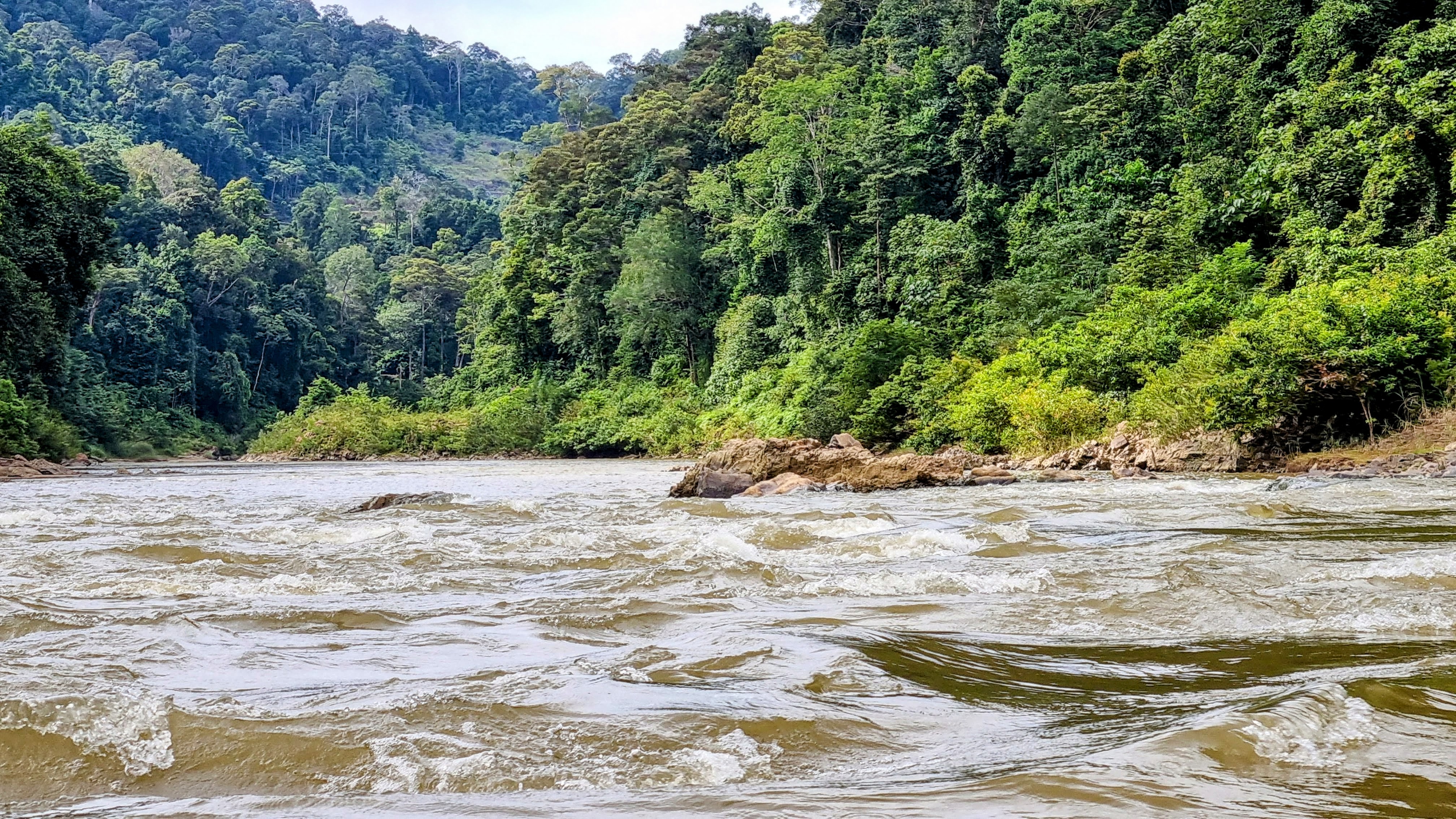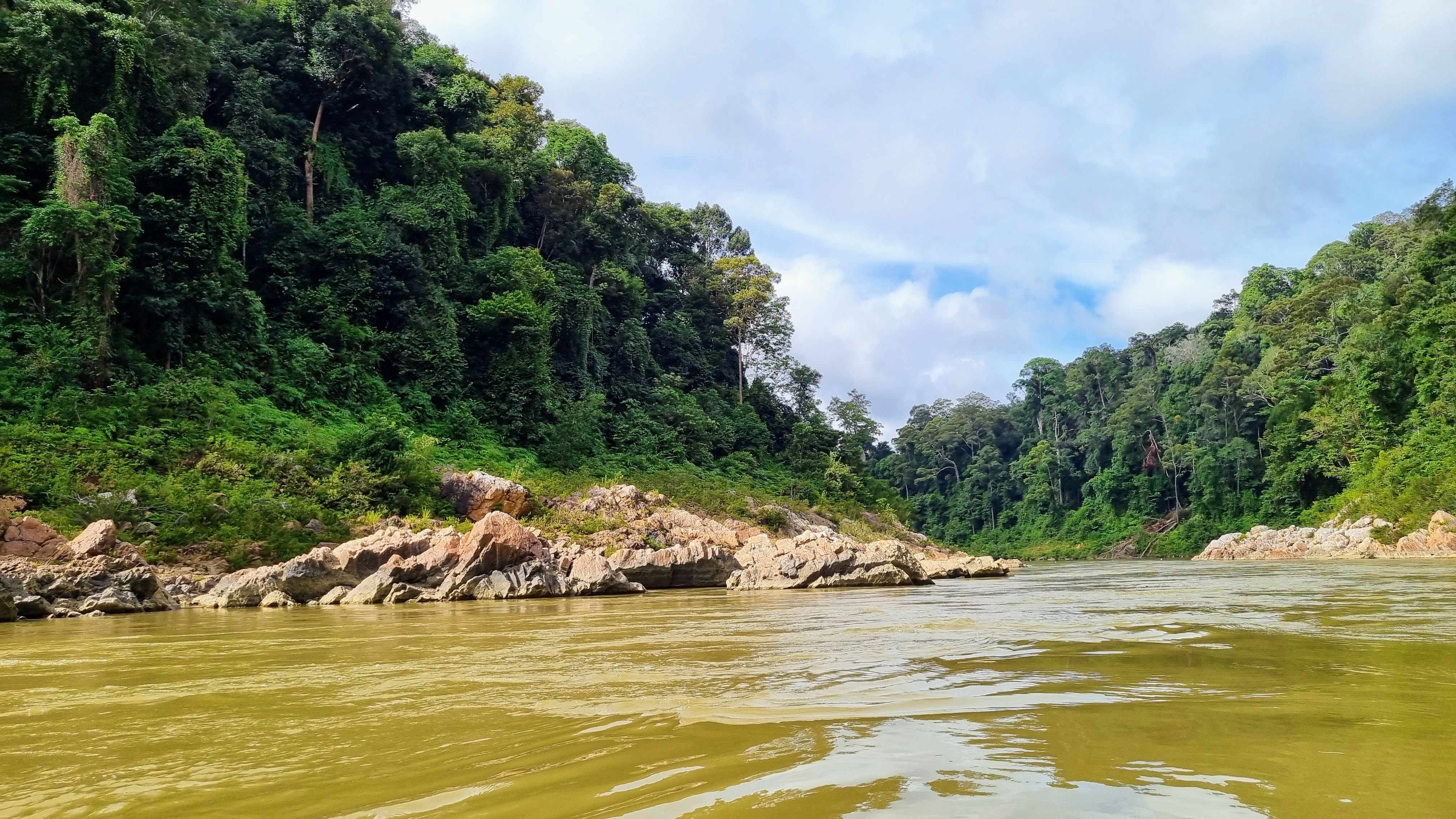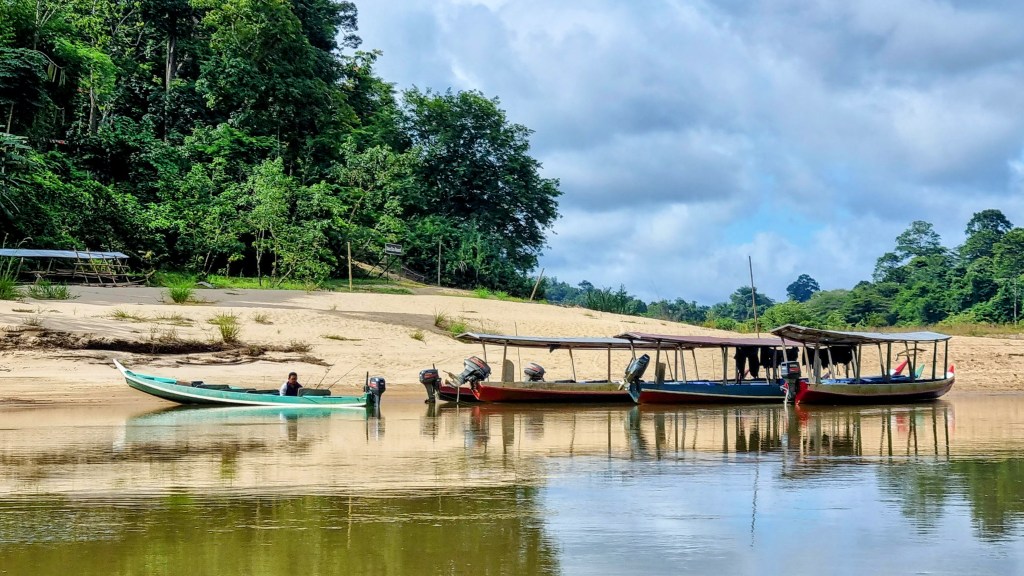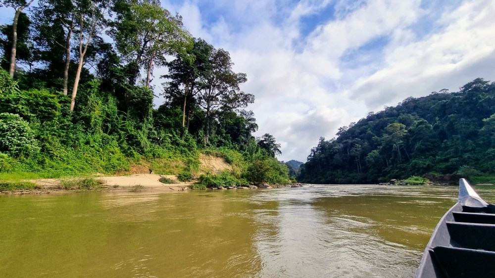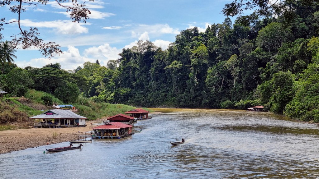 On emprunte la pirogue pour passer d’une rive à l’autre du Tembeling, laissant deux rimghits à chaque passage au pilote dans un bidon en plastique. Il faut y plonger le bras à l’intérieur pour y récupérer de la monnaie quand on manque d’appoint, sous le regard distrait du passeur occupé à négocier avec le courant.