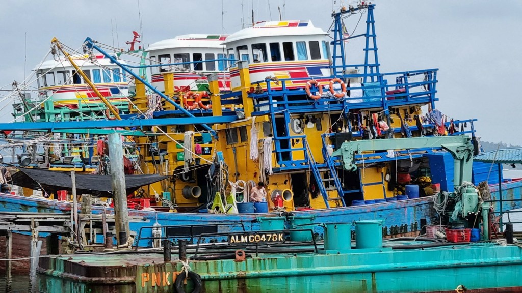 Pangkor est avant tout une île de pêcheurs. Les bateaux à étages aux dominantes jaunes et bleues fleurissent sur les pontons de bois. Dans les entrepôts sombres, on tri le poisson, on répare les filets. A midi, marins et ouvriers retrouvent en traversant la route qui tourne autour de l’île, les restaurants du quotidien. Tables rondes et chaises en métal aux peintures écaillées servent de décor à la cantine du port. Dans une vitrine ouverte, les plats attendent qu’on y plonge la louche. On nous donne une assiette en plastique. Des têtes de poissons lardées de piments, émergent d’une sauce figée, des espèces d’épinards patientent à côté des choux blancs saupoudrés de tiges vertes suspectes qui se noient dans une épaisse sauce soja, du porc en lamelle, des morceaux de poulet bardés d’os, finissent sangs mêlés dans les gamelles. Dans un tonneau en plastique isotherme, le riz blanc objet du désir pour les ventres affamés, attend au chaud.