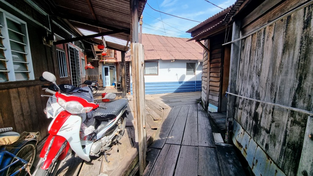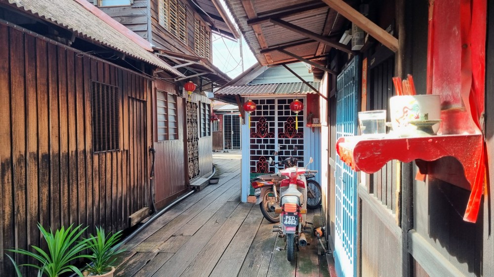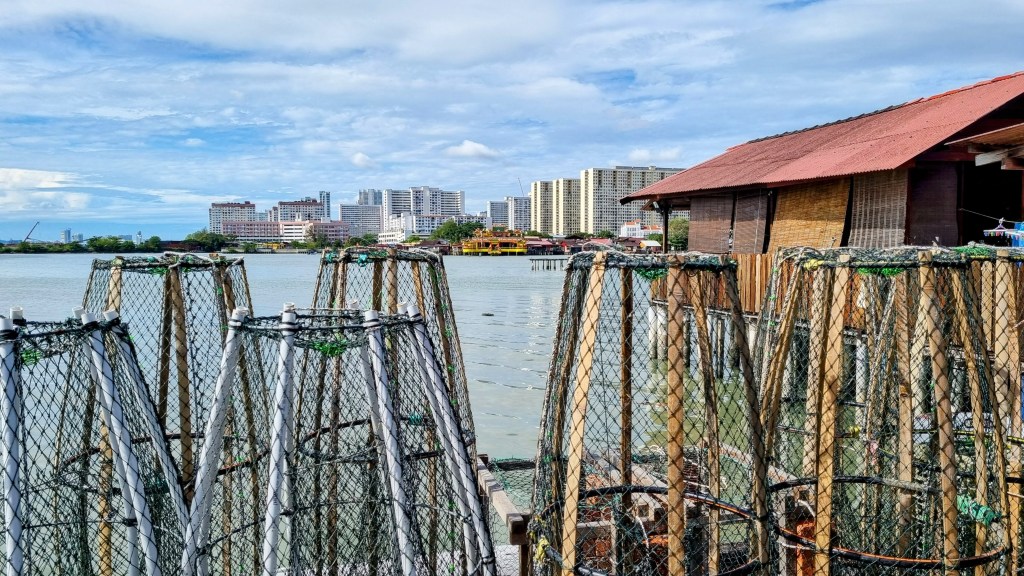 On lui préfère le village lacustre du dix-neuvième siècle, posé sur pilotis, de la jetée de Chew. Il est le vestige d’une autre vie, de planches et de pêcheries. La reconnaissance par l’Unesco du lieu comme patrimoine vivant aurait pu le transformer en musée mais le culte du passé se conjugue toujours au présent dans ce village du bout du monde. Et c’est surprenant comme l’agitation citadine s’enlise dans la vase et le clapotis de l’eau salée dès lors qu’on pose le pied entre ces habitations de planches noires. Le bois craque sous les pas du ponton mal ajusté.
