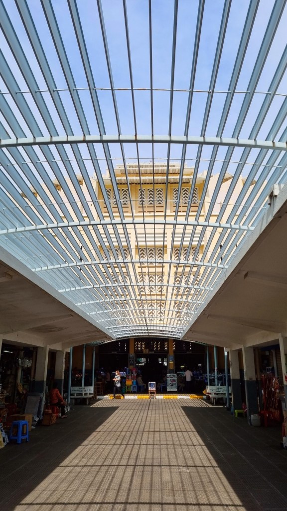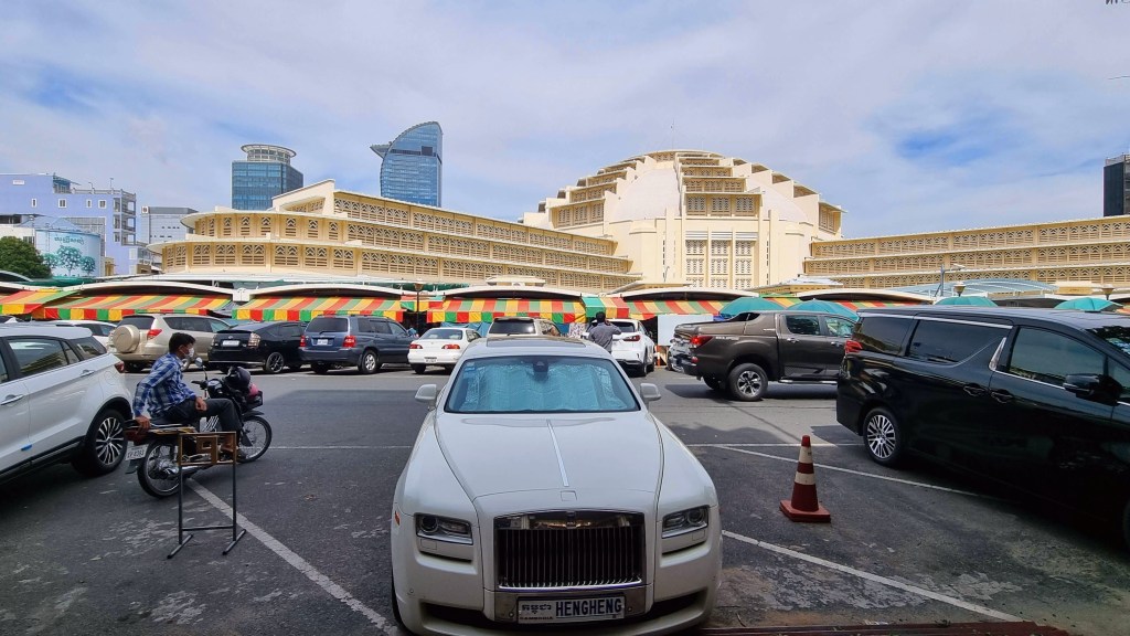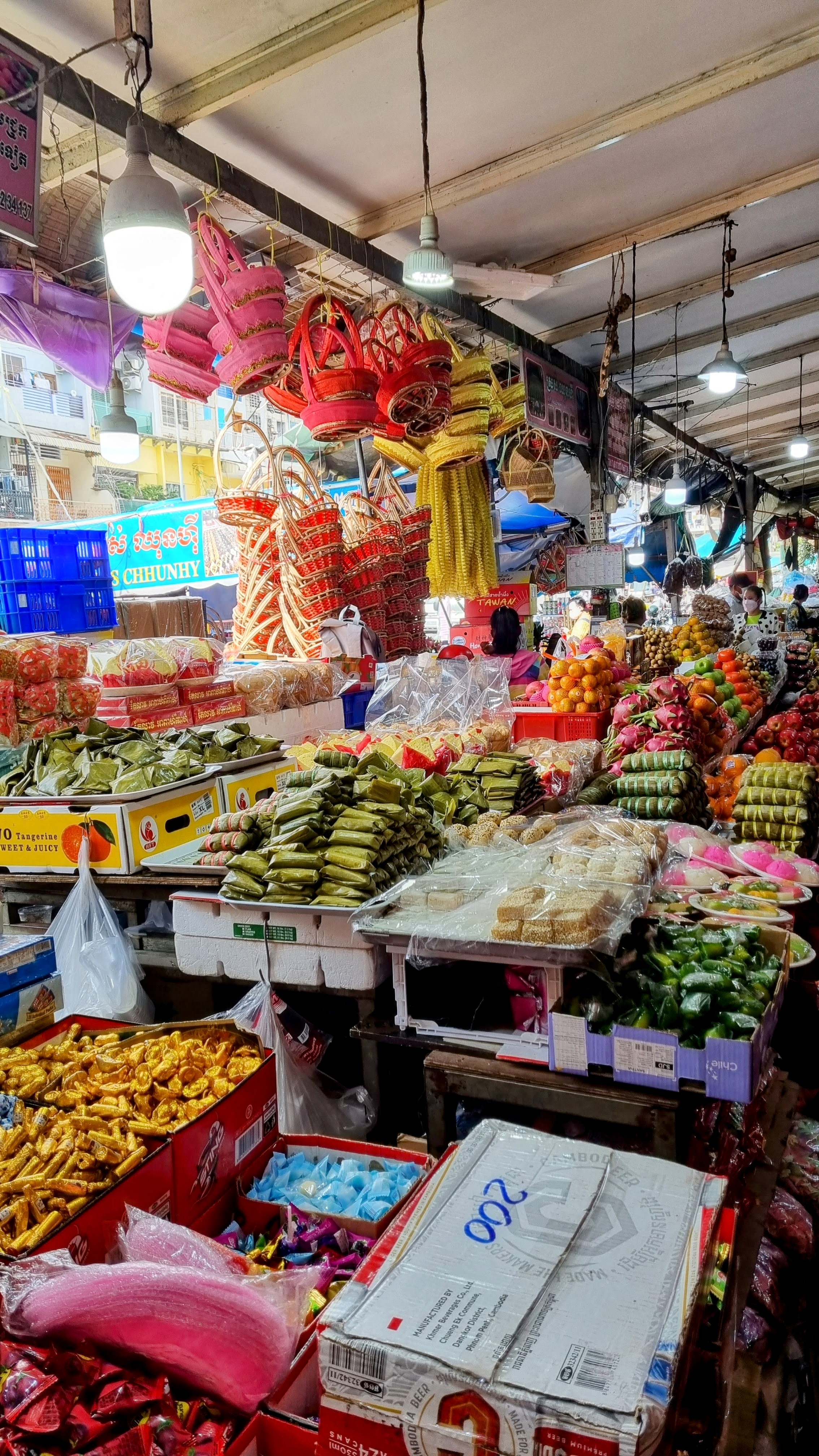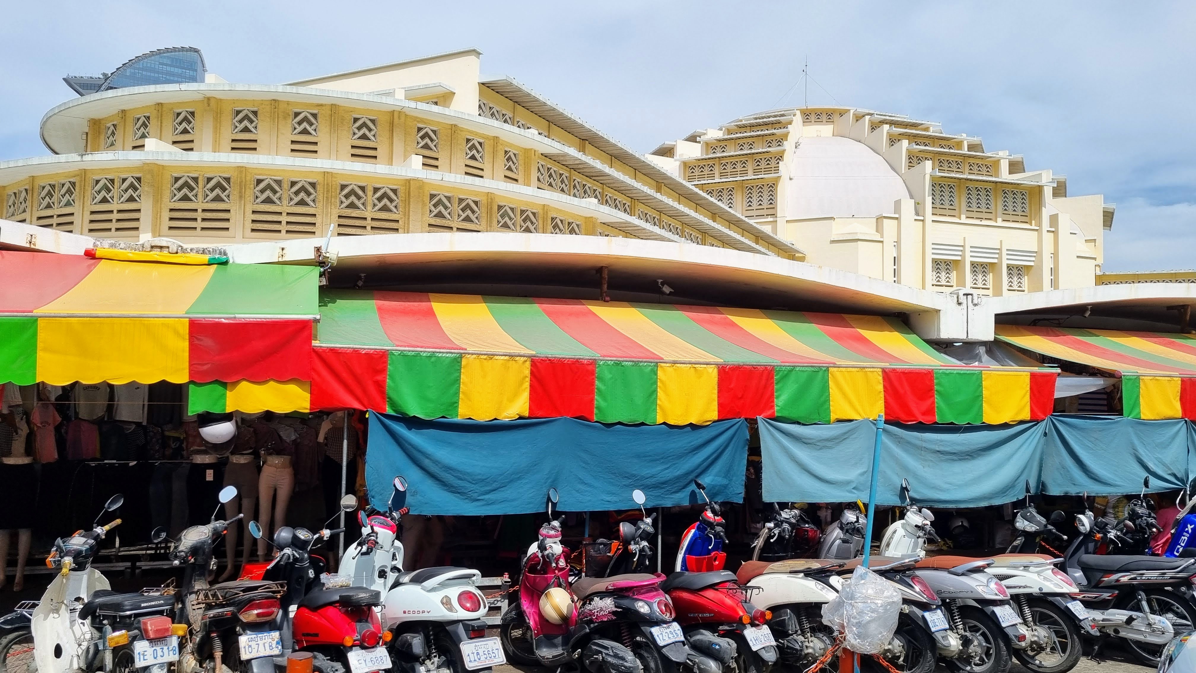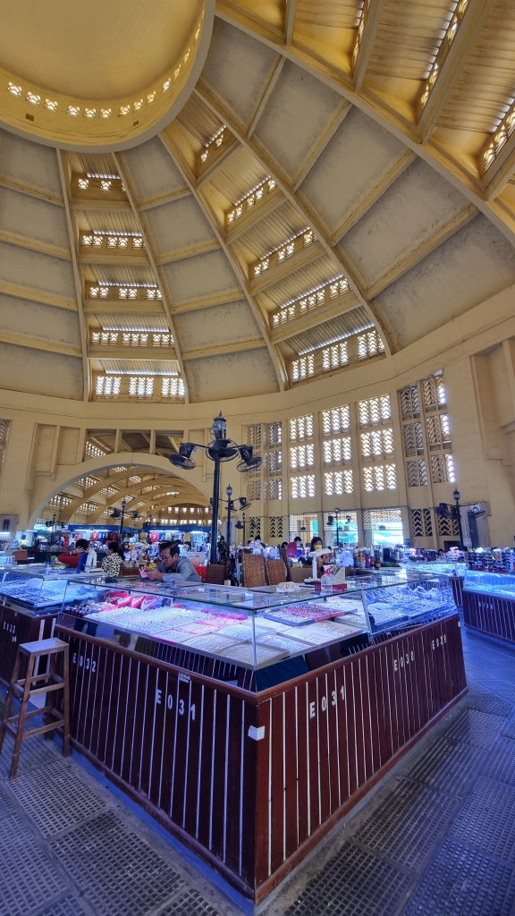 Nous traversons l’Orussey Market, achetant une poignée de bonbons avant de repartir aussitôt pour rejoindre enfin le marché central, à l’architecture originale d’inspiration « Art déco » des années 1930. C’est une vaste construction de l’époque française disposée en étoile, surmontée d’un dôme lumineux de 26 mètres de hauteur. Il abrite aujourd’hui bijoutiers et parfumeurs et rappelle à certains égards les grands magasins du boulevard Hausmann parisien.