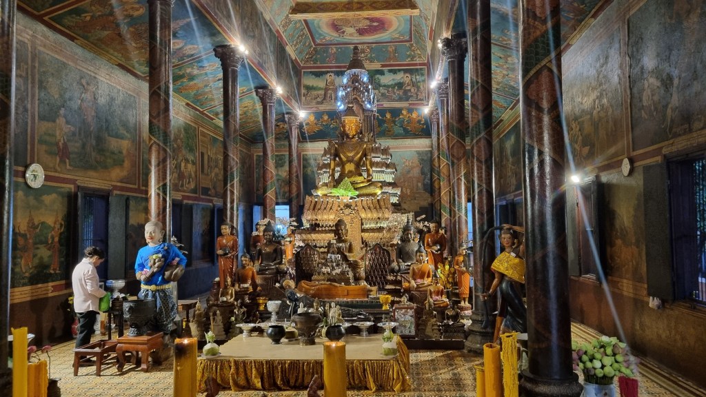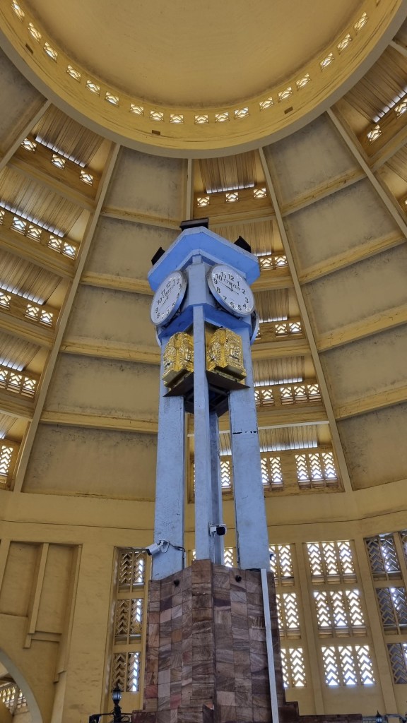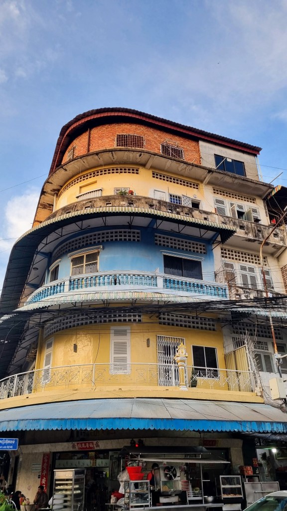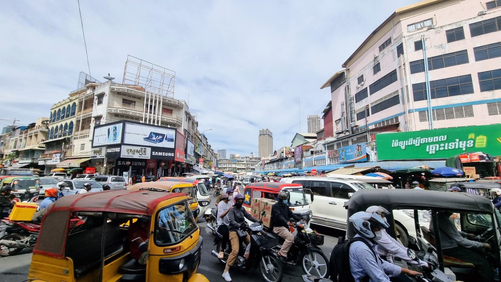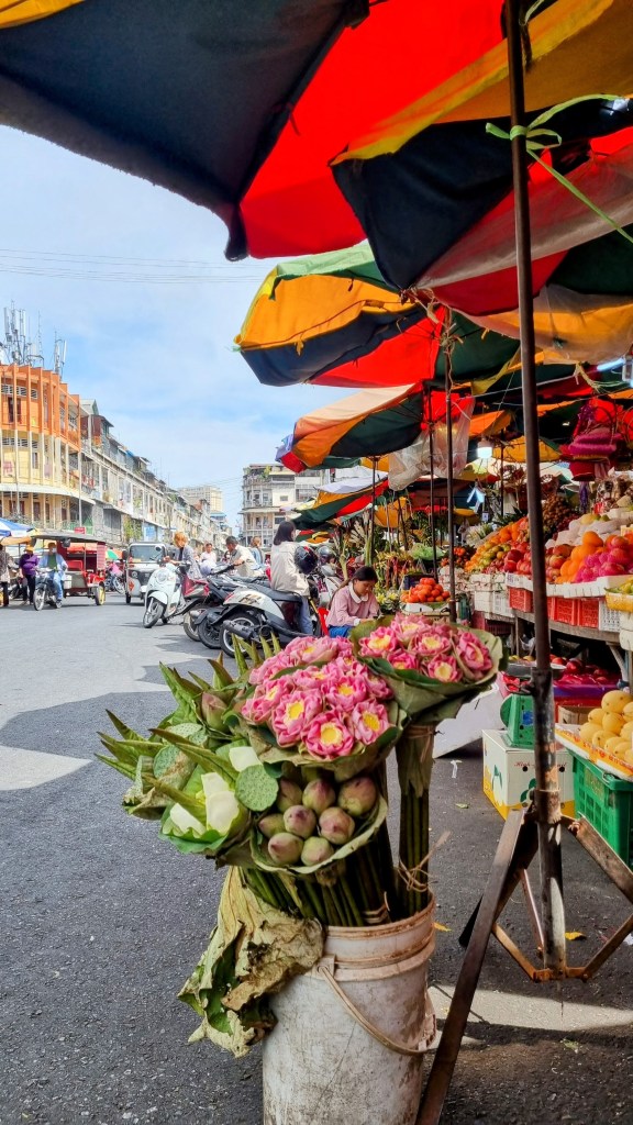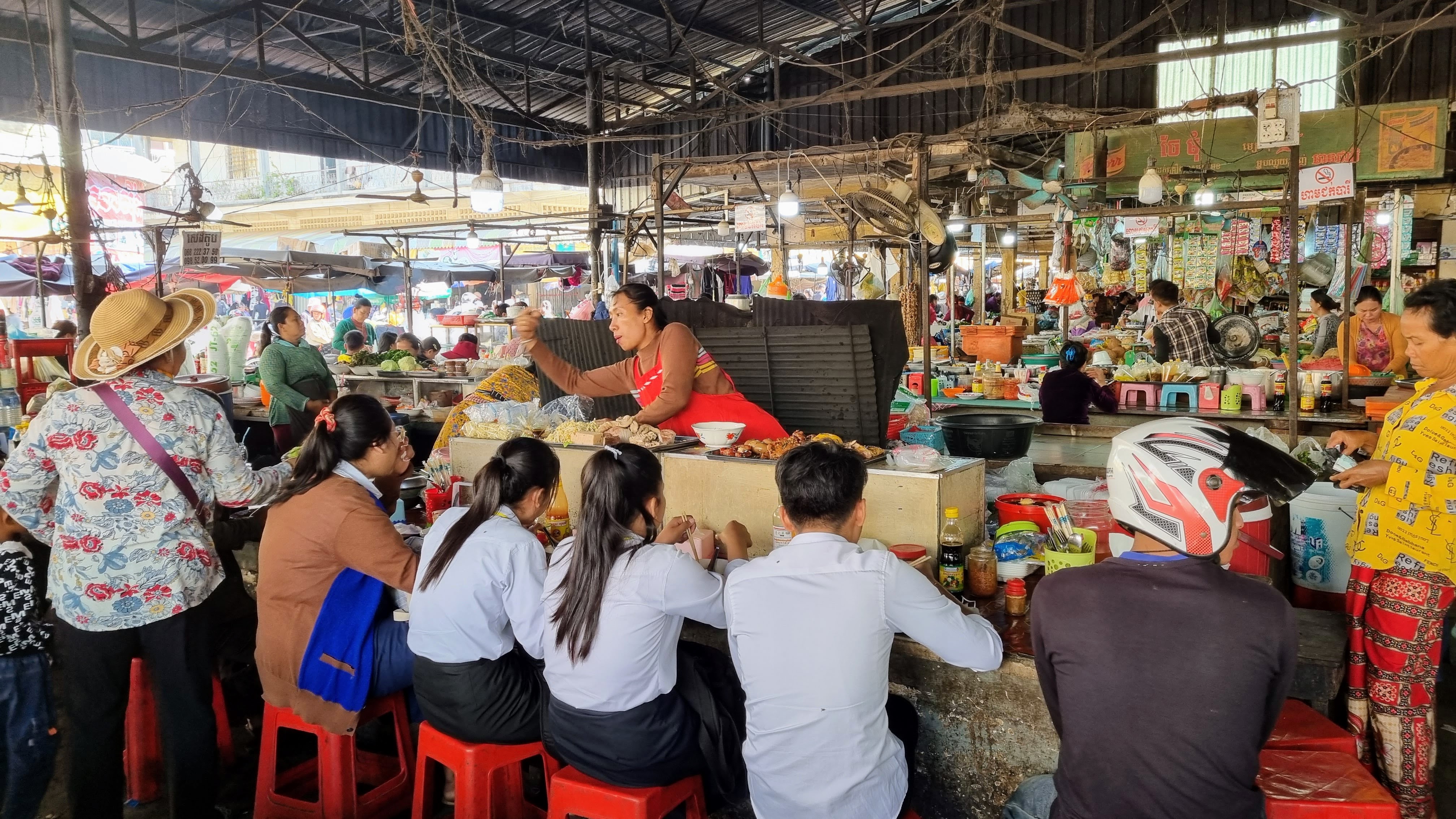 Nous traversons l’Orussey Market, achetant une poignée de bonbons avant de repartir aussitôt pour rejoindre enfin le marché central, à l’architecture originale d’inspiration « Art déco » des années 1930. C’est une vaste construction de l’époque française disposée en étoile, surmontée d’un dôme lumineux de 26 mètres de hauteur. Il abrite aujourd’hui bijoutiers et parfumeurs et rappelle à certains égards les grands magasins du boulevard Hausmann parisien.