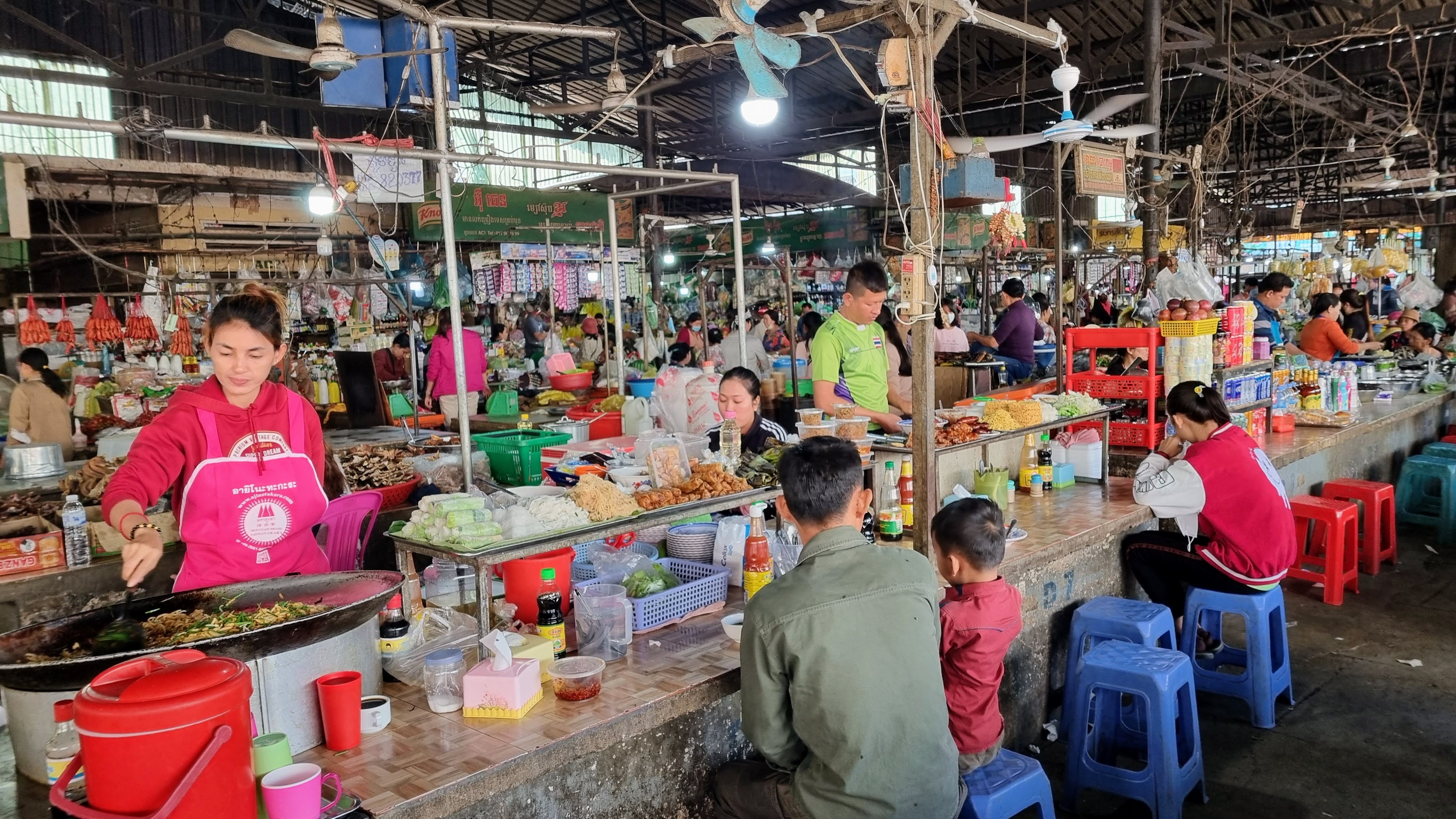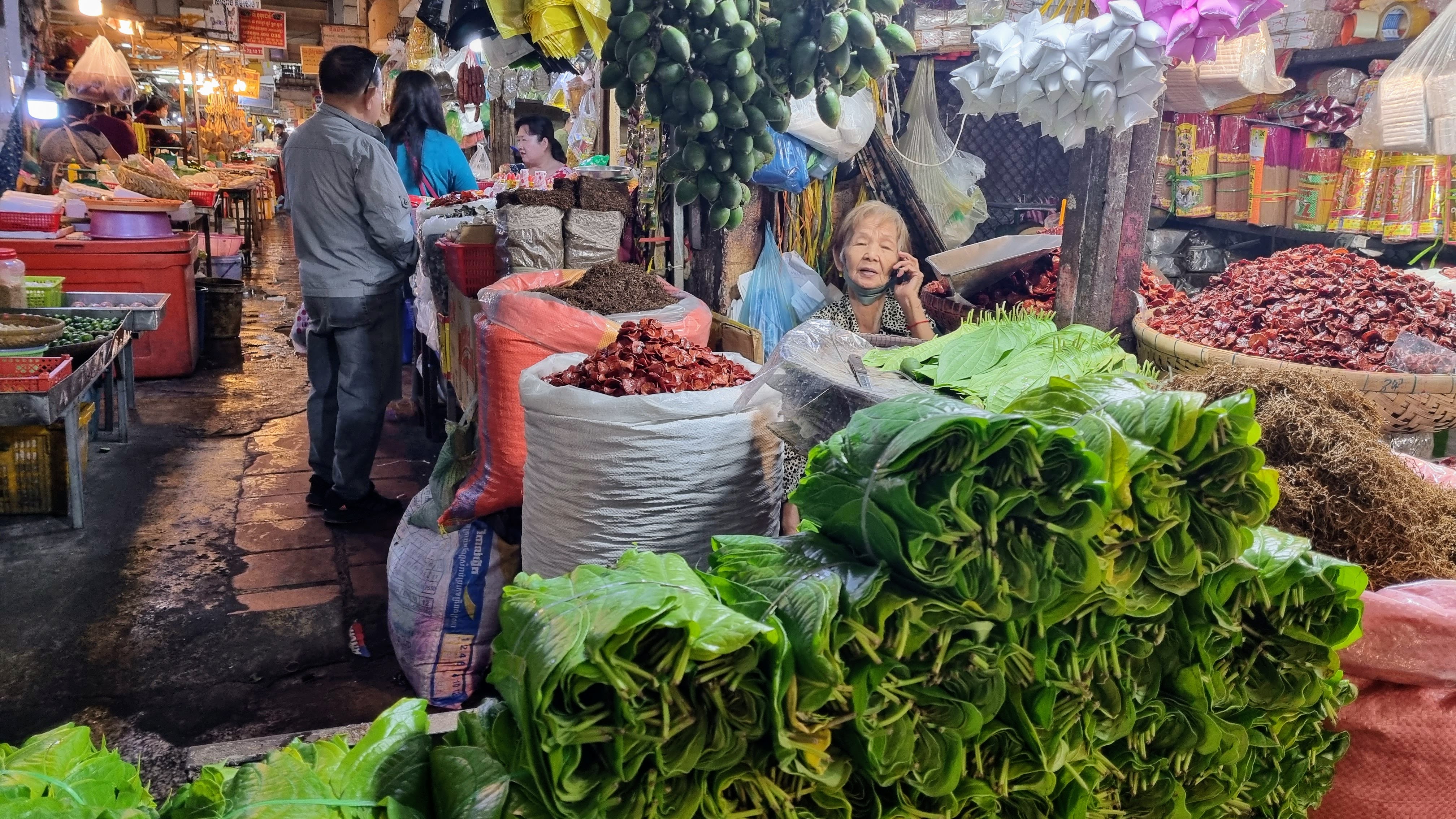 Vers onze heures ou midi, nous allons déjeuner au marché sur un bord de comptoir au carrelage émaillé, fissuré de longue date. La jeune femme qui officie derrière la vitrine dispose dans un bol une poignée de nouilles de riz fines et froides, une cuillère d’arachides pilées, des feuilles de menthes, un rouleau de printemps translucide et un beignet de viande frit coupé en morceaux. Elle y ajoute une brassée de germe de soja puis verse enfin un filet d’une sauce sucrée en guise d’accompagnement. C’est frais, délicieux et l’on prend tout autant de plaisir à se débattre avec notre paquet de nouilles agglutinées qu’à profiter de l’activité bouillonnante du marché.