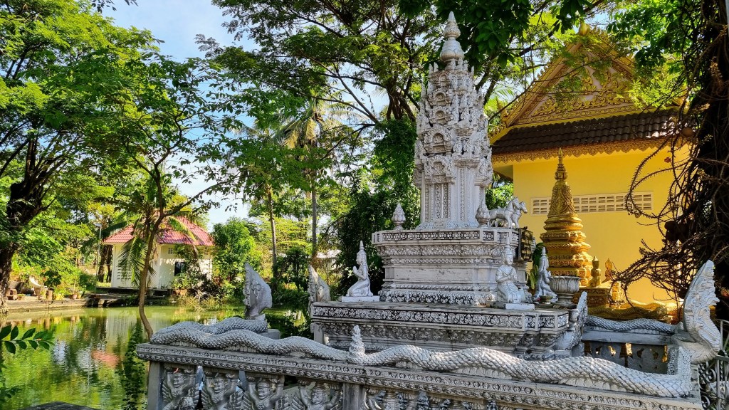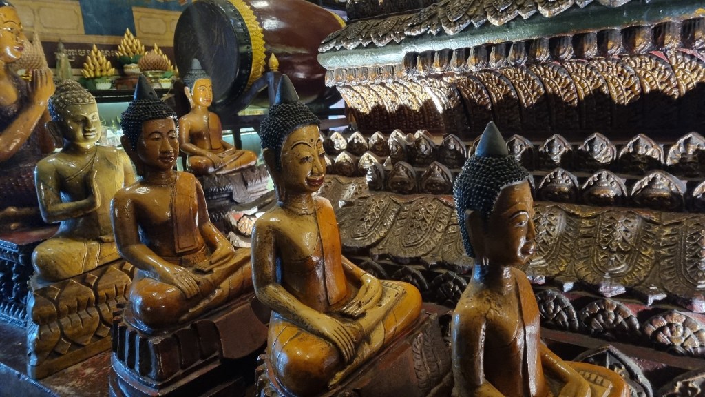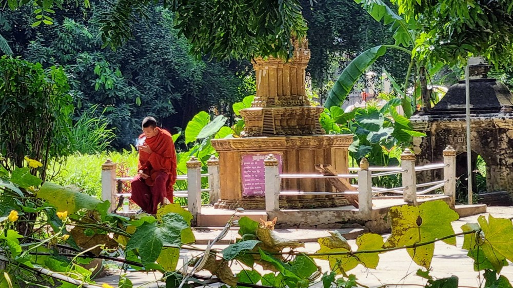 De retour à Battambang, nous franchissons le pont pour rejoindre l’autre rive où se trouve le monastère Wat Po Veal qui regroupe sur un vaste domaine un lycée bouddhiste de six cents moines et une kyrielle d’autres pagodes et chedis dans un environnement exceptionnel. En plein cœur de ville, la fureur se dissout dans des sentiers de poussière qui cheminent autour des stupas. Au milieu, une cuisine ouverte s’affaire à préparer les repas collectifs. A un pas de là, de jeunes moines assis sur un banc conversent devant une mare bleue pétrole tandis qu’un autre allongé dans un hamac rêve d’ailleurs en regardant des vidéos sur un écran. L’ambiance y est extraordinairement sereine et nous errons sans fin autour des édifices patinés par le temps, suivis par des chiens méfiants qui grognent lorsque nous les croisons, rassurés par le sourire clair des moines en robe safran.