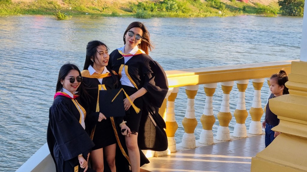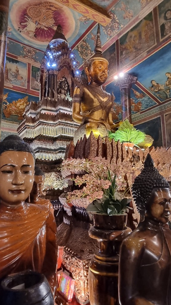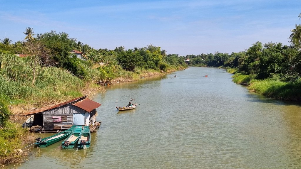 Des pagodes dorées, élancées vers le ciel, émergent des rizières et ponctuent une ligne d’horizon monotone. D’anciens temples Khmers rappelant la proximité de la renversante cité d’Angkor, visitée il y a quelques années, nous replongent nostalgiques, dans cette fascinante civilisation d’architectes et d’artistes qui établit sa capitale entre le neuvième et le quinzième siècle au nord du Tonlé Sap, plus vaste réservoir d’eau douce d’Asie du sud-est.