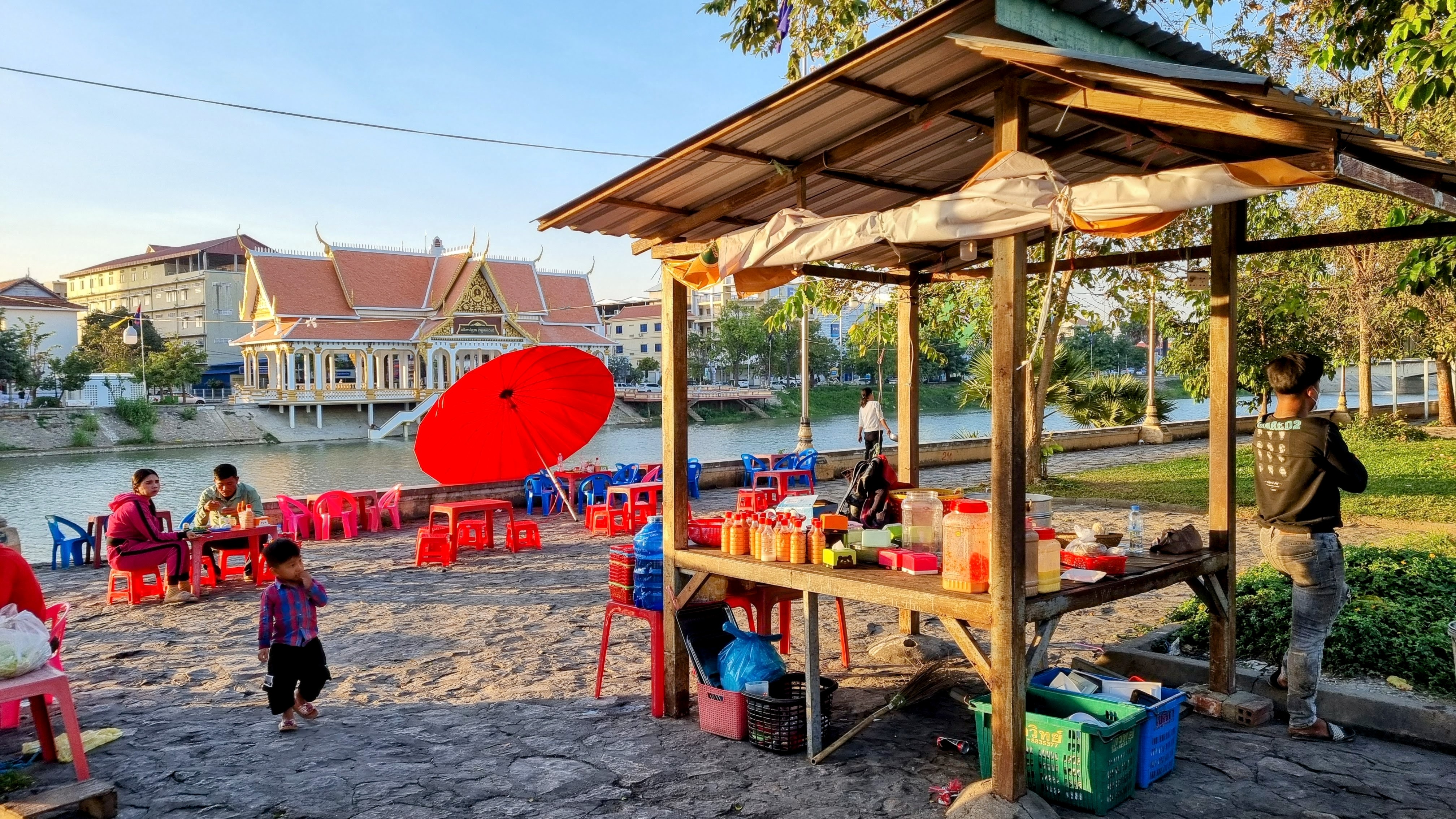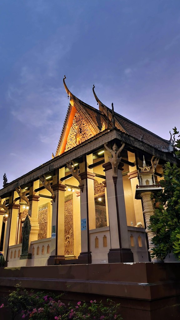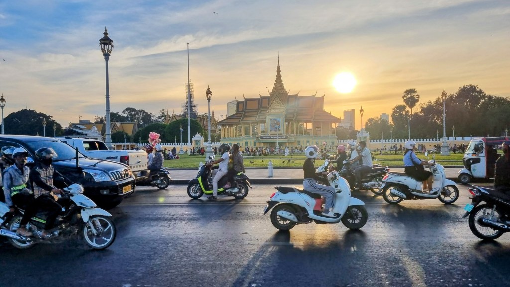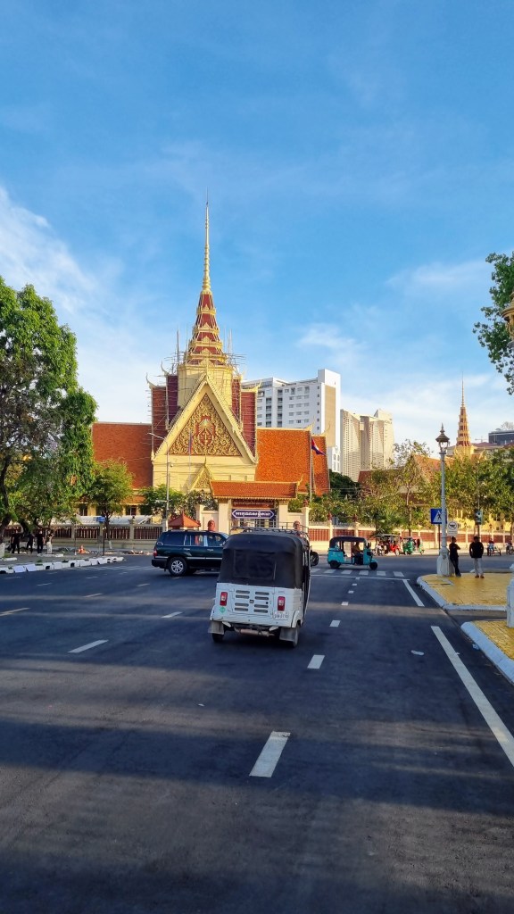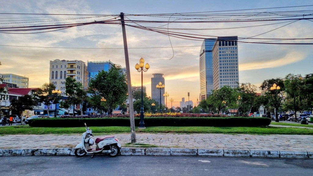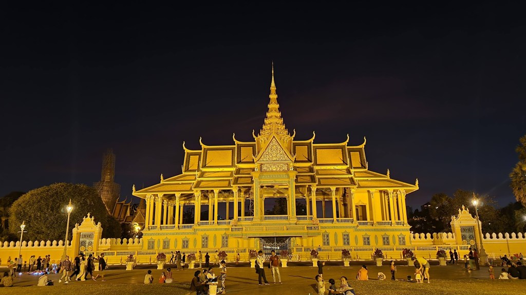 Des lumières vacillantes planent sur la place de l’indépendance tandis que le palais royal si jaune se déploie dans le ciel. Des marchands de jouets électriques lumineux attirent les enfants comme les abeilles sur un champ de fleurs au printemps. La soirée est étrangement douce, un vent presque frais entré comme par effraction en survolant le Mékong, s’engouffre dans la ville. Le brouhaha des automobiles filant sur les quais se dissout dans les prières des moines et les effluves sucrées des roulottes des trottoirs.