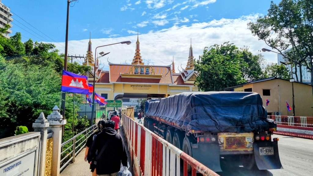 Deux jours plus tard, nous longeons en minibus collectifs le lac Tonlé Sap afin de rejoindre Phnom penh. Un paysage agricole désespérément plat, vivant et peuplé défile sur le bord de la route. Ce sont des villages plus que des villes, des hameaux plus que des villages, qui alignent les maisons en bois gris sur pilotis rappelant la proximité d’une étendue d’eau dont la hauteur dépend largement des moussons et des caprices du Mékong.