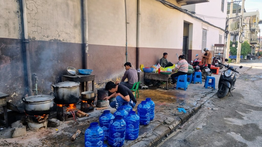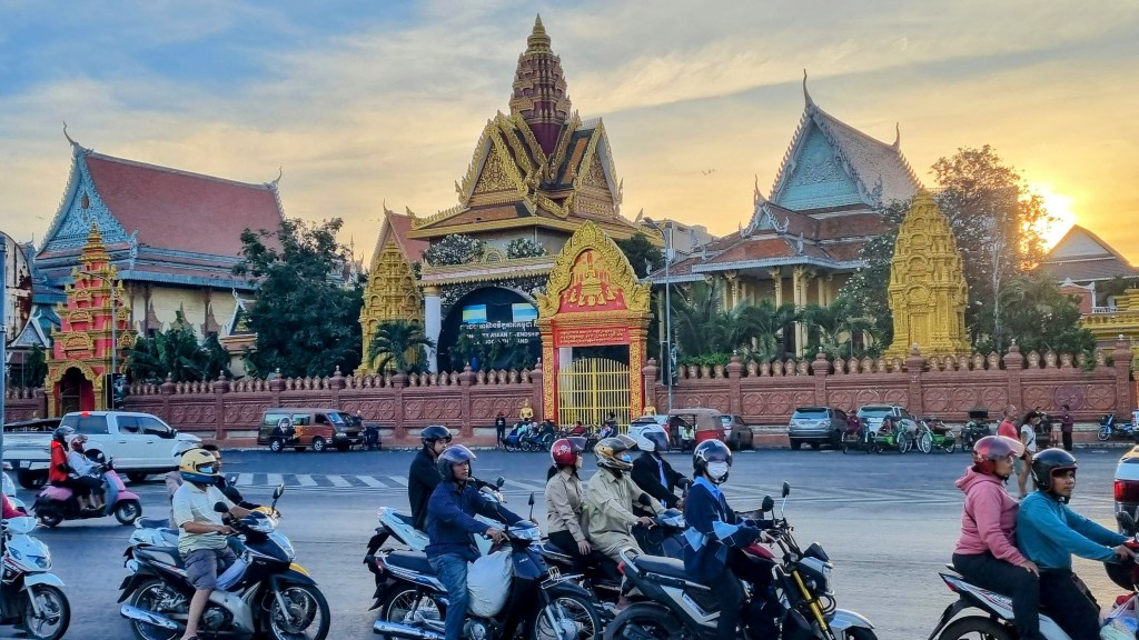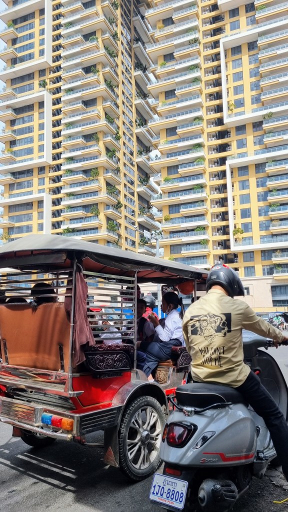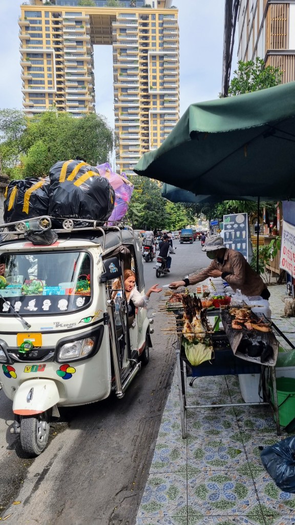 Nous récupérons nos sacs dans le bus, achetons deux autres tickets pour le surlendemain vers ailleurs. Nous ne faisons effectivement que saluer la ville car nous prévoyons d’y retourner dans quelques semaines. En attendant, on ne laisse rien passer, on s’enfonce dans la cohue, on lance une charge au milieu des cyclopousses et des mobylettes, réalisant un peu plus tard seulement que nous marchons dans les rues de Phnom Penh.
