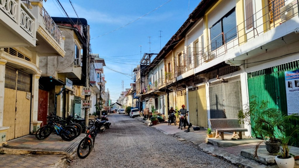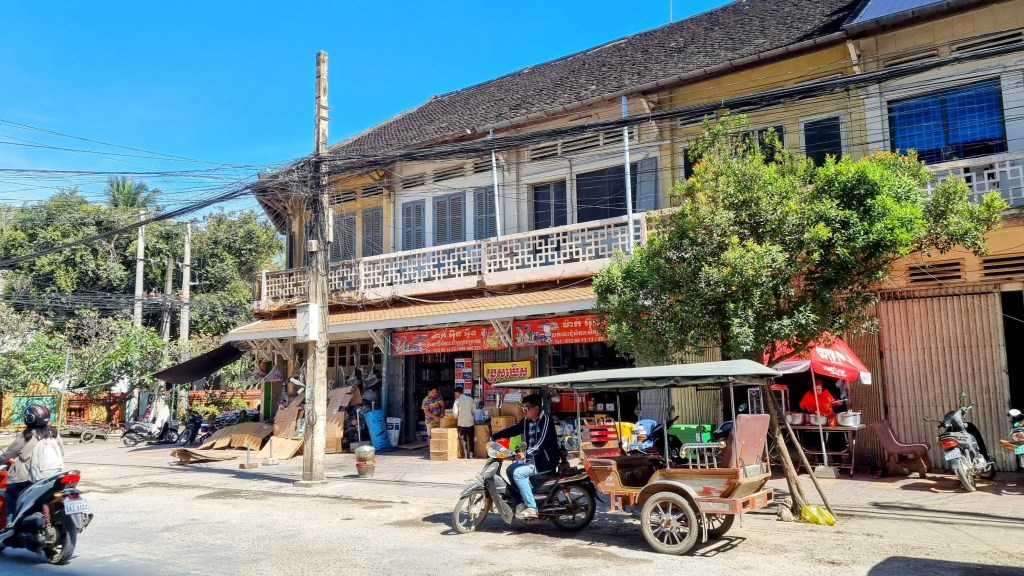 Battambang n’exprime pas à priori un charme désarmant mais elle nous plaît comme cela, à l’image d’autres bourgades croisées, juste pour l’ombre d’un presque rien. D’anciens immeubles de quelques étages aux balcons ajourés, deux marchés centraux, des rues taillées au cordeau inventées par une administration coloniale tatillonne et un peu ennuyeuse, une circulation brouillonne, animée et bon enfant où il est aisé de se glisser à pied comme à vélo, Battambang est une cambodgienne comme les autres qui ne laisse pas indifférent.