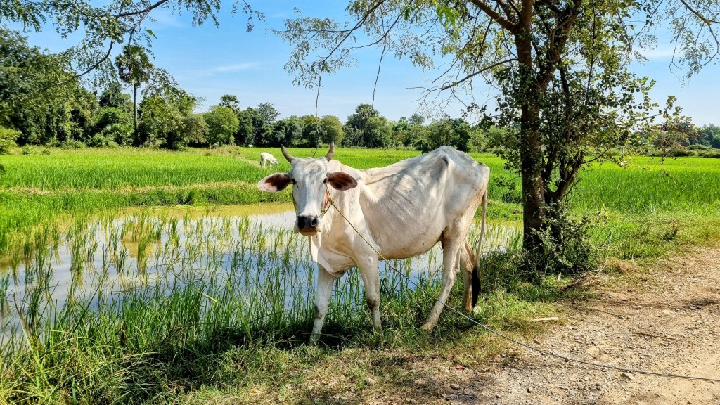 On découvre plus tard la campagne à bicyclettes, circulant sur des routes étroites habitées tous les cent mètres, traversant en ligne droite des champs de cultures mûries sous une lumière crue sans concession, vaste et plat paysage de terres agraires. L’air est frais malgré un soleil sans voile. On roule à petite vitesse sur des vélos cambodgiens, le dos courbé, le roulis d’une roue voilée dans les jambes.