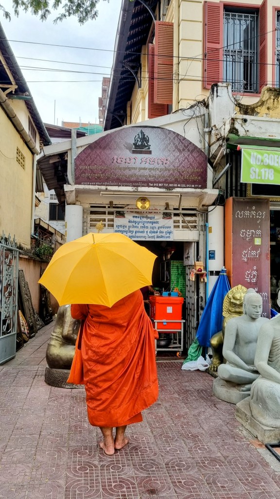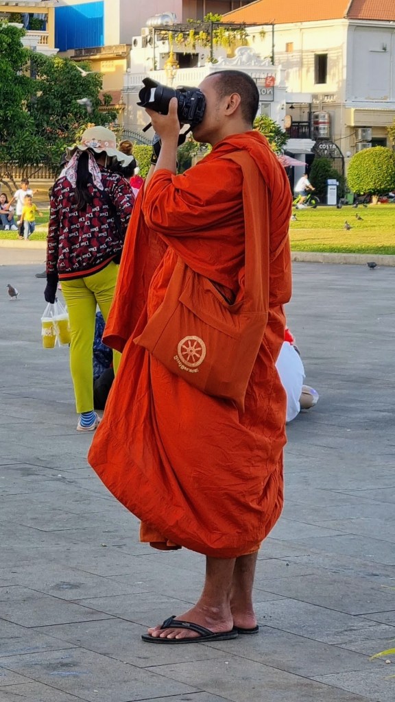 Le matin, les moines circulent en petits groupes, parfois seul, dans les rues de la ville, s’attardent devant un commerce et se plantent là immobiles, sages statuettes de safran, attendant qu’on remplisse leur sacs de nourritures. Quelques offrandes pour les croyants en échange de prières et d’une paix bienveillante pour cette journée à venir.