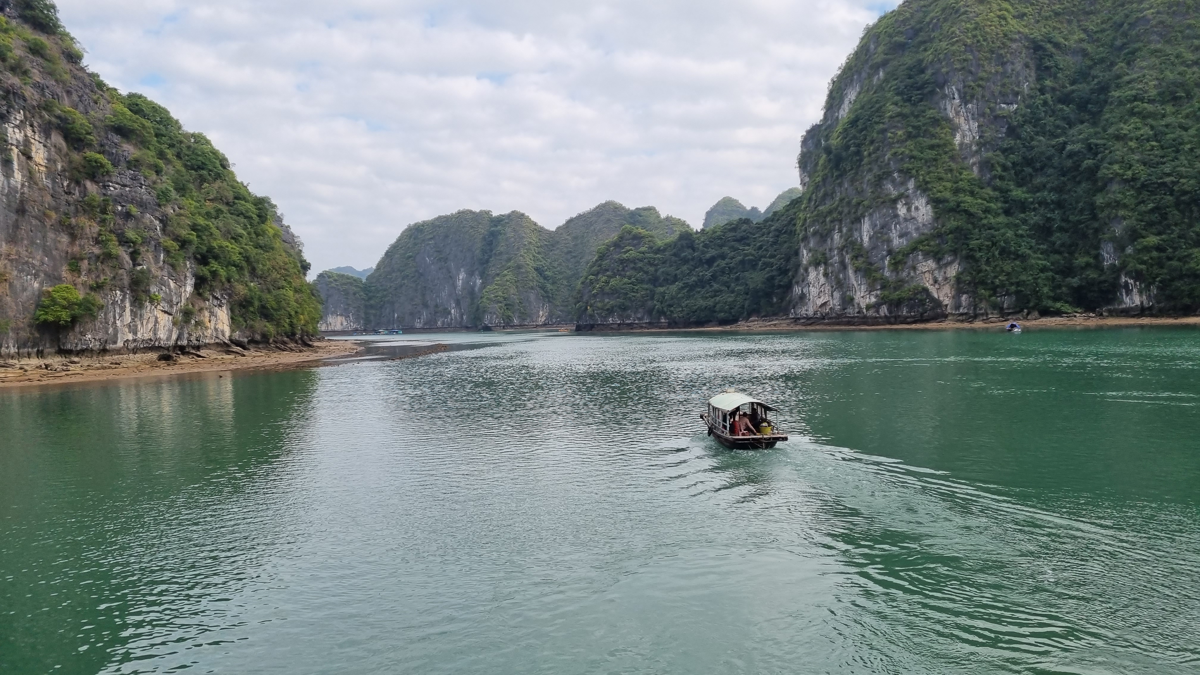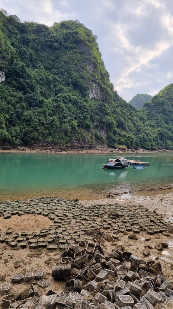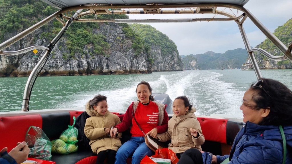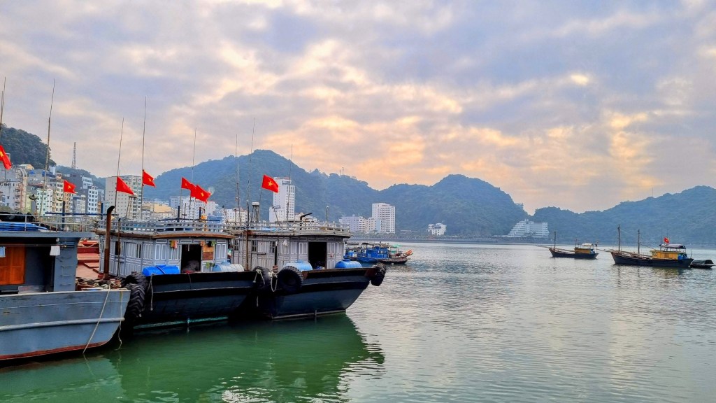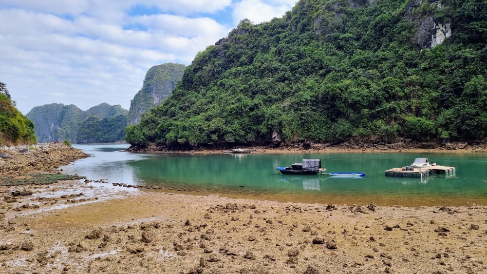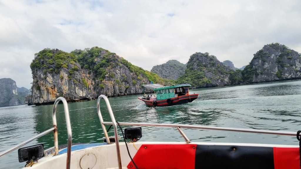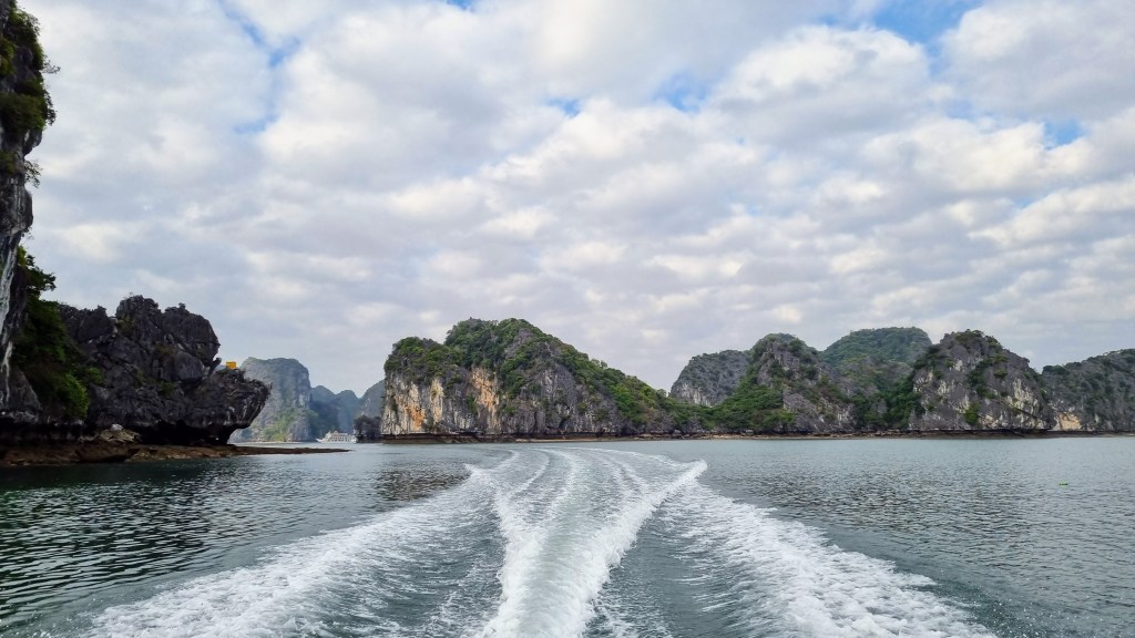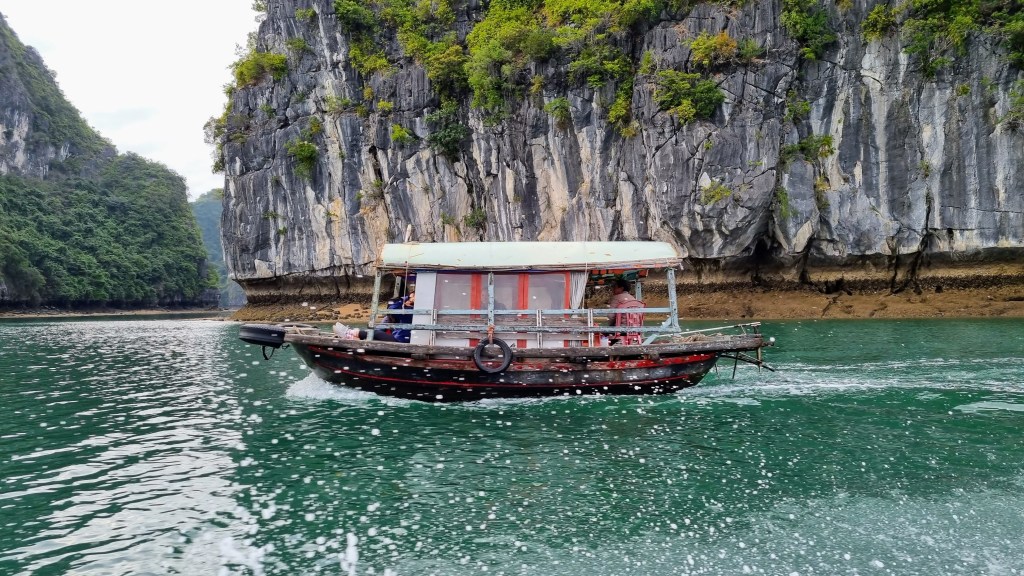 Quelques marins malins profitaient de cette absence de concurrence pour tenter de nous vendre quelques ronds dans l’eau en barque, au prix d’une croisière de luxe. Le ciel était gris et bas. En ligne d’horizon, les roches karstiques recouverts d’un tapis végétal fermaient la baie et annonçait que la représentation était close jusqu’à nouvel ordre.