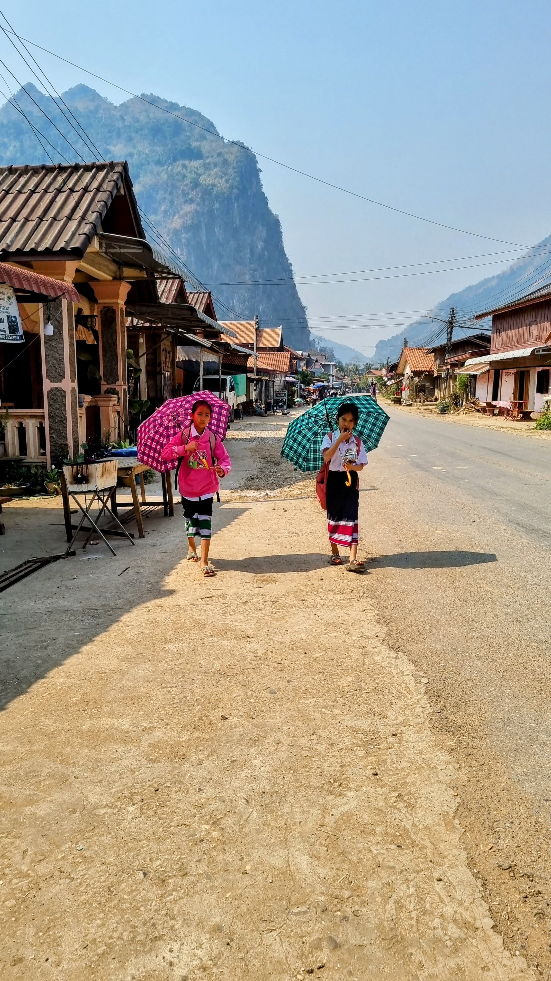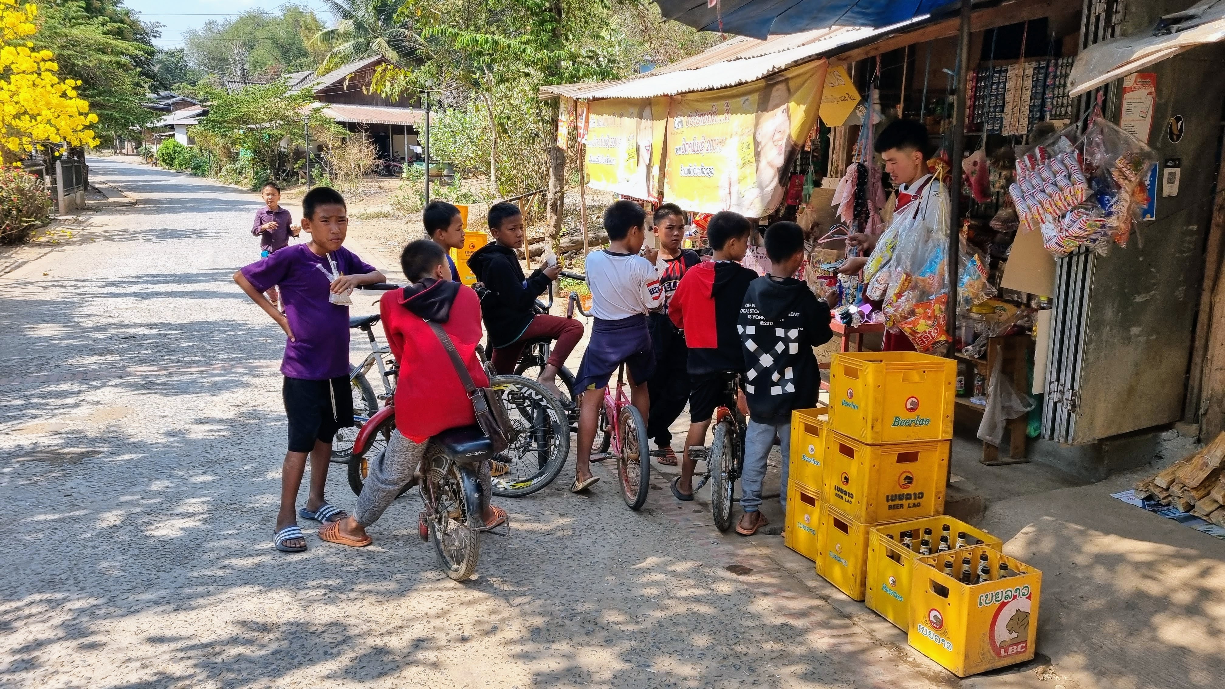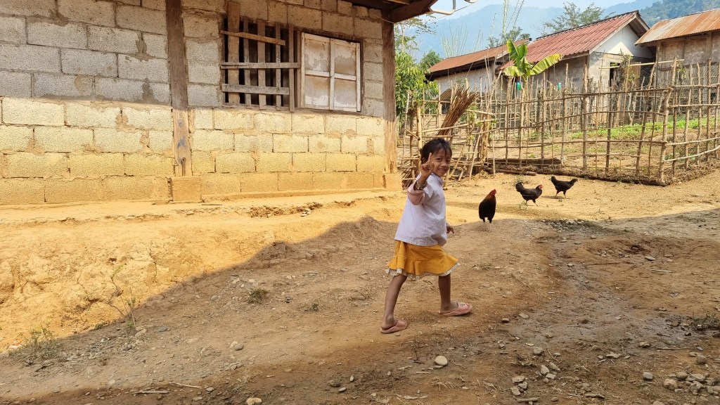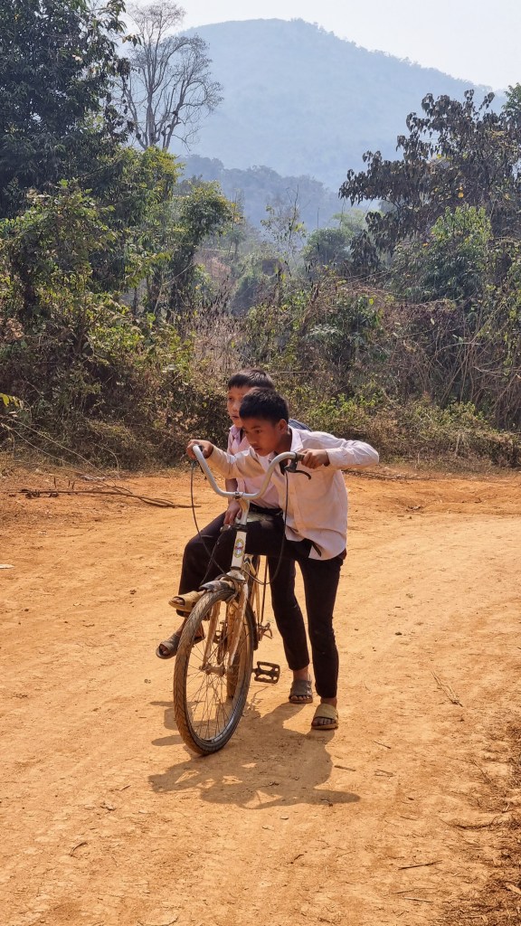 On y déploie notre cantine de jour, paquet de riz gluant que l’on roule entre les doigts pour le transformer en boulettes de la taille d’un généreux calot. On alterne avec quelques petites bananes avalées en deux bouchées gourmandes pour sucrer et relancer la vie encore un peu plus loin. Quand ce ne sont pas les poules et poussins qui poussent les pieds pour y trouver quelques bouts de terre à gratter, ce sont les enfants qui jaillissent des venelles voisines. D’abord ils nous font signe de loin puis s’approchent en silence, jouant à un espiègle et universel « un deux trois soleil ». Ils finissent leurs courses devant nous, épiant nos gestes, s’amusant de nos manies qui ne sont pas tout le temps les leurs. Ils pouffent et piaffent, les yeux ronds grands ouverts sur l’inconnu. On a les mêmes yeux qu’eux.