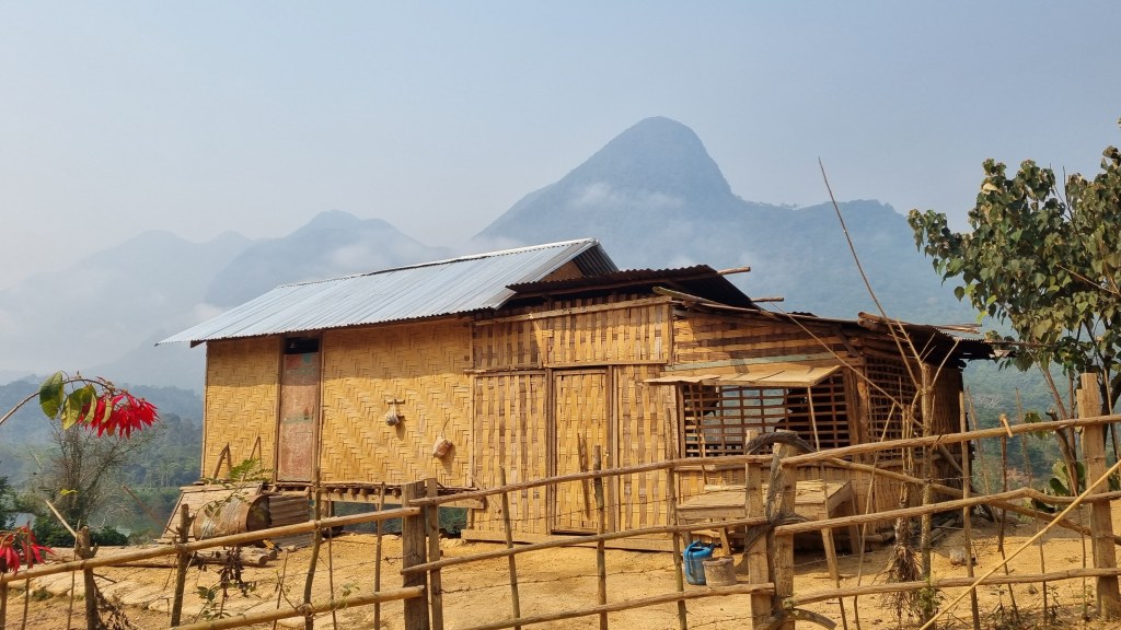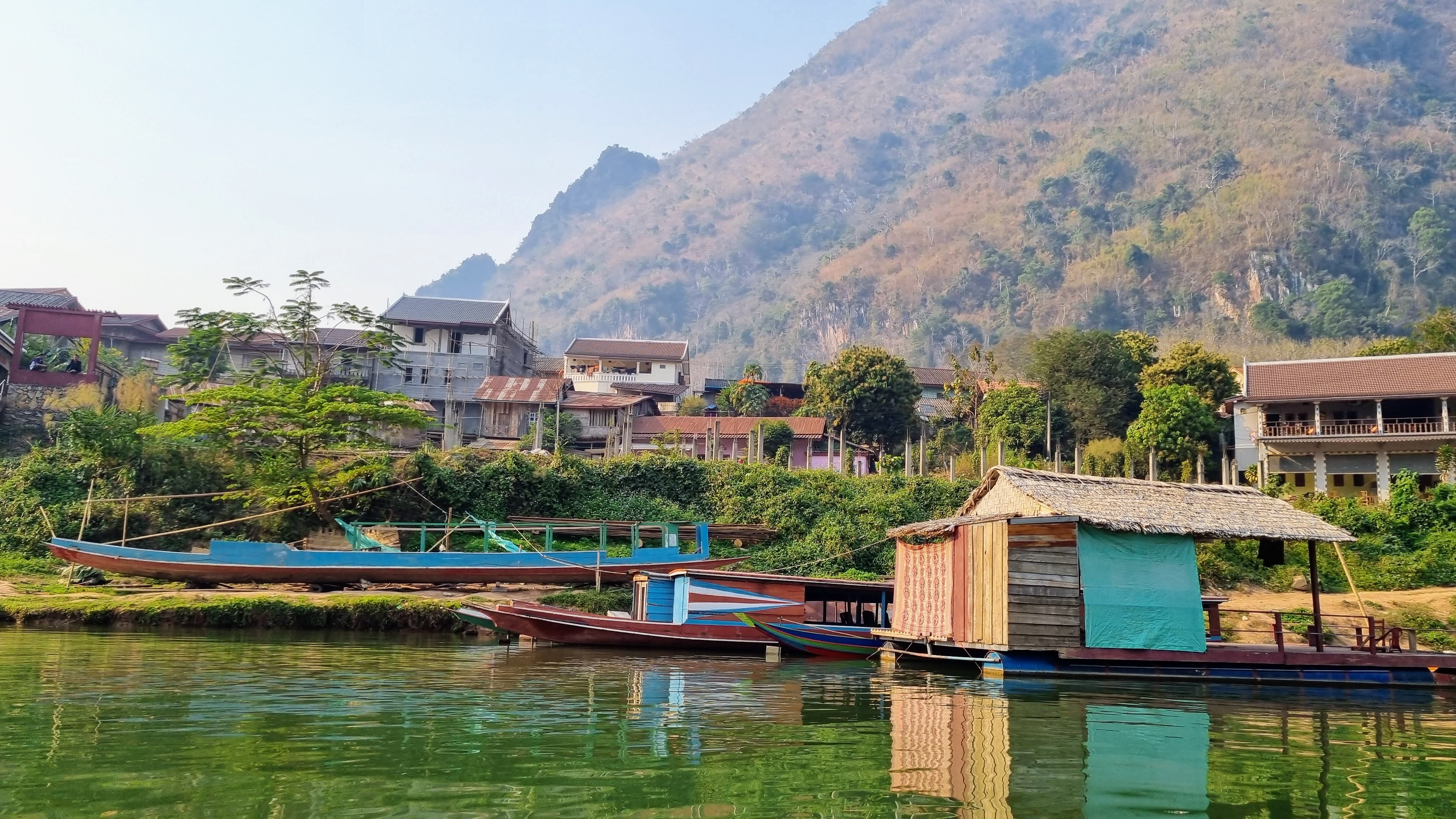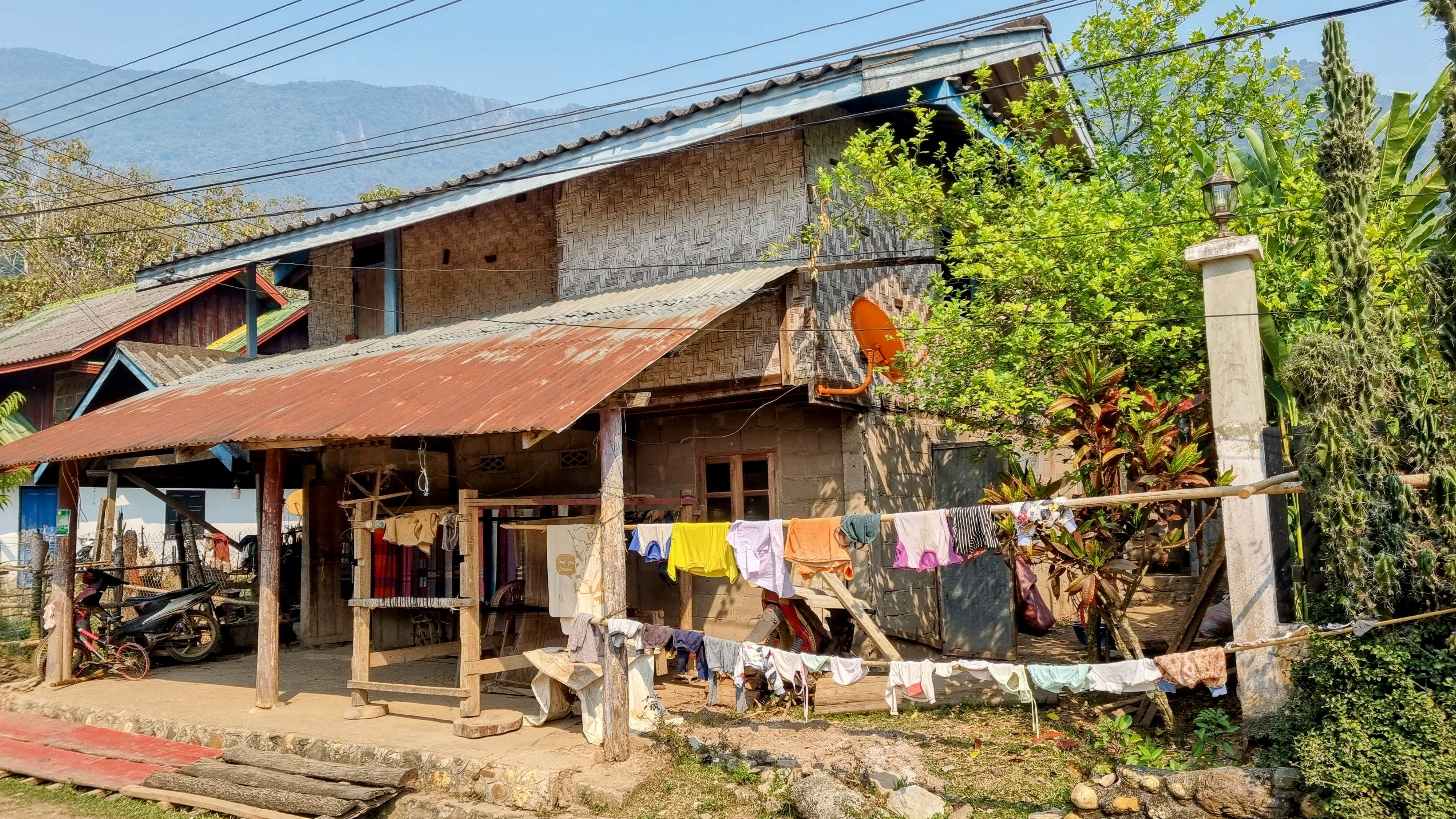 Le village de Muang Ngoi se trouve en bout de piste, dos au relief. Une artère principale en terre battue en constitue la colonne vertébrale. En y entrant en début d’après-midi, le calme et le silence règnent sur une assemblée humaine lovée dans les hamacs, sous les tonnelles des terrasses en bois, dans la noirceur tiède des habitations en bambous ou en briques.