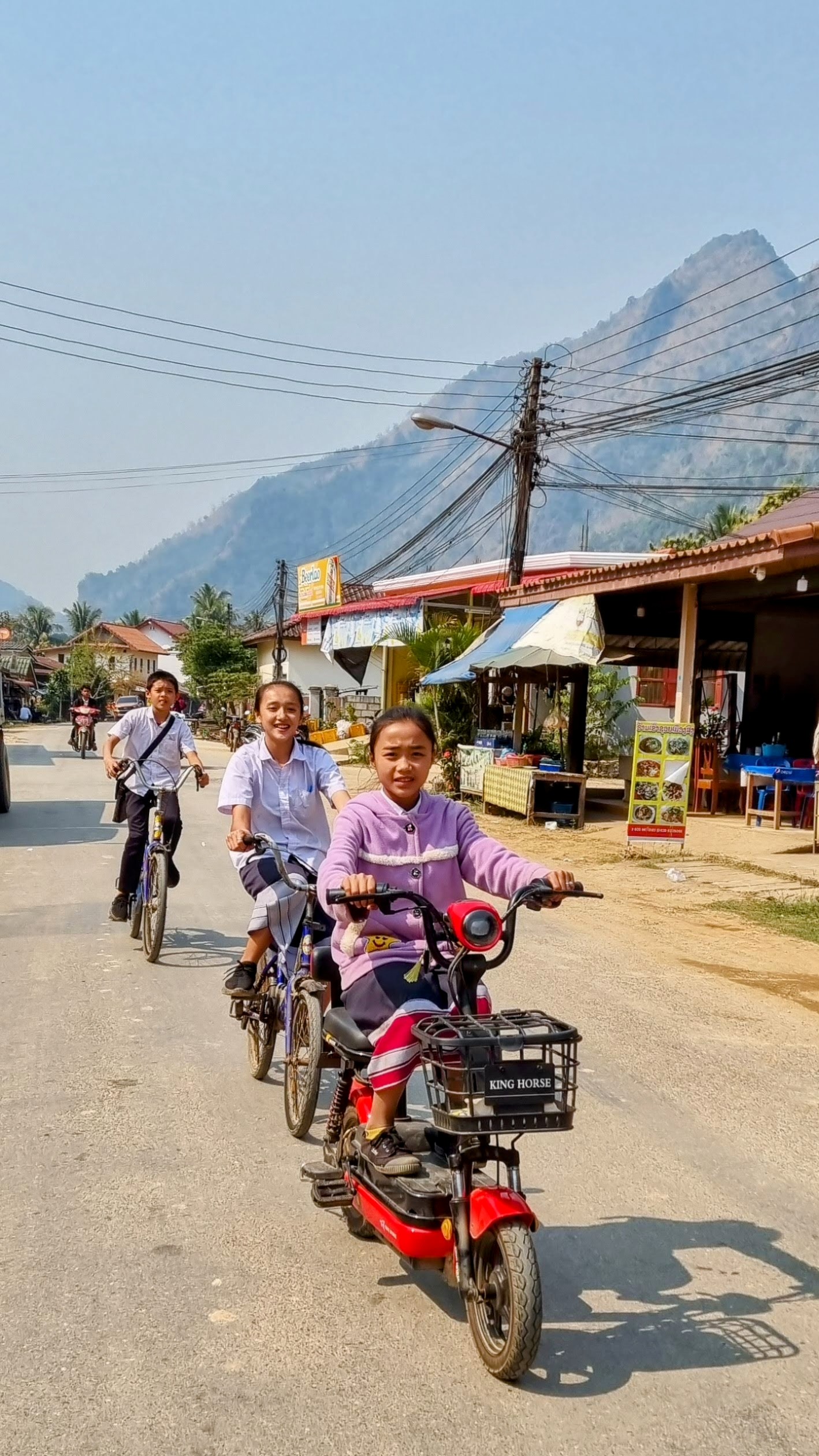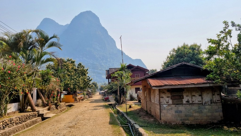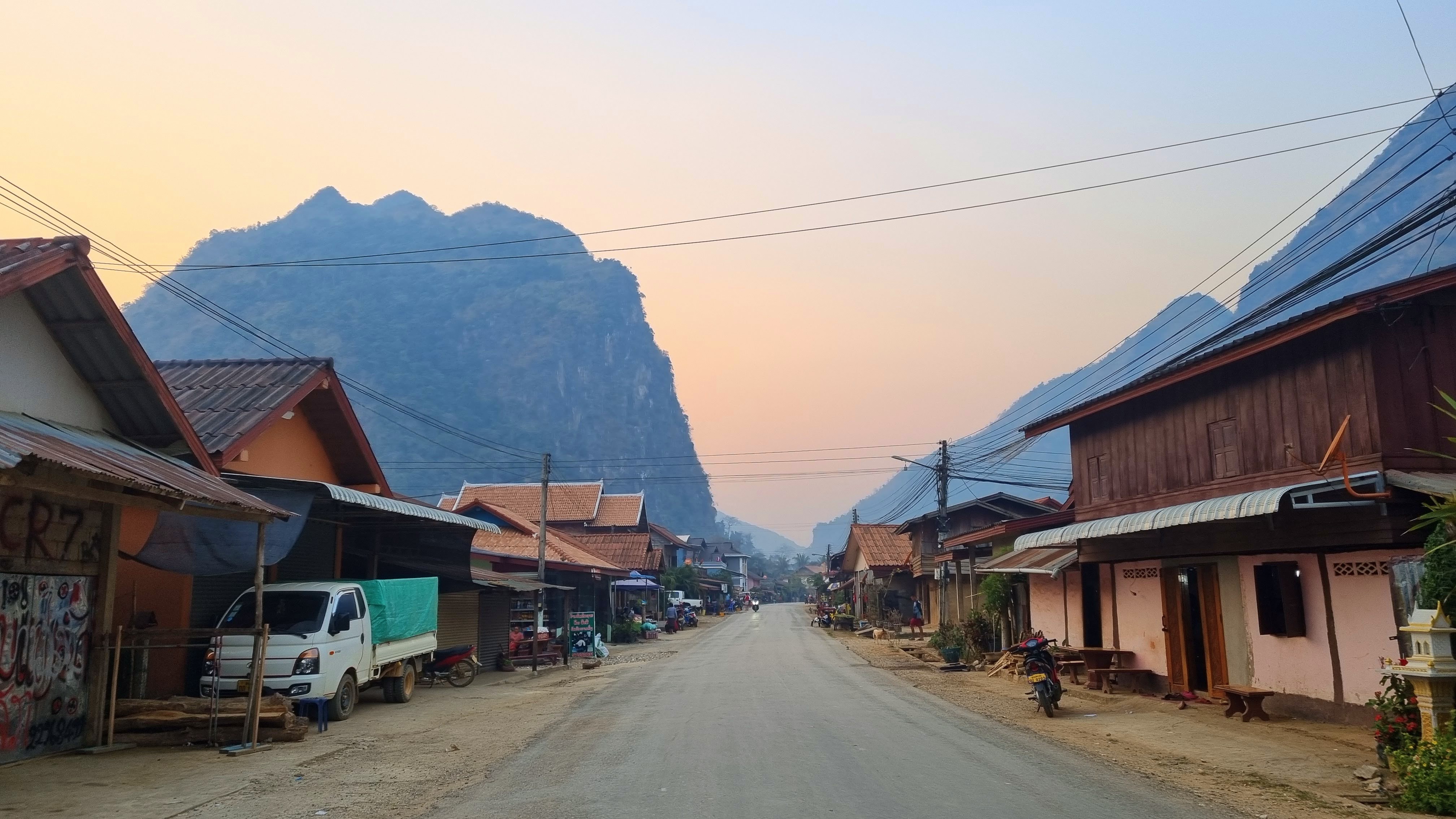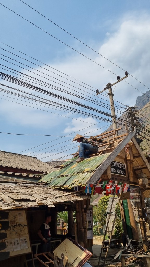 Le village de Muang Ngoi se trouve en bout de piste, dos au relief. Une artère principale en terre battue en constitue la colonne vertébrale. En y entrant en début d’après-midi, le calme et le silence règnent sur une assemblée humaine lovée dans les hamacs, sous les tonnelles des terrasses en bois, dans la noirceur tiède des habitations en bambous ou en briques.