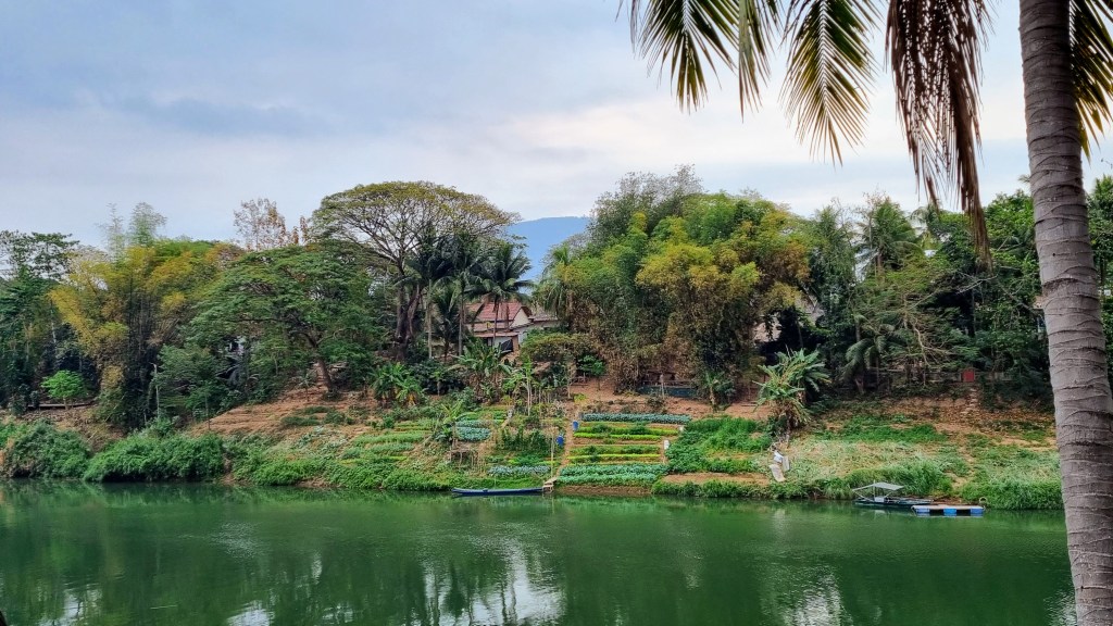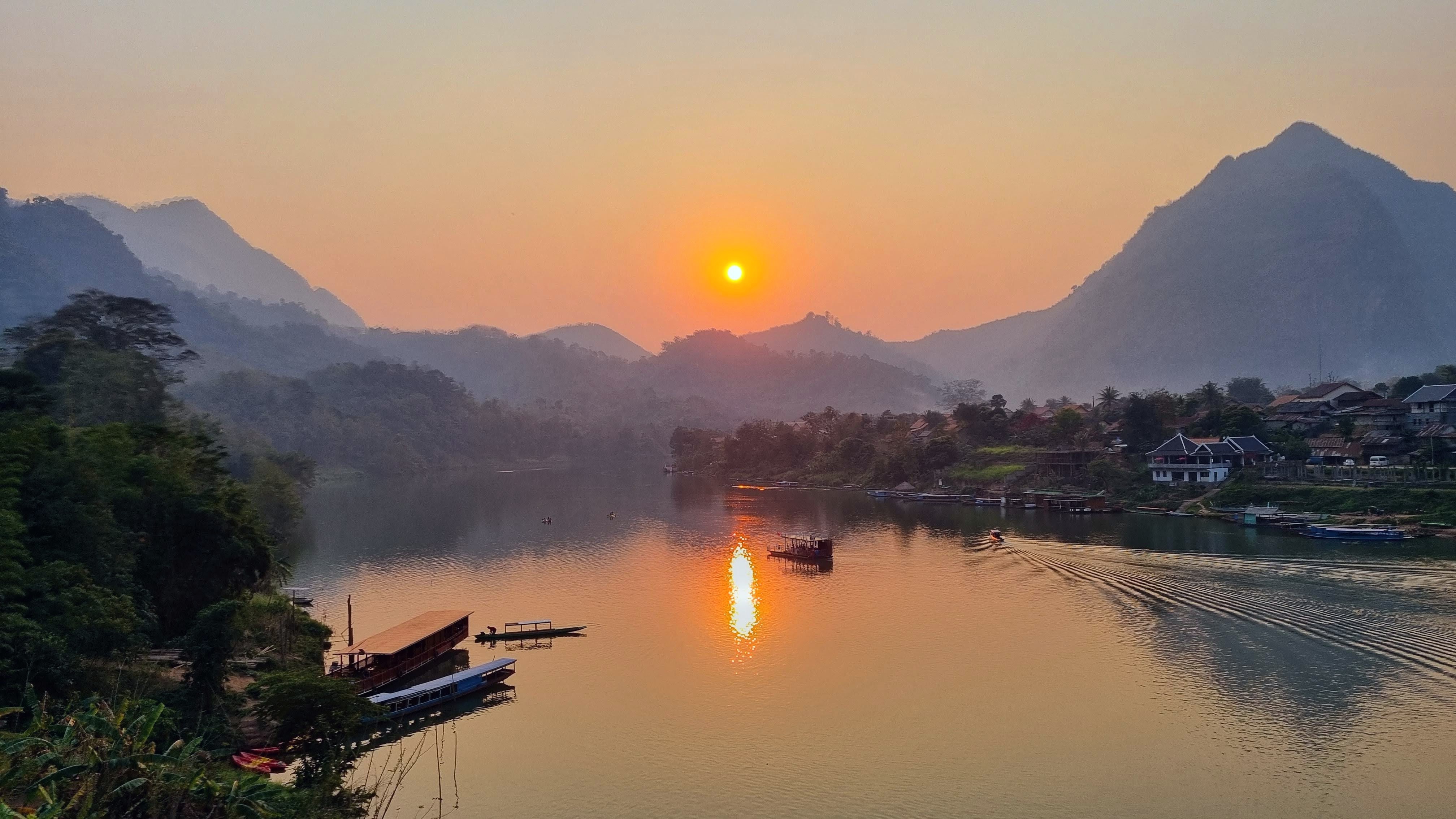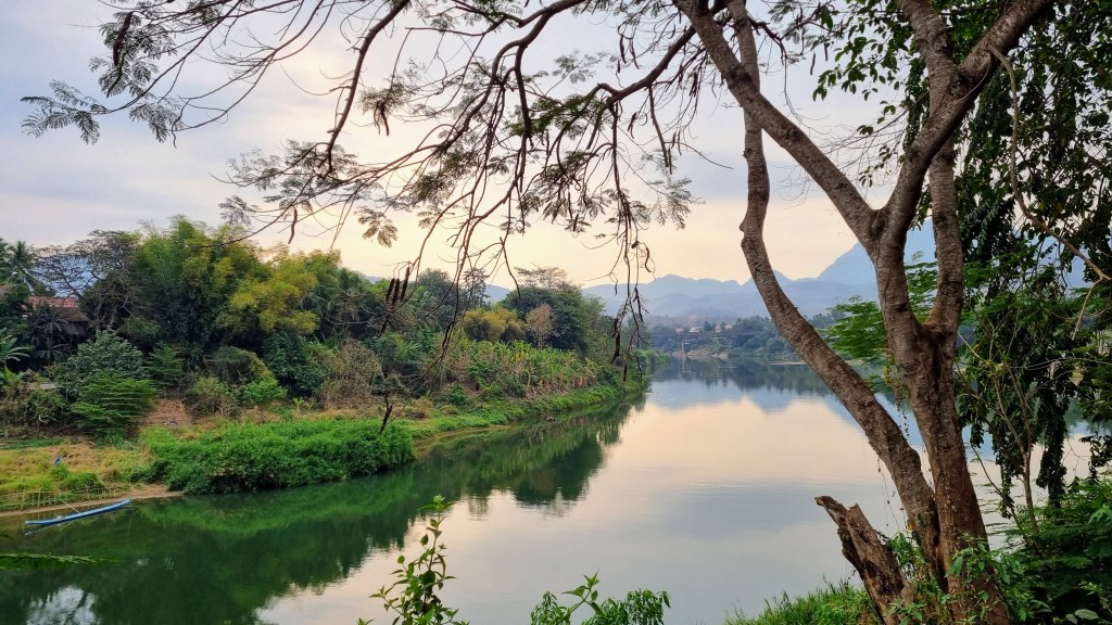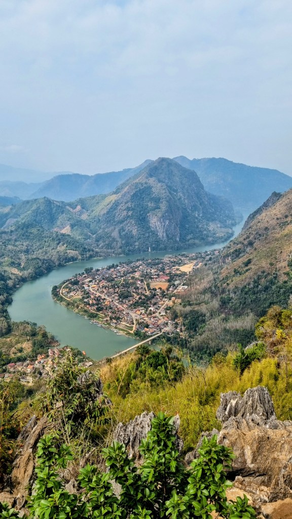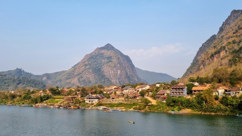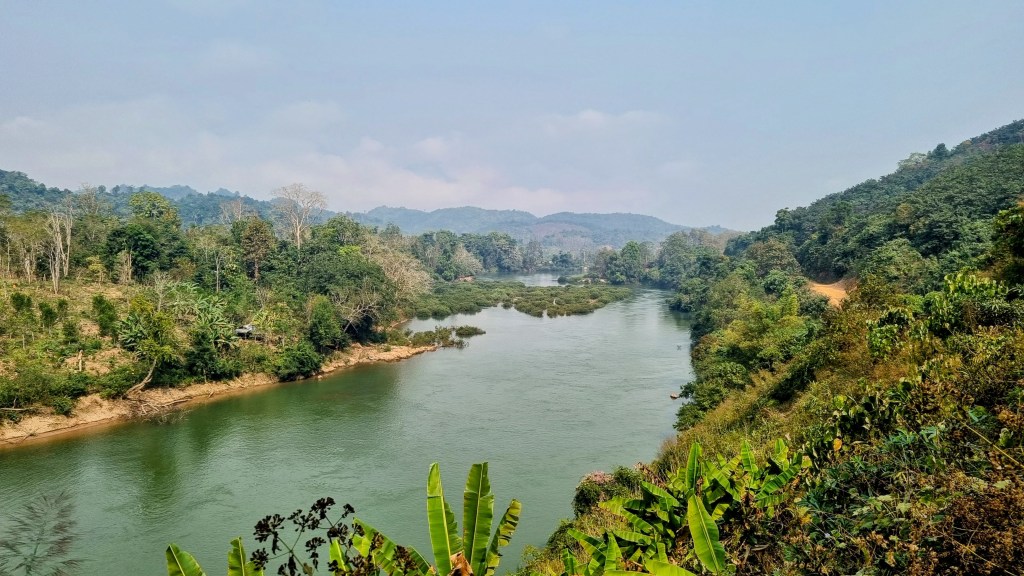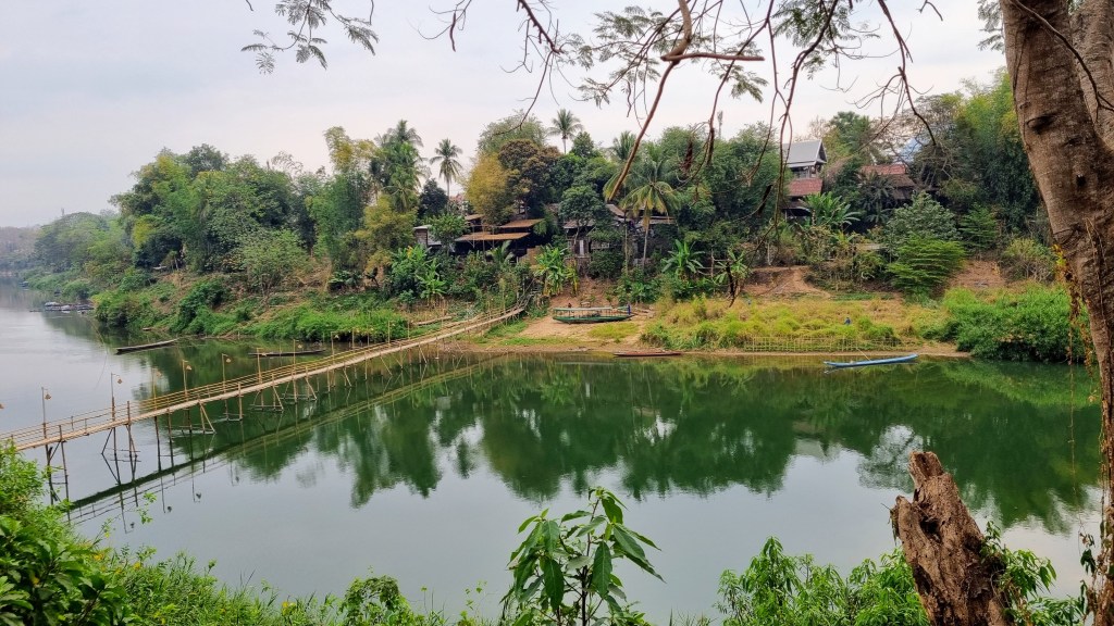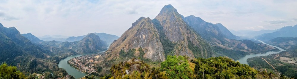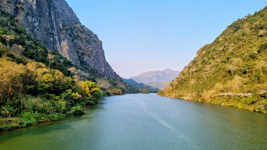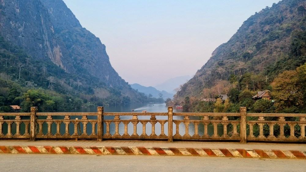 En grimpant sur les hauteurs à huit cent mètres, on peut apercevoir en contrebas l’eau dessiner une boucle appuyée et Nong khiaw s’y nicher à l’abri d’une falaise qui surplombe le bourg. Ce n’est pas une plaine, seulement une ridicule grève de sable prêtée à l’homme pour y poser quelques maisons de bois. Le pont, trait rectiligne blanc jeté entre deux rives, enjambe la rivière comme chaque matin. Quelques motos circulent tandis que très lentement le brouillard se dissipe, ôtant un drap de nuit sur une vallée qui s’éveille et s’étire. Belle paresseuse, verte et minérale.