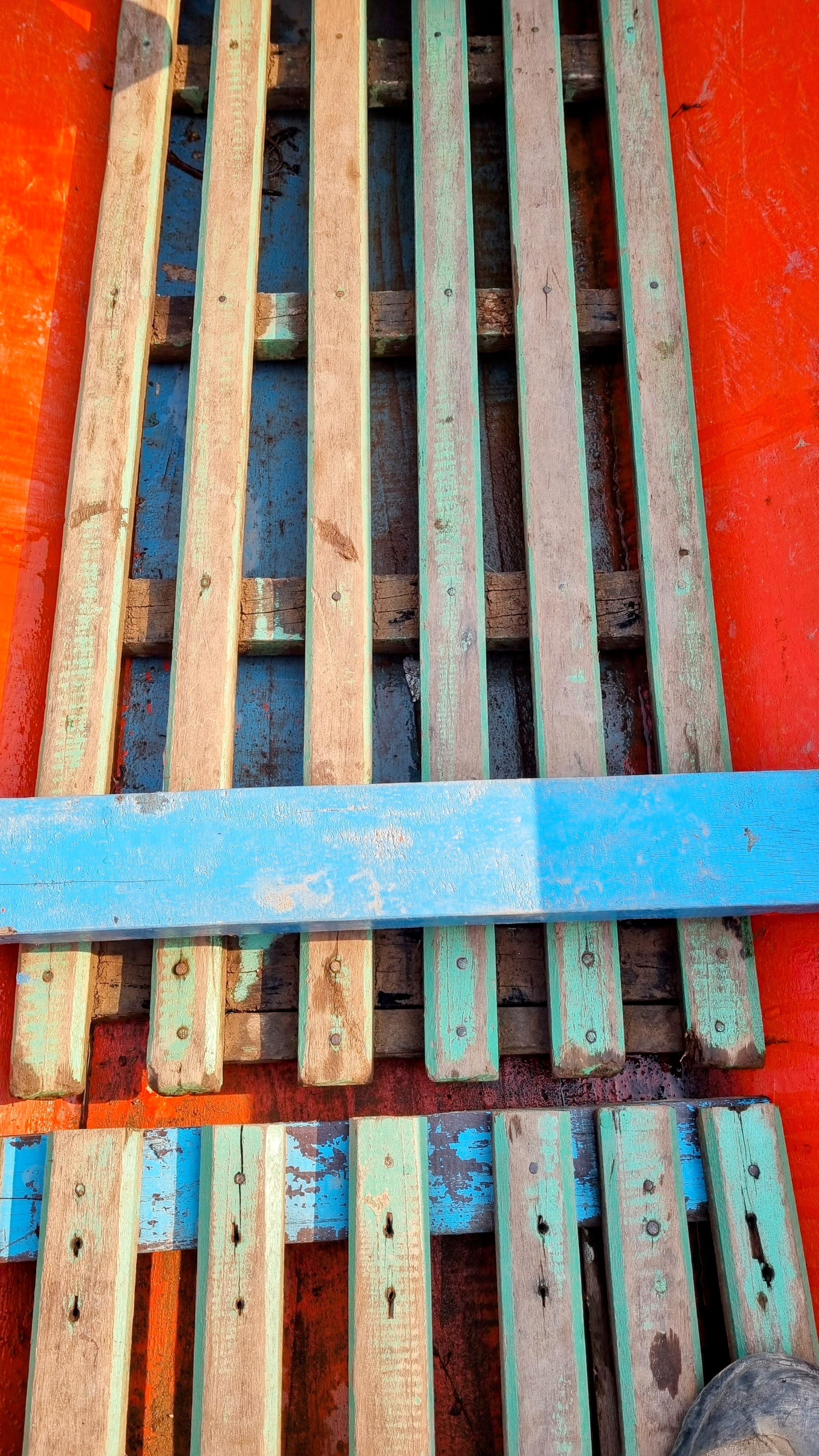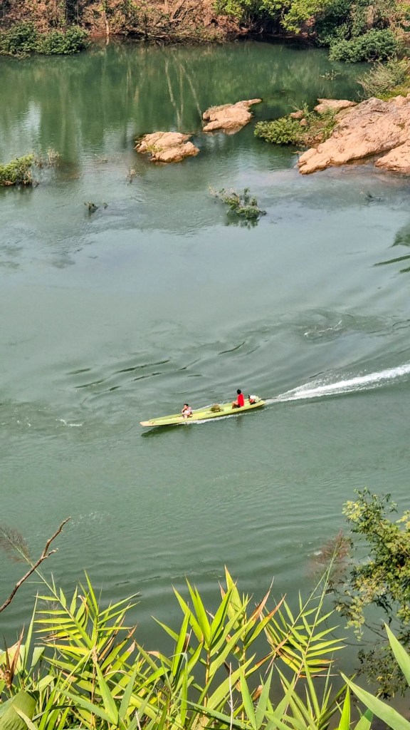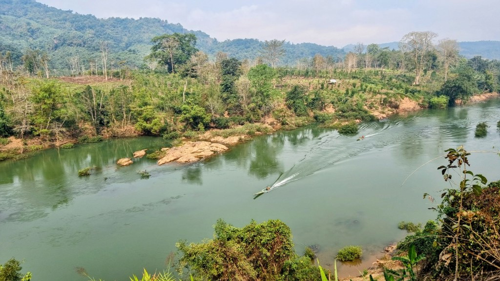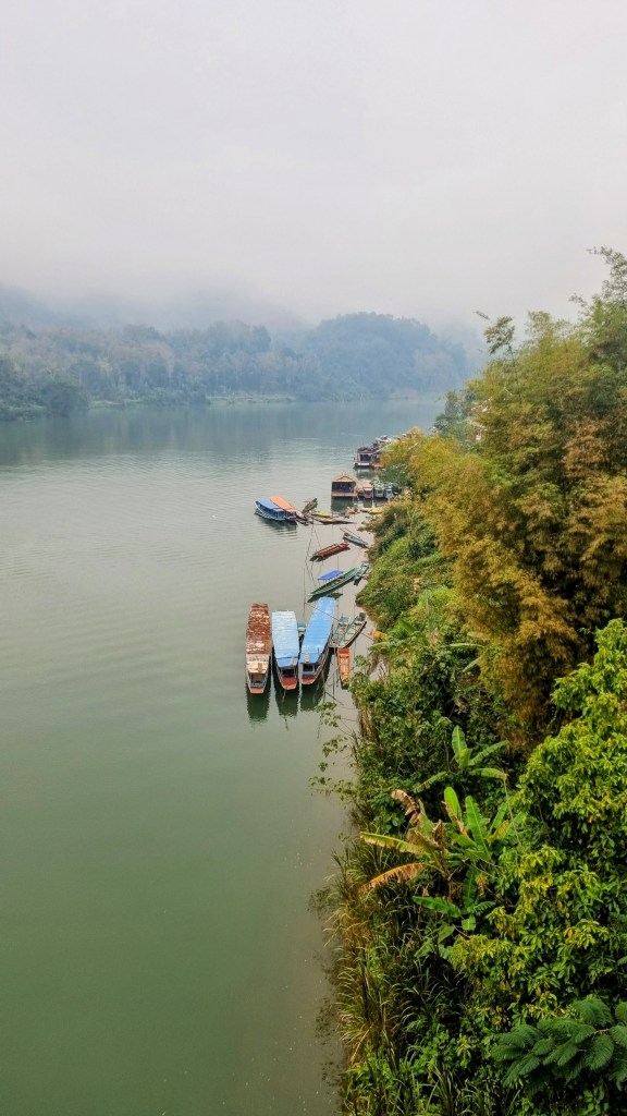 On traverse la rue d’un pas rapide en quête d’un moyen de locomotion en vue d’un éventuel retour. Il est trop tard pour rebrousser chemin à pied et nous n’avons pas rencontré sur la piste de véhicules capables de nous avancer en stop. La voie terrestre reste plutôt compromise. Nous décidons de rester sur place bien que n’ayant rien avec nous, hormis un peu d’eau et quelques billets. On a fini toutes nos bananes, et le riz aussi. Reste à dénicher dans le village un hébergement pour la nuit. En descendant sur la jetée qui mène au fleuve, nous croisons un homme qui change le cours de la journée. Il n’y a pas de bateau régulier avant demain matin, mais il nous propose les services d’un membre de sa famille pour nous convoyer jusqu’à Nong Kiaw sur une petite pirogue légère.